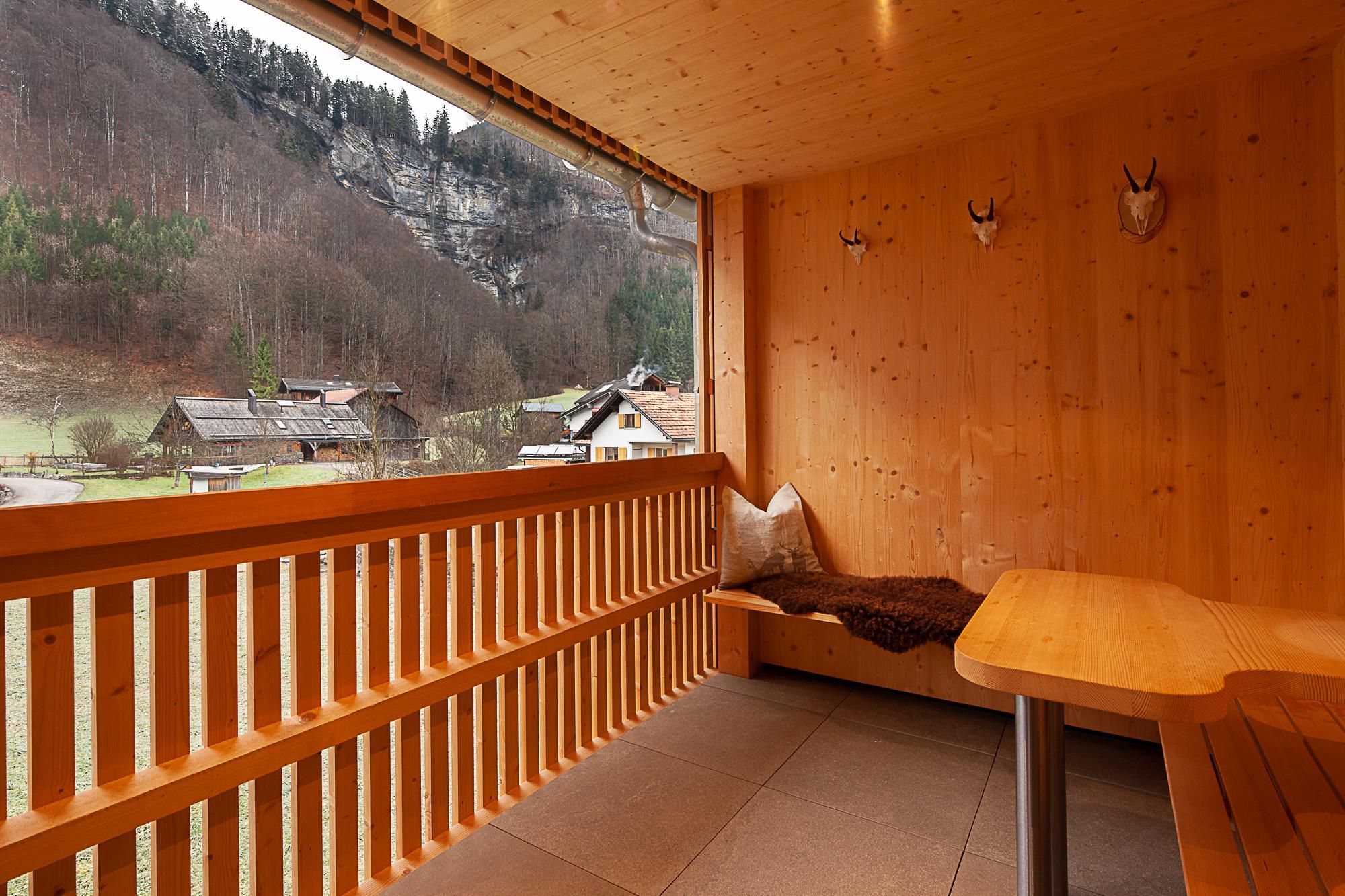 Wohnbereich mit Schlafsofa, TV und Essplatz mit Bergblick. Die Küche ist modern, der Schlafbereich flexibel (Doppel- oder Einzelbetten). Abends lädt der überdachte Außenbereich zum Entspannen ein – perfekt für einen Drink in der Abendsonne. Jetzt buchen und die Kraft der Berge spüren!