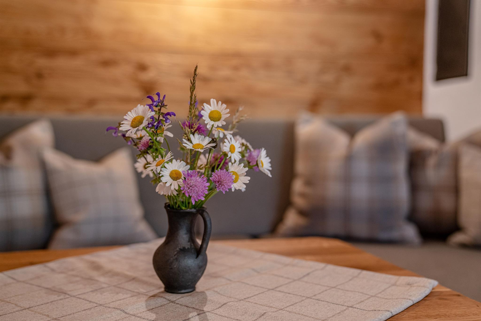 Warme Farben, weich kuschelige Stoffe, das Knistern des Kachelofens sowie natürliche Materialien wie Altholz, Naturstein und Loden aus unserer Heimat machen aus den Räumen Rückzugsorte mit Charme und bereiten unvergessliche Glücksmomente in den Bergen.