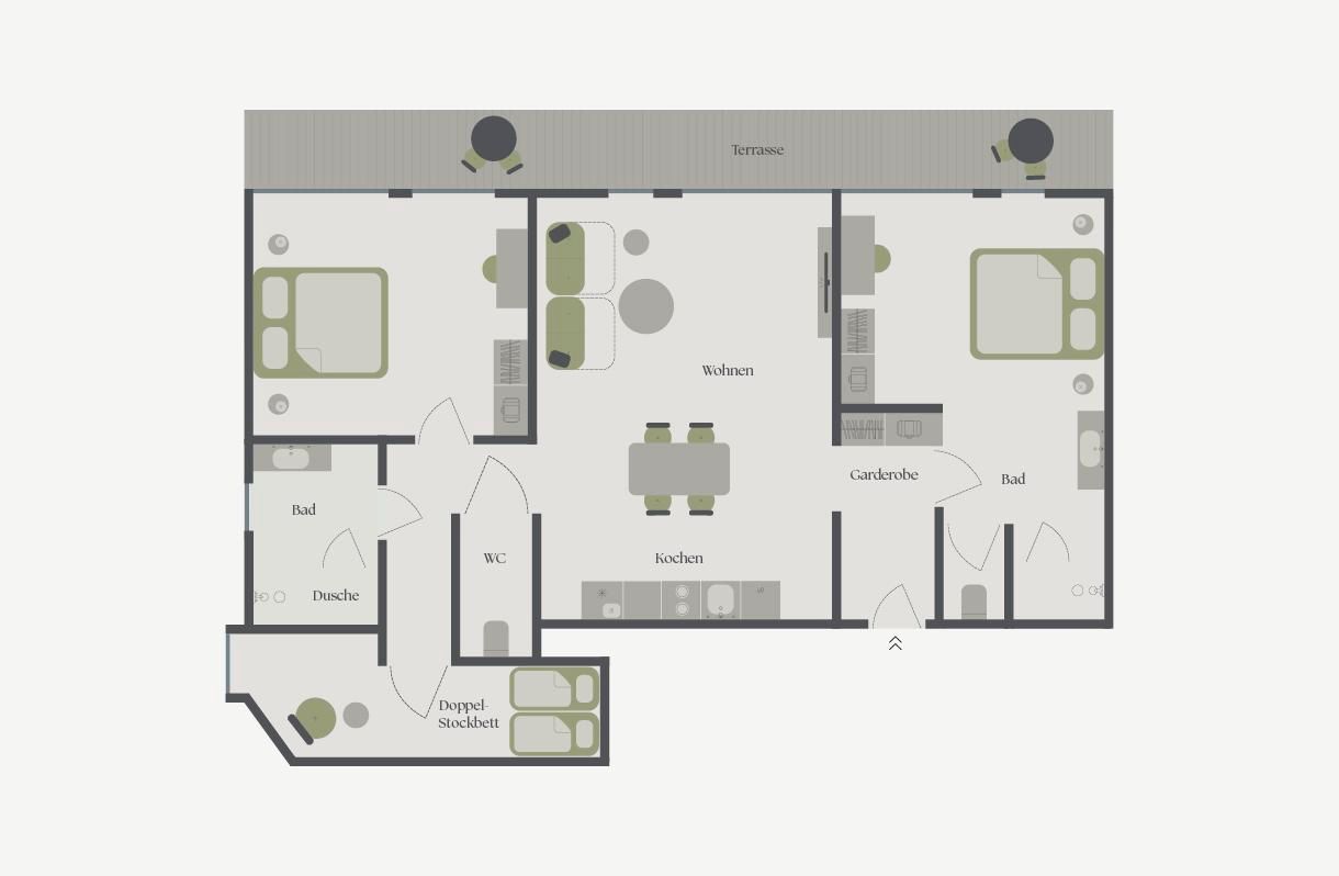 Das ideale Apartment mit 2 getrennten Badezimmern und großzügigem Wohnraum inkl. Küche. Plus extra Kinderzimmer mit Doppelstockbett.