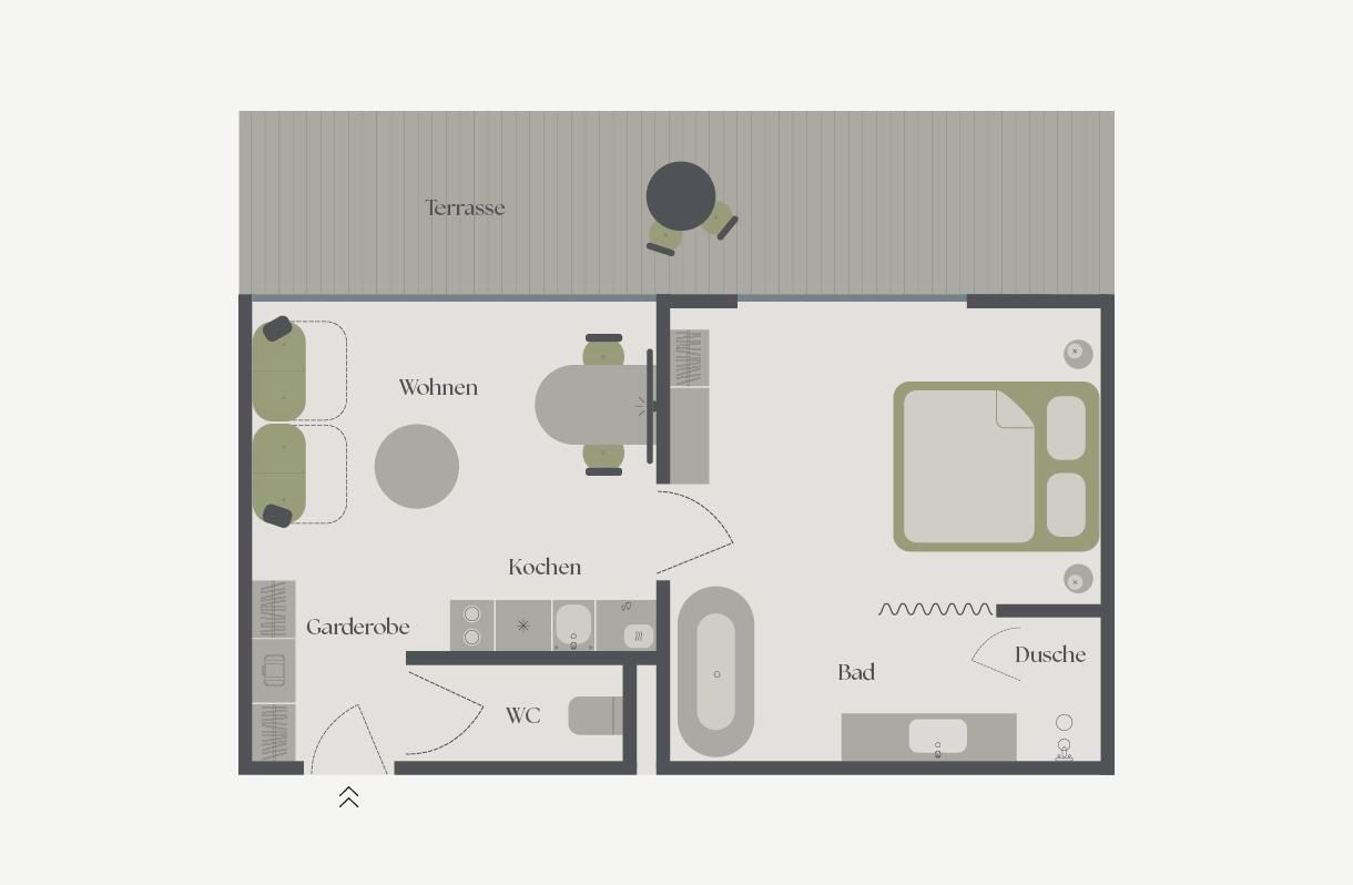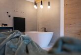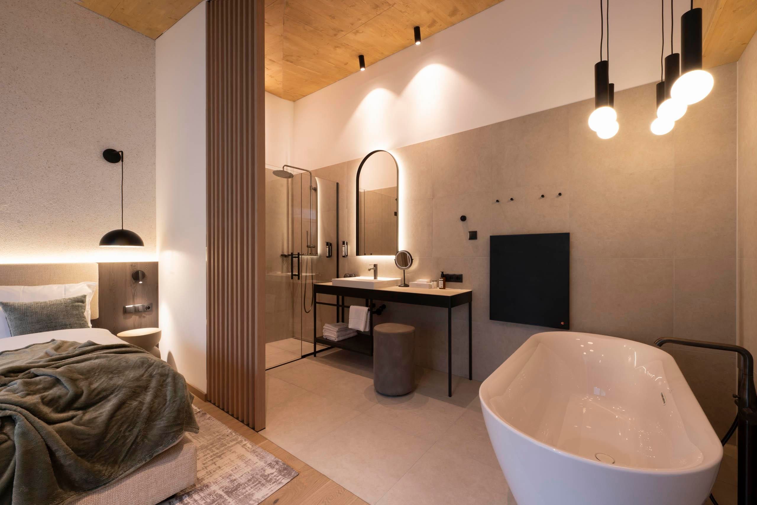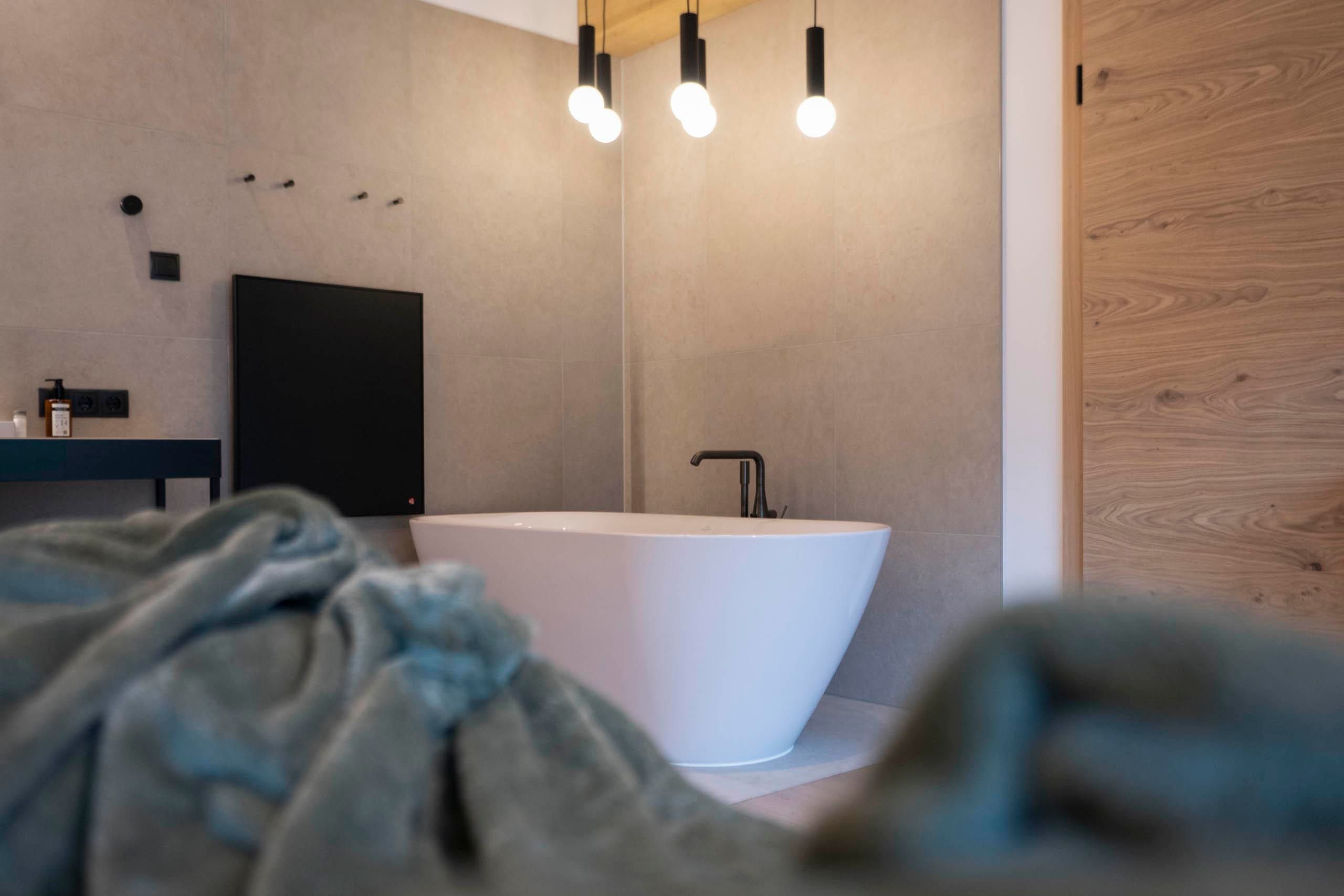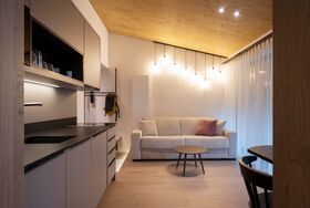 Design Chalet-Feeling im Dachgeschoss, Wohnraum und Schlafraum getrennt, großer Balkon mit traumhaftem Ausblick auf die Stubaier Berge.