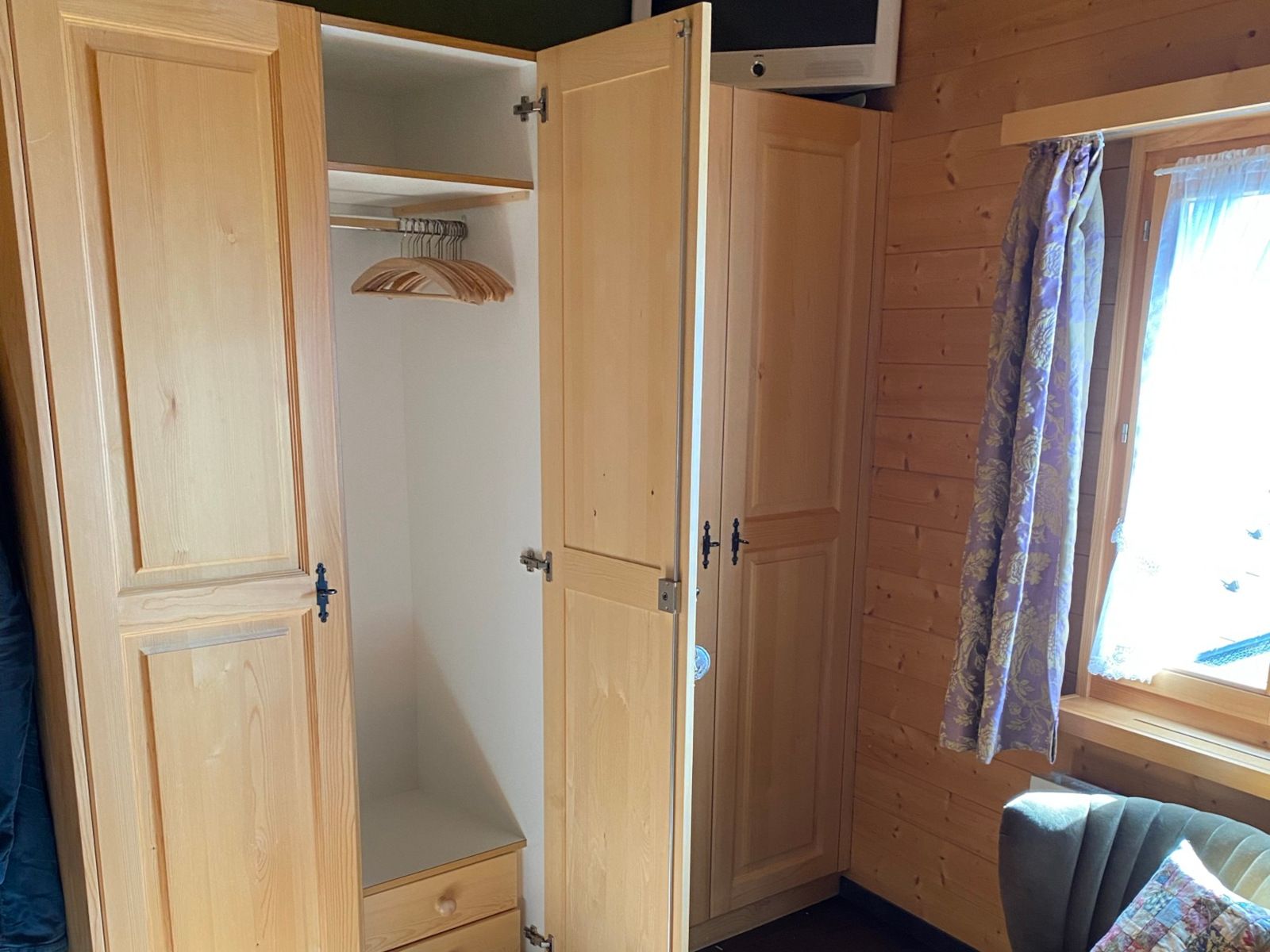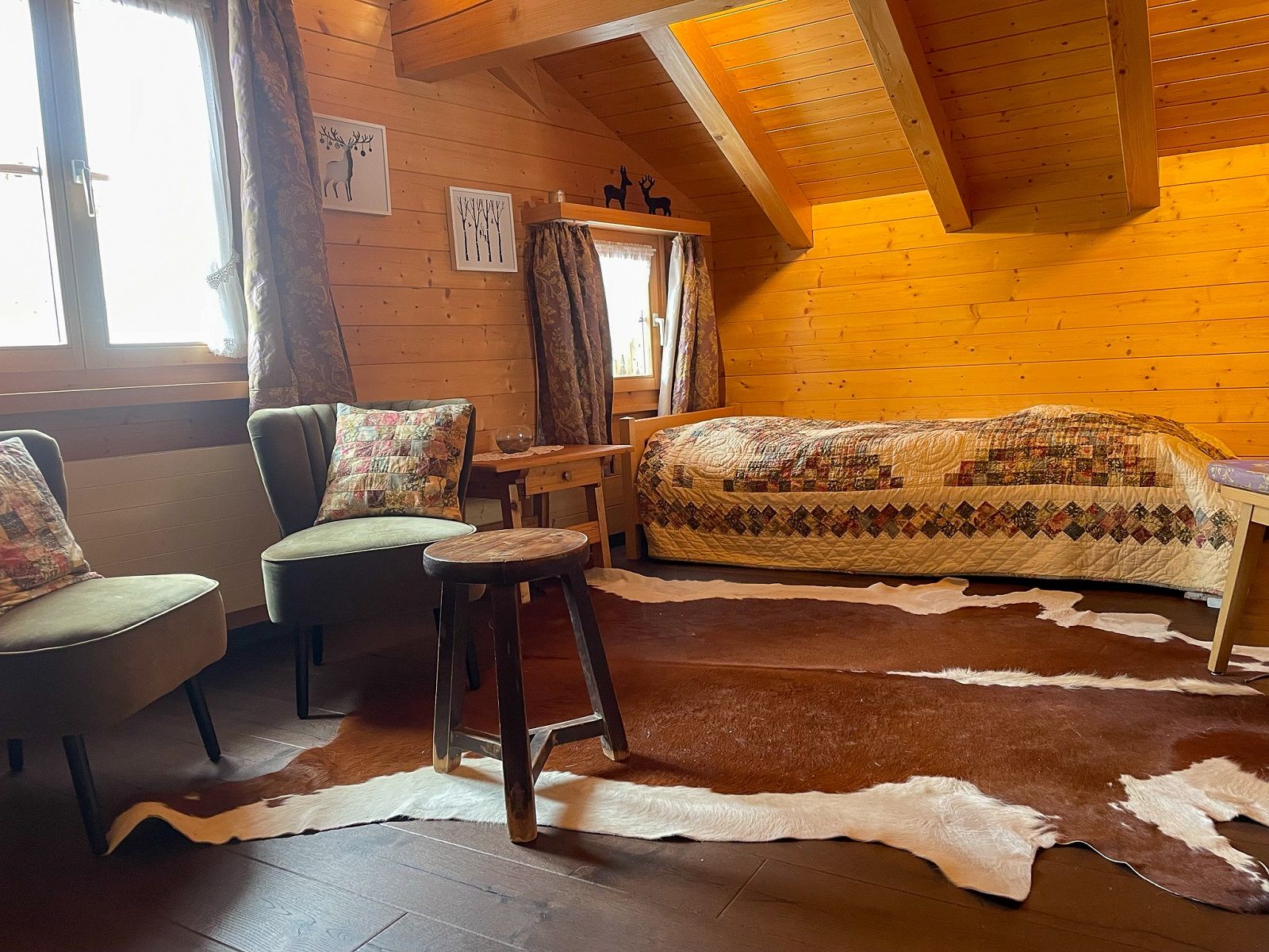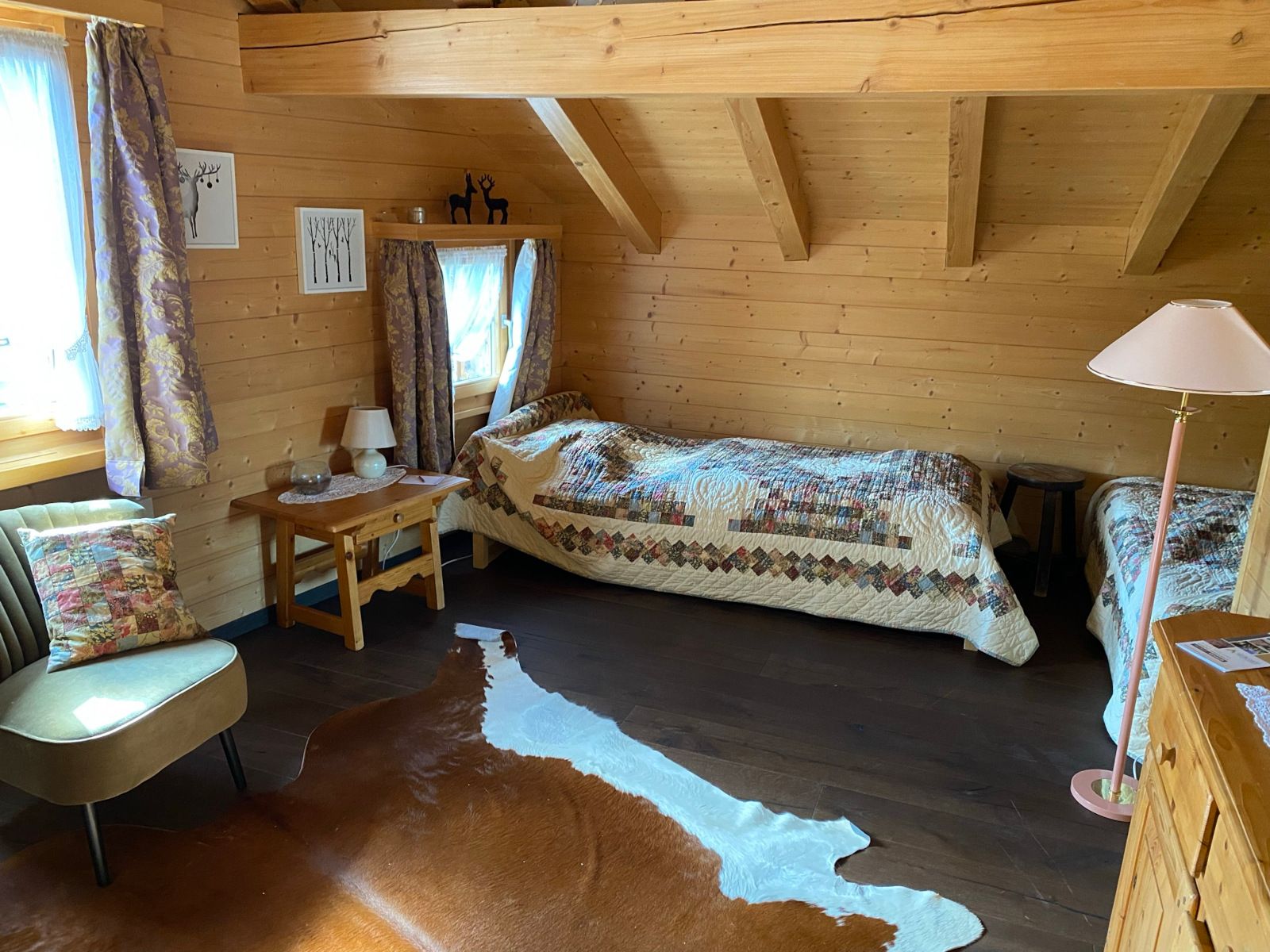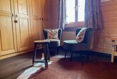 2 Schlafzimmer: Ein Geräumiges Schlafzimmer mit grossem Doppelbett sowie ein zweites Schlafzimmer mit einem Französischen und einem Einzelbett. Beide Zimmer sind mit schränken und Nachttischen ausgestattet. Das Schlafzimmer im Oberen Stock hat zusätzlich eine gemütliche Lesecke mit einer exklusiven Auswahl an Lesestoff.