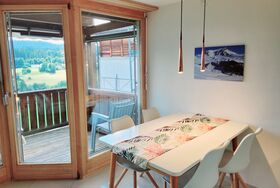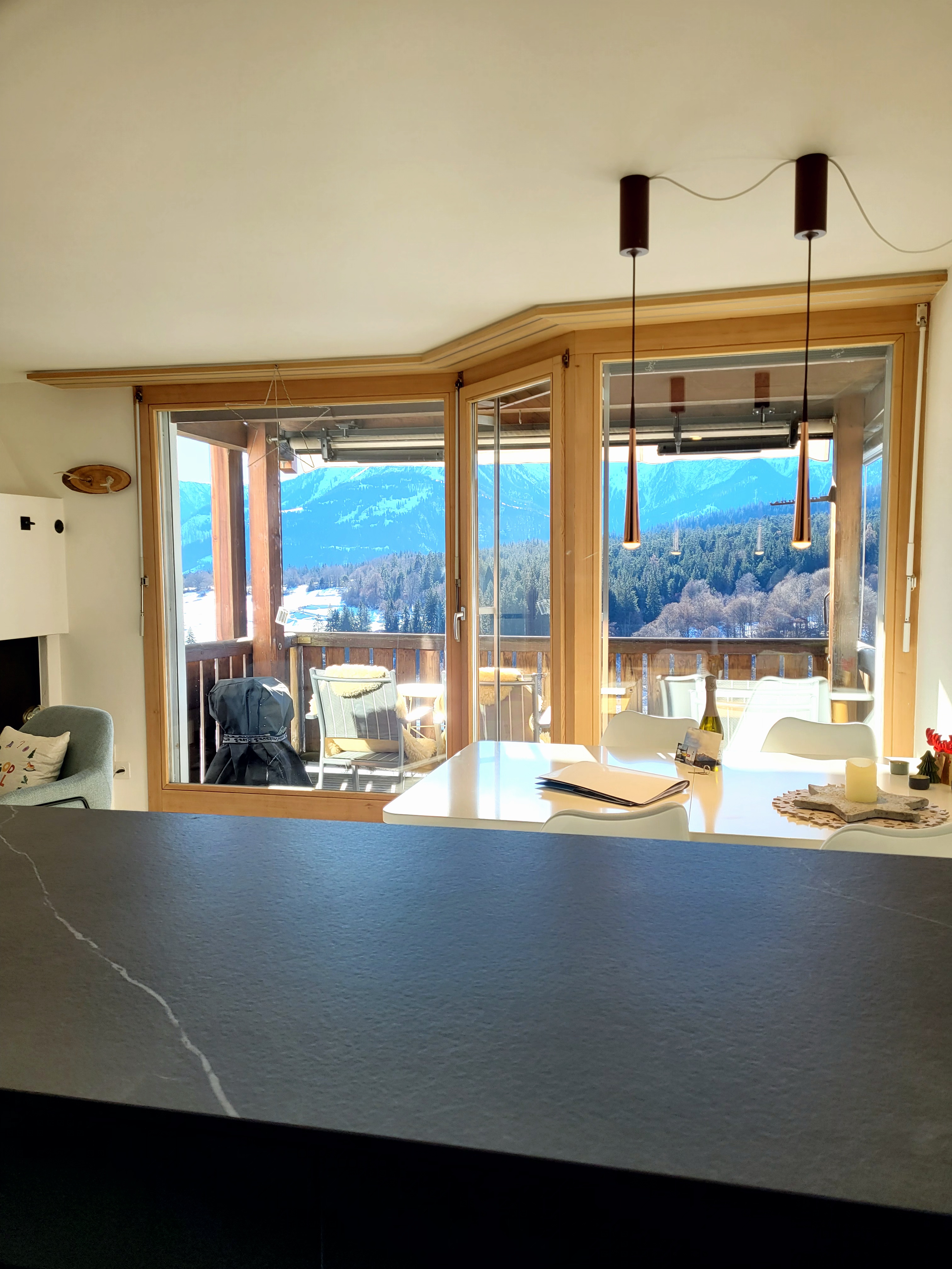 Wunderschöne und ruhig gelegene 3.5 Zimmerwohnung (ca. 60 m2) mit Wohlfühlgarantie und Weitblick! Die Wohnung wurde in 2023 (Bad) renoviert, frisch gestrichen und komplett neu möbliert.Im Winter 2024 wurde die Küche erneuert und mit Geräten der Marke VZug ausgestattet. Aus dem Kinderzimmer, dem Wohnzimmer und vom Balkon haben Sie eine freie, unverbaute Bergsicht mit unvergesslichem Blick auf die Signina-Bergkette, sowie auf Flims-Dorf. 3,5 Zimmer: 2 Schlafzimmer mit 1 Boxspring-Doppelbett (1.80 m x 2m) und 2 Einzelbetten je 90cm x 2m, 1 Bad mit WC und Bade/Duschkombination; Waschmaschine / Trockner im Haus (gebührenpflichtig), Skiraum, TV, Wifi (kostenfrei). Die Fenster der beiden Schlafzimmer sowie der Küche sind mit Mückennetzen ausgestattet. Die Küche ist komplett ausgestattet und verfügt über neue Markenelektrogeräte. Der Parkplatz Nr. 21 gehört exklusiv zur Wohnung und befindet sich oberhalb vom Haus - über eine Treppe zu erreichen. Er ist im Mietpreis inklusive. Da kein offizieller Veloraum vorhanden ist, haben wir im Skiraum 2 Velohänger installiert. die Wohnung wird nach Covid-19-Leitfaden der Flims Laax Falera Management AG gelüftet, gereinigt und desinfiziert *