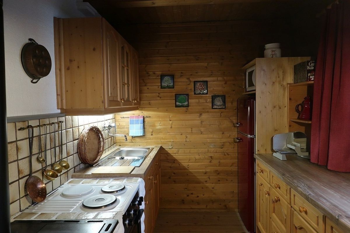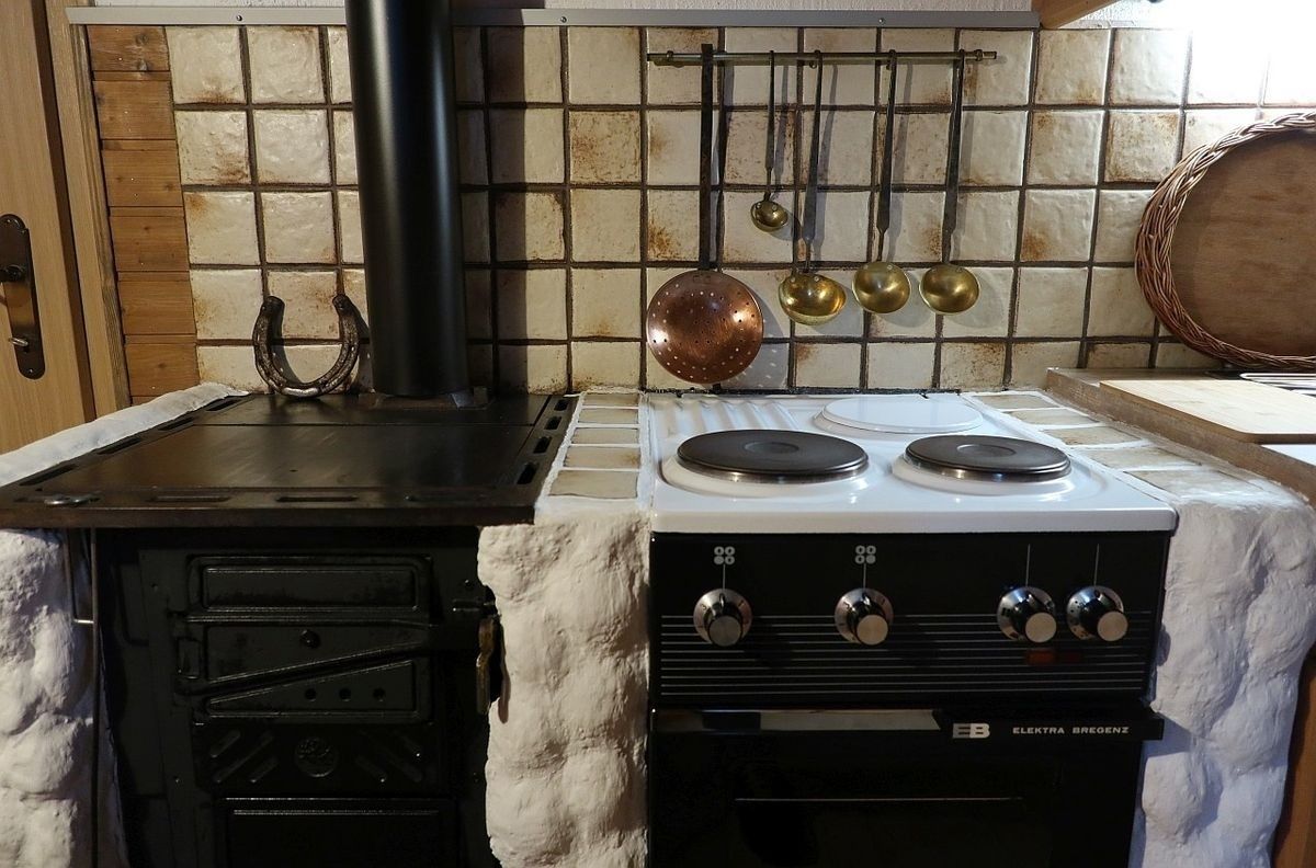 Küche mit Elektroherd & Backofen, Kühlschrank, Geschirrspüler, Mikrowelle, Kaffeemaschine, Toaster, Holzherd & Aufschnittmaschine