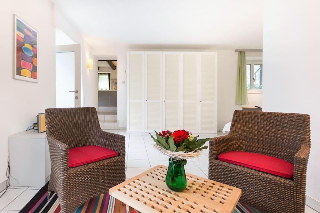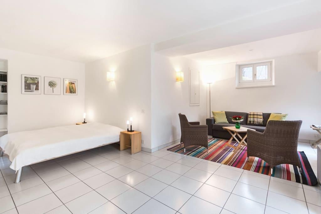 Innenausstattung: Das Studio ist mit neuesten, modernen Möbeln ausgestattet und bietet einen separaten Hauseingang. Eine separate Küche mit Esstisch für 4 Personen, Geschirrspüler, Espressomaschine sowie ein Herd mit Backofen lädt zum gemeinsamen Kochen und Verweilen ein. Der Wohnbereich mit Sat-TV, DVD- und CD-Player sowie einer kleinen Büchersammlung sorgt für gemütliche Stunden. Das gesamte Studio ist mit hellem Keramikboden und Bodenheizung ausgestattet, was eine angenehme Atmosphäre schafft. Neben einem Doppelbett steht auch ein Schlafsofa zur Verfügung, das sich zu einem vollwertigen Doppelbett umfunktionieren lässt.