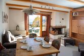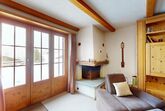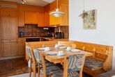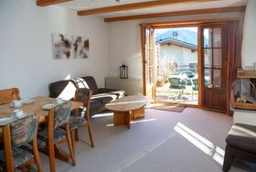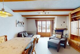 Die Wohnung bietet Platz für bis zu sechs Personen und eignet sich perfekt für Familien oder kleine Gruppen. Der offene Wohn- und Essbereich mit rustikaler Holzküche und gemütlichem Cheminée schafft eine warme, alpine Atmosphäre.