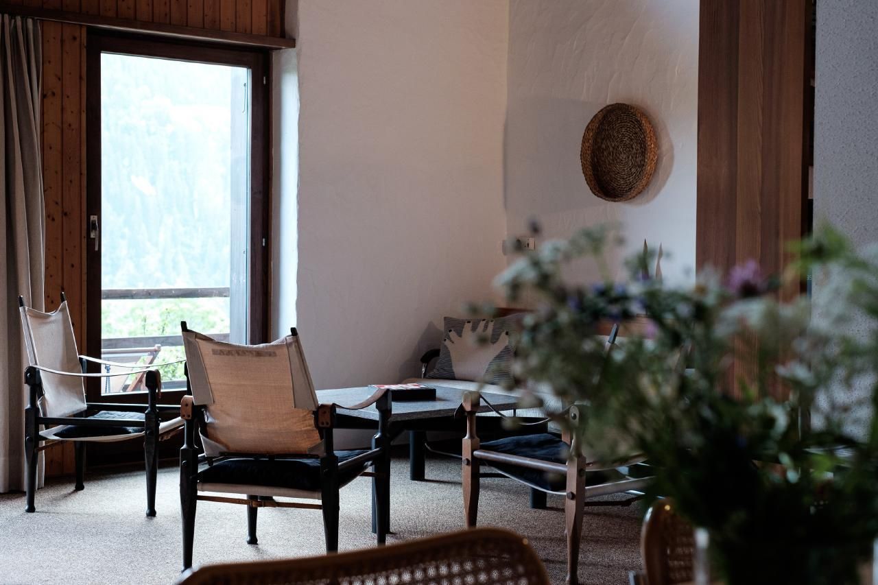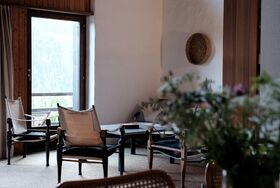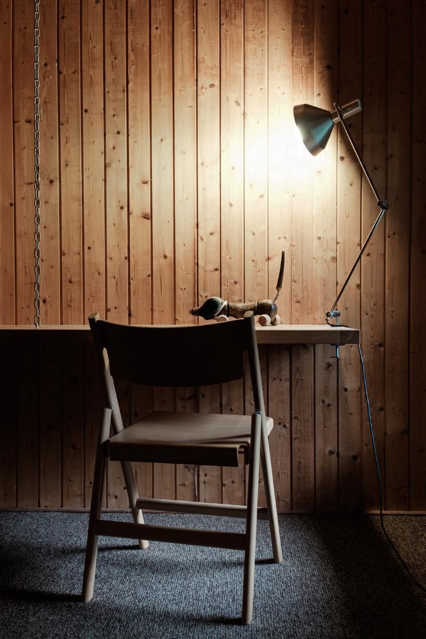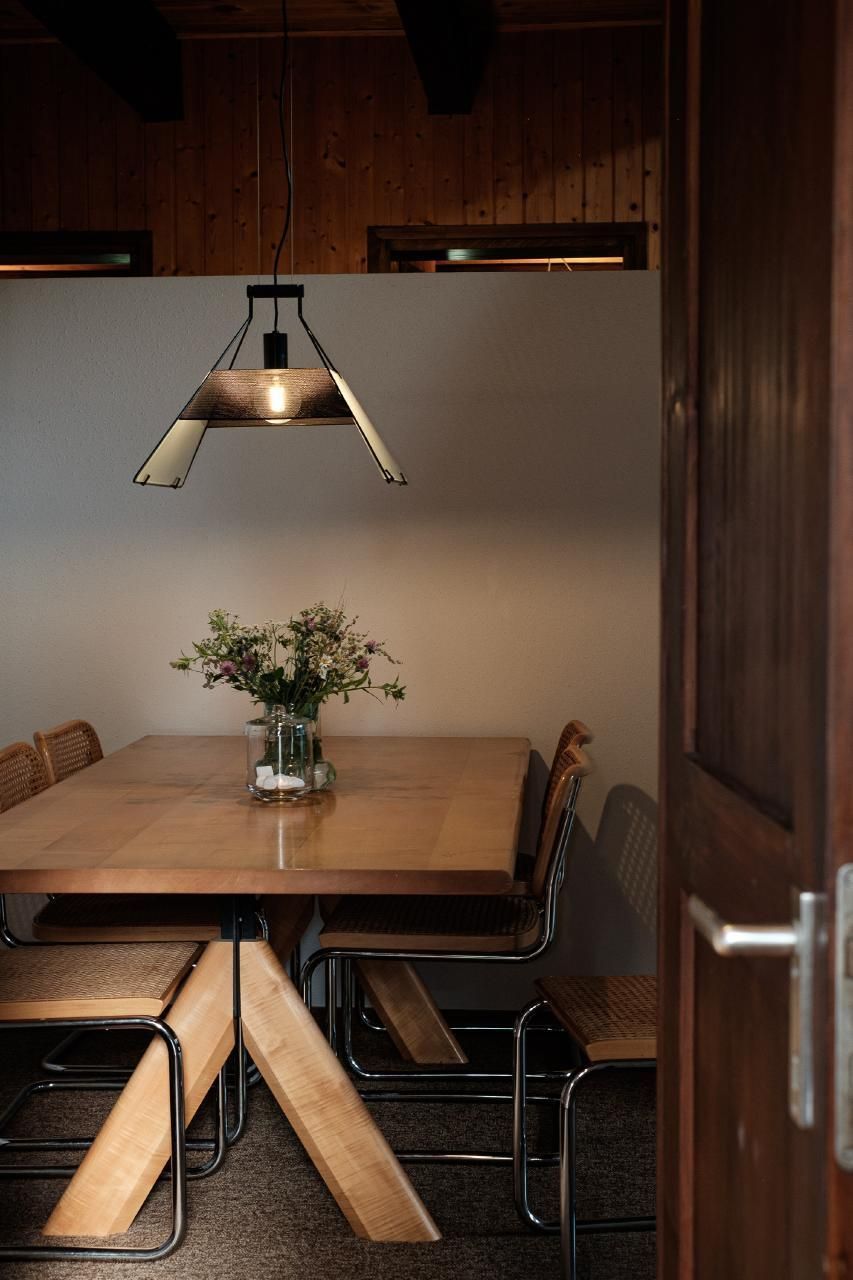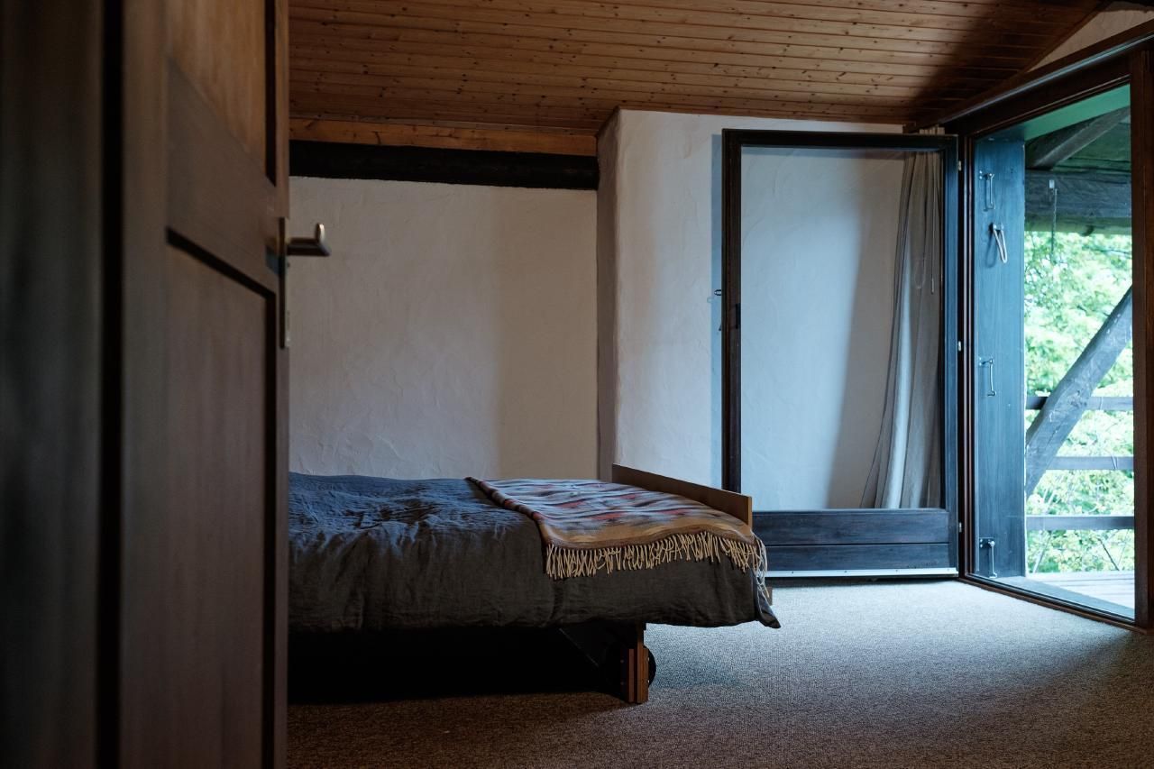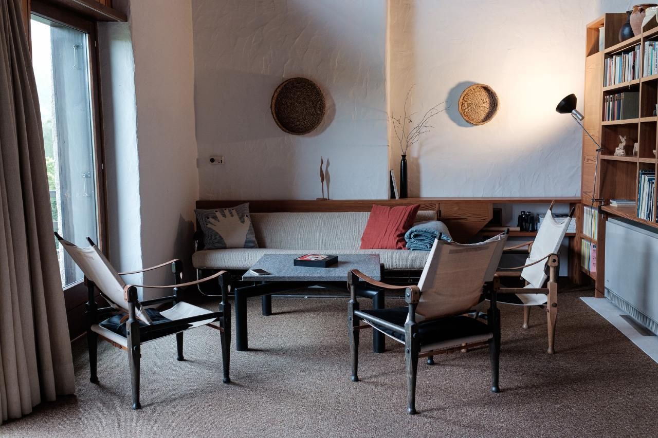 Das Haus hat drei Schlafzimmer: Ein Zimmer mit Doppelbett, ein Zimmer mit zwei Einzelbetten und ein Zimmer mit einem Etagenbett (geeignet für Kinder). Auf derselben Ebene befinden sich Küche und Bad sowie ein schönes, helles Wohnzimmer mit einem freistehenden Kamin. Eine Galerie dient als Rückzugsort, wo es sich gut Arbeiten lässt oder wo sich Kinder ausbreiten können. Im Untergeschoss hat es eine Sauna und einen Kaltwasser-Zuber, um sich nach dem Schwitzen abzukühlen. Der Aussenbereich besteht aus einem grossen, gedeckten Balkon und viel Grün mit verschiedenen Sitzgelegenheiten.