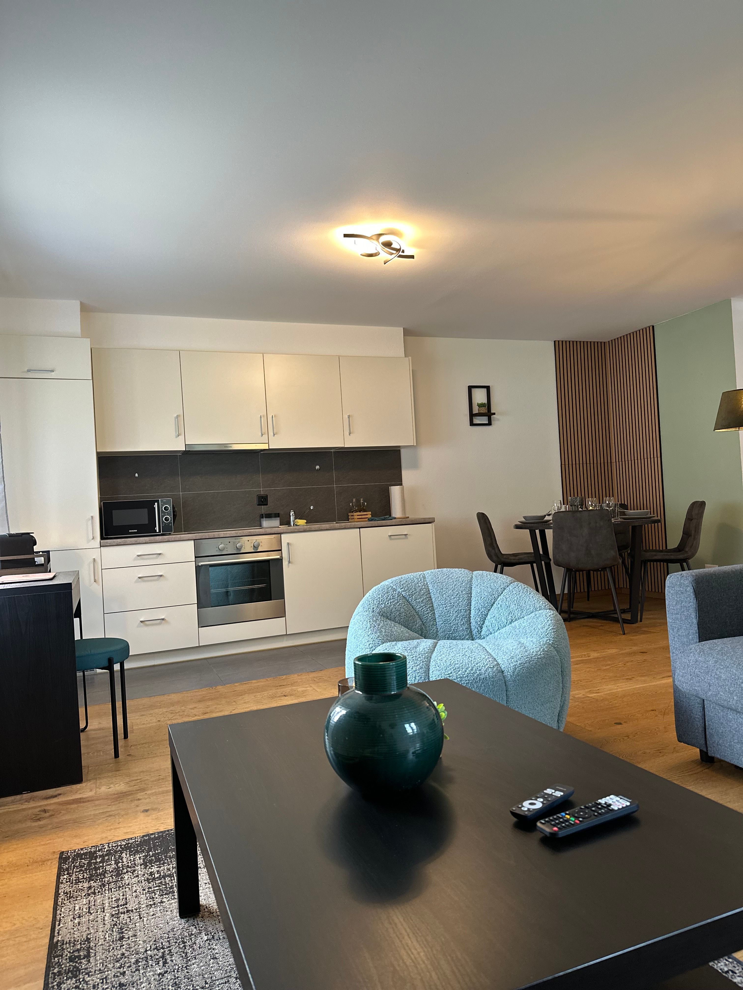 Im Inneren erwartet Sie ein gemütliches Ambiente mit einem Wohnzimmer, das über ein ausklappbares Schlafsofa mit hochwertiger Matratze verfügt, was einen erholsamen Schlaf garantiert. Die Ferienwohnung umfasst zudem ein Schlafzimmer und ein Badezimmer mit Dusche, sodass bis zu 4 Gäste komfortabel übernachten können. Eine modern ausgestattete Küche mit Cerankochfeld, Kapsel-Kaffeemaschine, Spülmaschine und Wasserkocher lässt keine Wünsche offen. Für Ihren Komfort sind Handtücher, Bettwäsche, Duschgel sowie Kaffee, Tee, Gewürze, Salz, Essig und Öl inklusive.