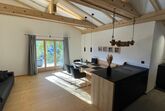 Der grosszügige Wohnraum mit giebelhoher Decke und offener Küche schafft ein helles, luftiges Wohngefühl. Auf der gemütlichen Eckbank oder dem bequemen Sofa lässt es sich wunderbar entspannen. Die moderne Küche ist voll ausgestattet mit grossem Kühlschrank, Geschirrspüler, Glasceran-Kochfeld mit integriertem Unterflurabzug sowie Nespresso-Maschine – ideal für gemeinsame Momente.