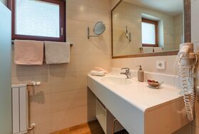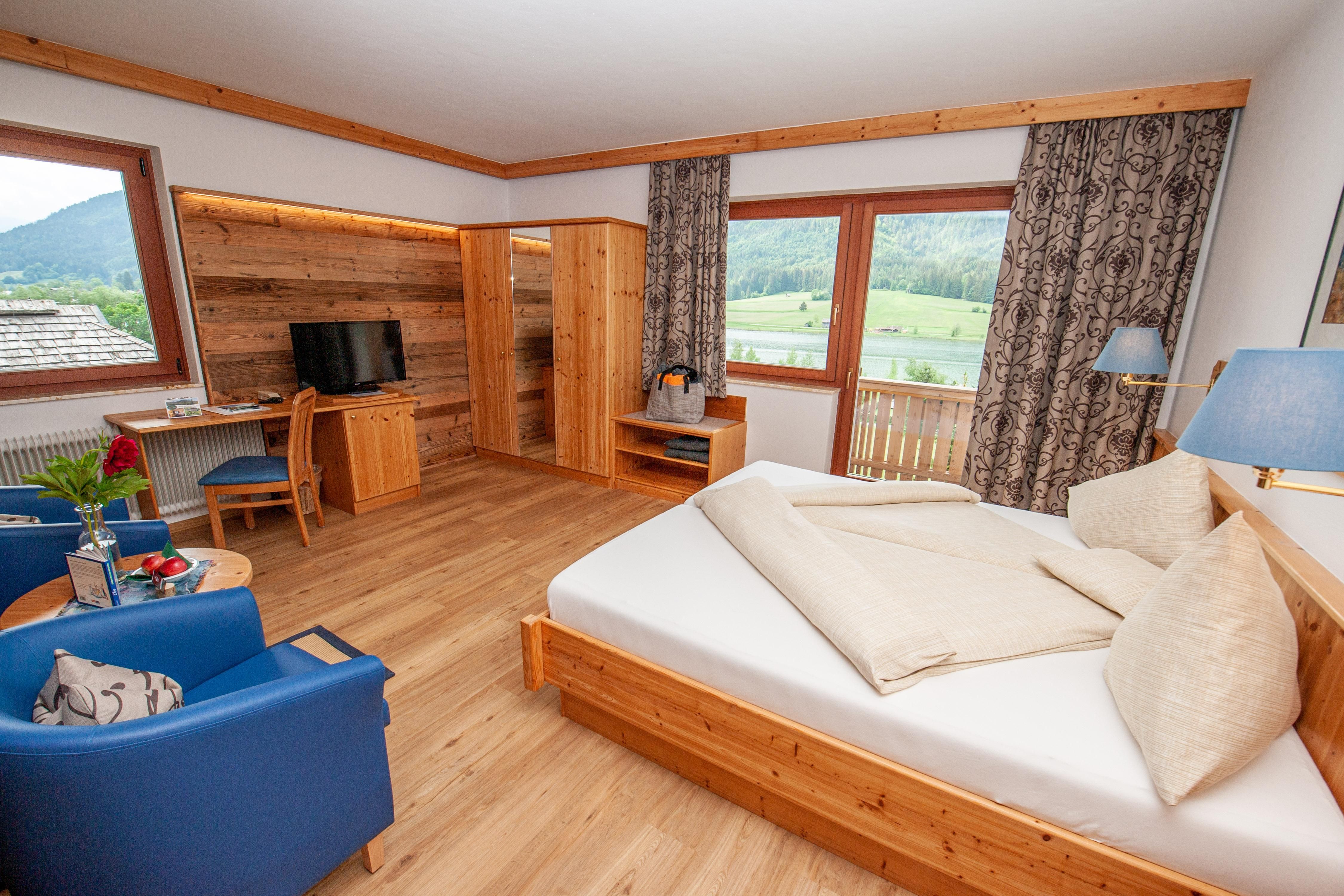Die Westzimmer haben ebenfalls Seeblick, Balkon und Blick in die Dolomiten. Sind geräumig, mit Naturholzmöbeln eingerichtet, Sitzecke, TV, Schreibtisch. Dusche und WC ist getrennt!