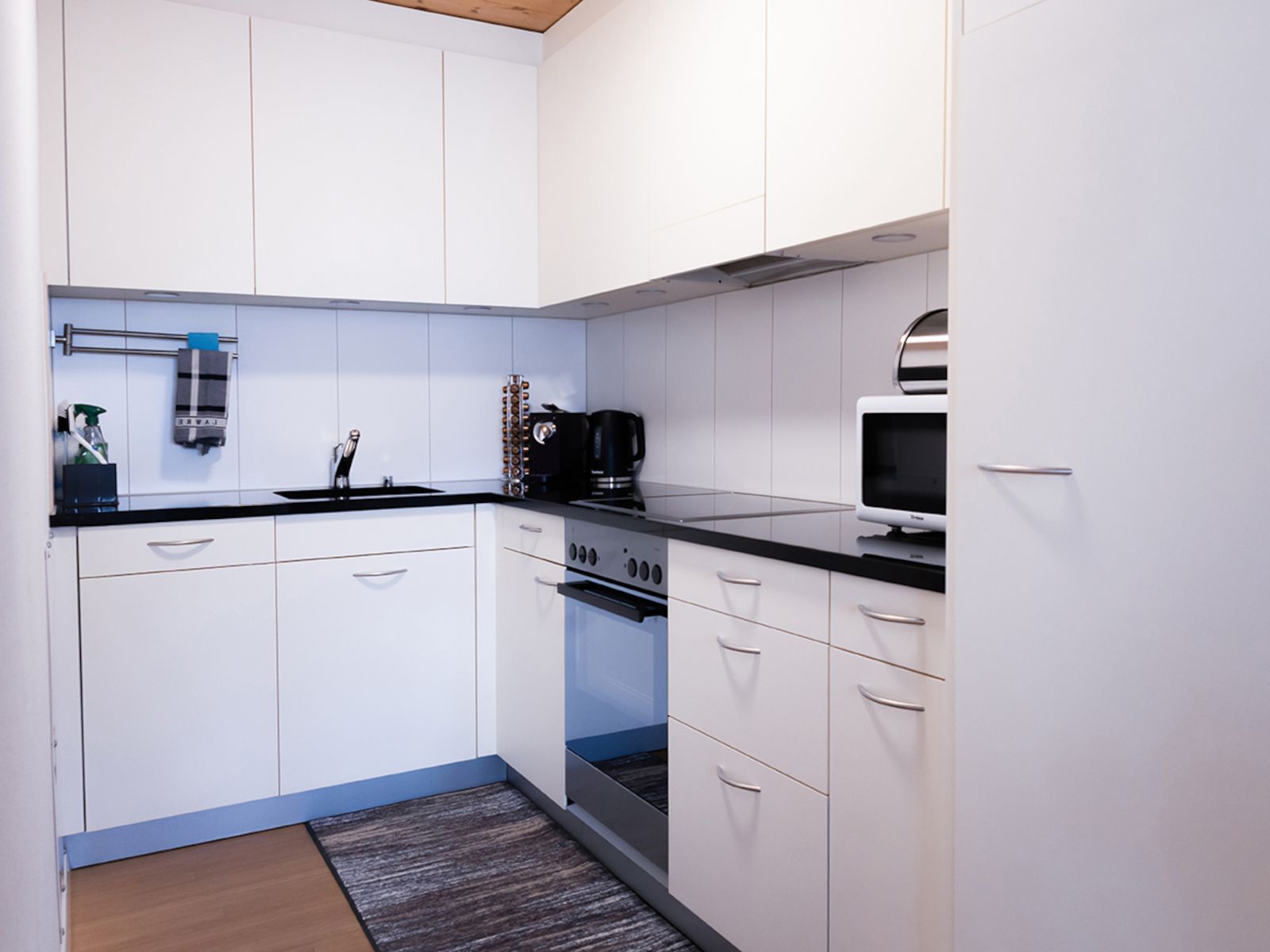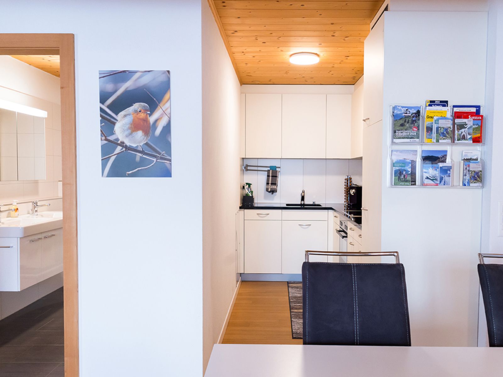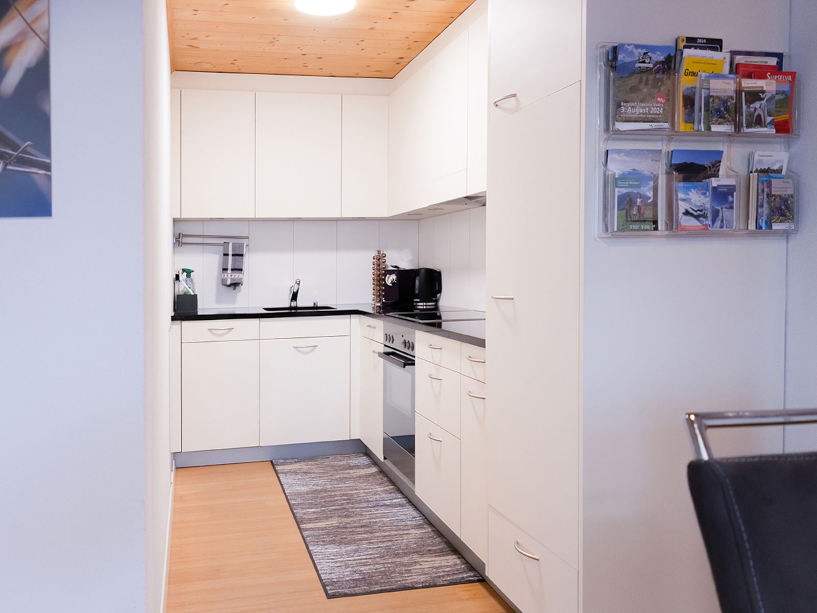 Die heimelige und offene Küche zum Wohnzimmer ist ausgestattet mit Backofen, Kaffeemaschine (Kapseln vorhanden), Mikrowelle, Geschirrspüler, Wasserkocher, Fondue-Set, Raclette-Ofen. Küchenwäsche vorhanden und im Preis inbegriffen.