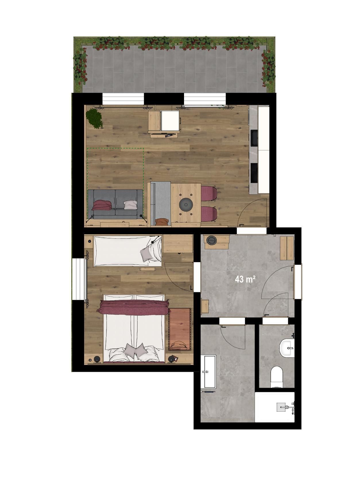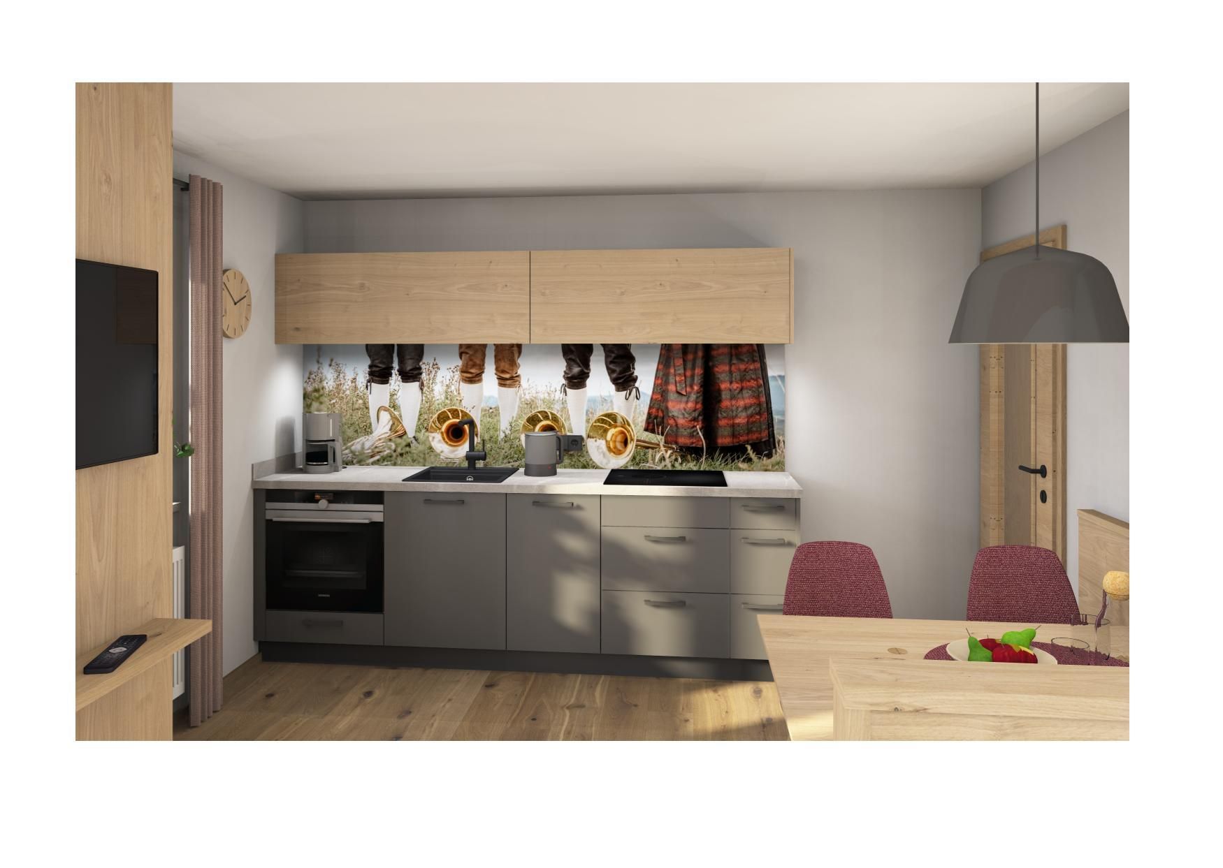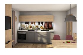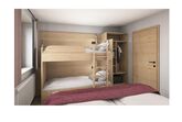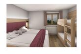Küchenzeile m. Spülmaschine und Backofen, 1 Schlafzimmer m. Doppel- und Stockbett, DU und WC separat,