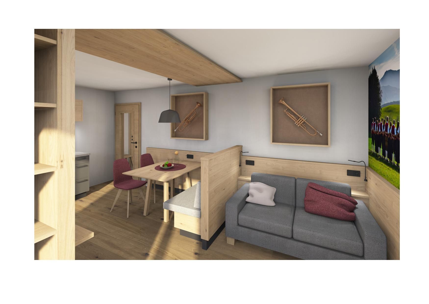1. Etage ca. 43 qm, f. 1- 4 Personen, Wohnküche mit Essecke und Schlafcouch für zwei Personen,