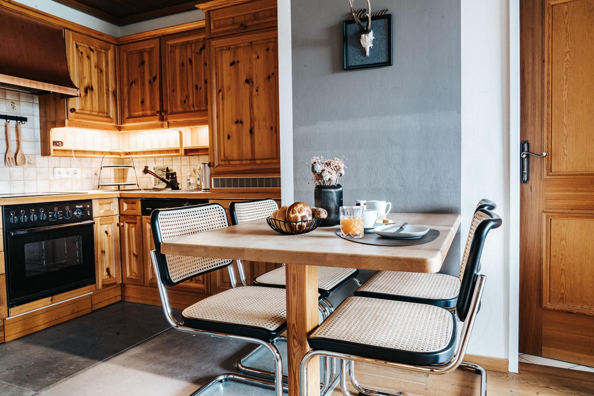 Der weitläufige Wohnbereich ist mit einer modernen, voll ausgestatteten Küche versehen, die alle Bedürfnisse erfüllt. Ganz gleich, ob Du nur ein schnelles Frühstück zubereiten oder ein ausgiebiges Abendessen kochen möchtest – sämtliche Geräte und Küchenutensilien (inklusive Backofen) stehen bereit. Der angrenzende Essbereich ist der ideale Ort, um gemeinsam mit Familie oder Freunden zu speisen.
