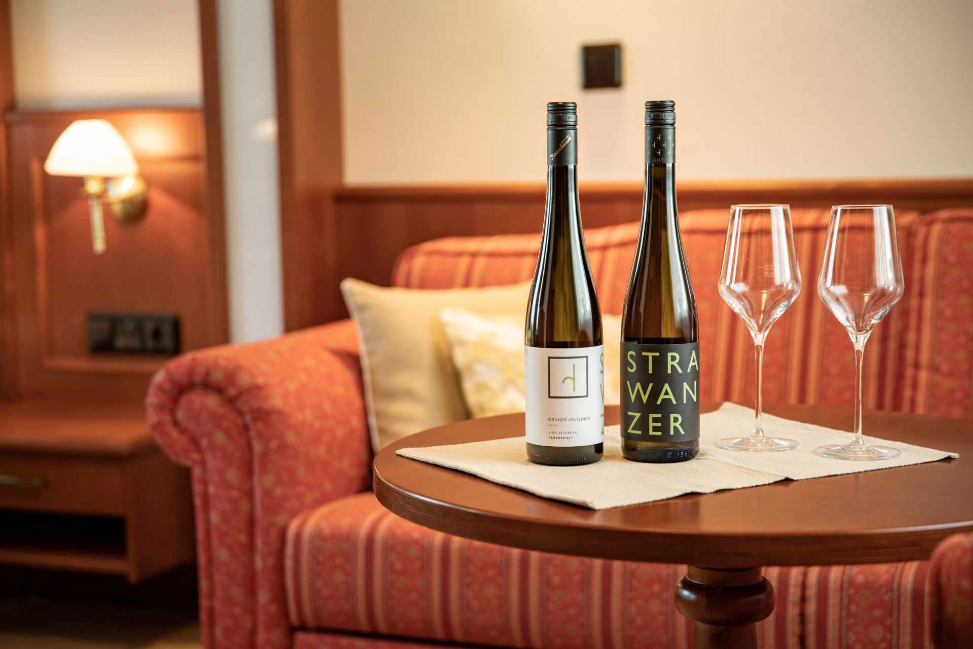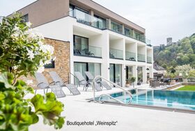 Die POOLsuite SUPERIOR mit deckenhohen Fenster garantiert einen außergewöhnlichen Blick auf die Spitzer Weinberge. Ein direkter Zugang zur Terrasse und zum beheizten Edelstahlpool garantiert auch gehandicapten Menschen Barrierefreiheit.