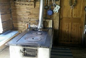 Im Zentrum der Hütte steht die große, gemütliche Stube mit einem gemauerten Holzofenherd mit Backmöglichkeit. Hier wird gekocht, geheizt, gegessen und gelacht – das Herzstück der Hütte. Ein Waschbecken mit Kaltwasser steht ebenfalls bereit.