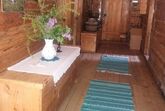 Die Hütte verfügt über eine Dusche mit Warmwasser, das über den Ofen in der Stube erhitzt wird, sowie ein Waschbecken mit Kaltwasser. Beleuchtet wird mit Petroleumlampen – hier erlebst du das einfache Leben ohne Strom, aber mit viel Charme und Ruhe.