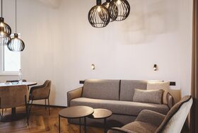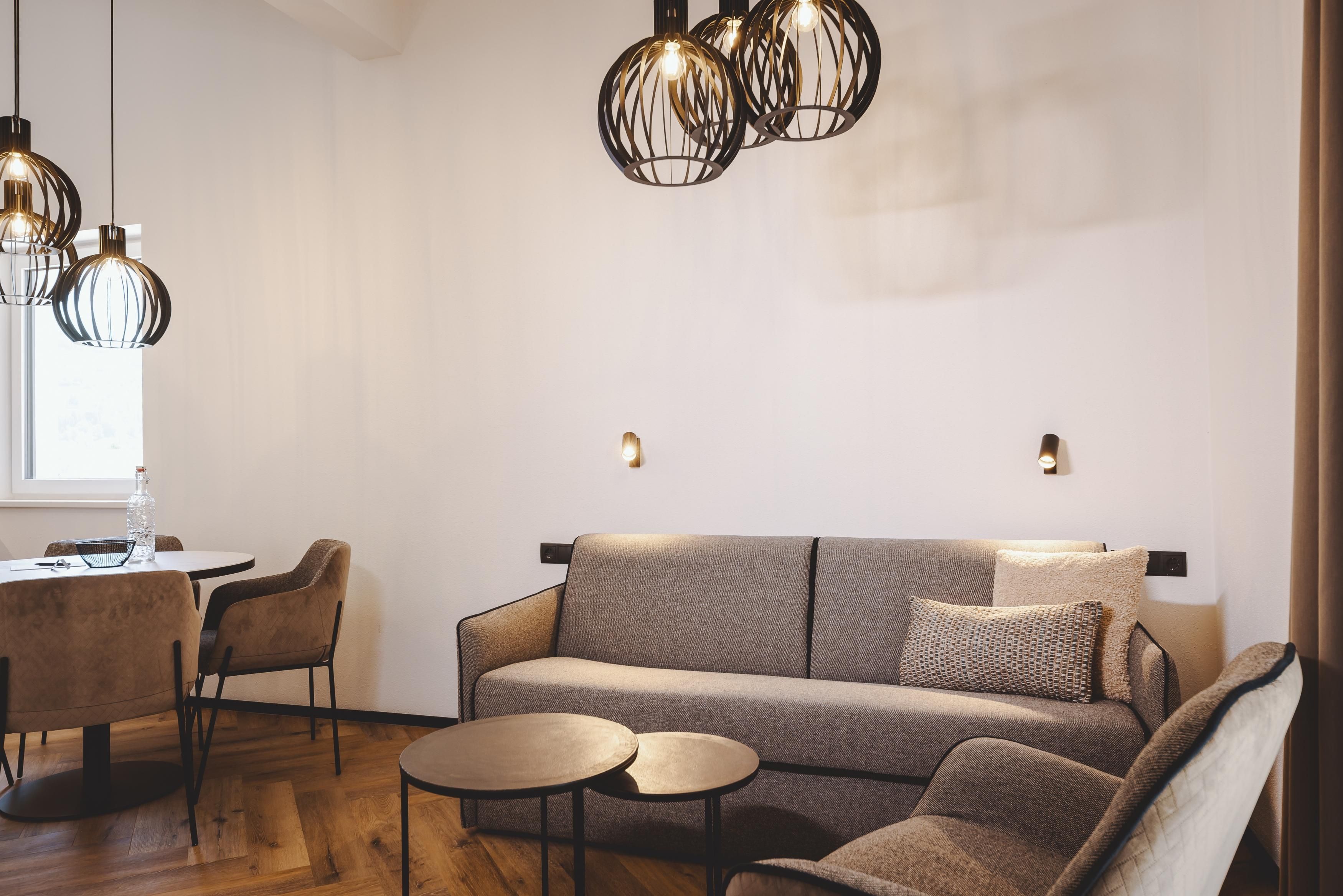 Die Superior Suite verfügt über ein separates Schlafzimmer mit Doppelbett, ein Bad mit Dusche und WC, ein separates WC, sowie eine voll ausgestattete Küche mit Sitzgelegenheiten. Von dort aus erreichen Sie die Terrasse. Eine Schlafcouch bietet Platz für weitere Personen.