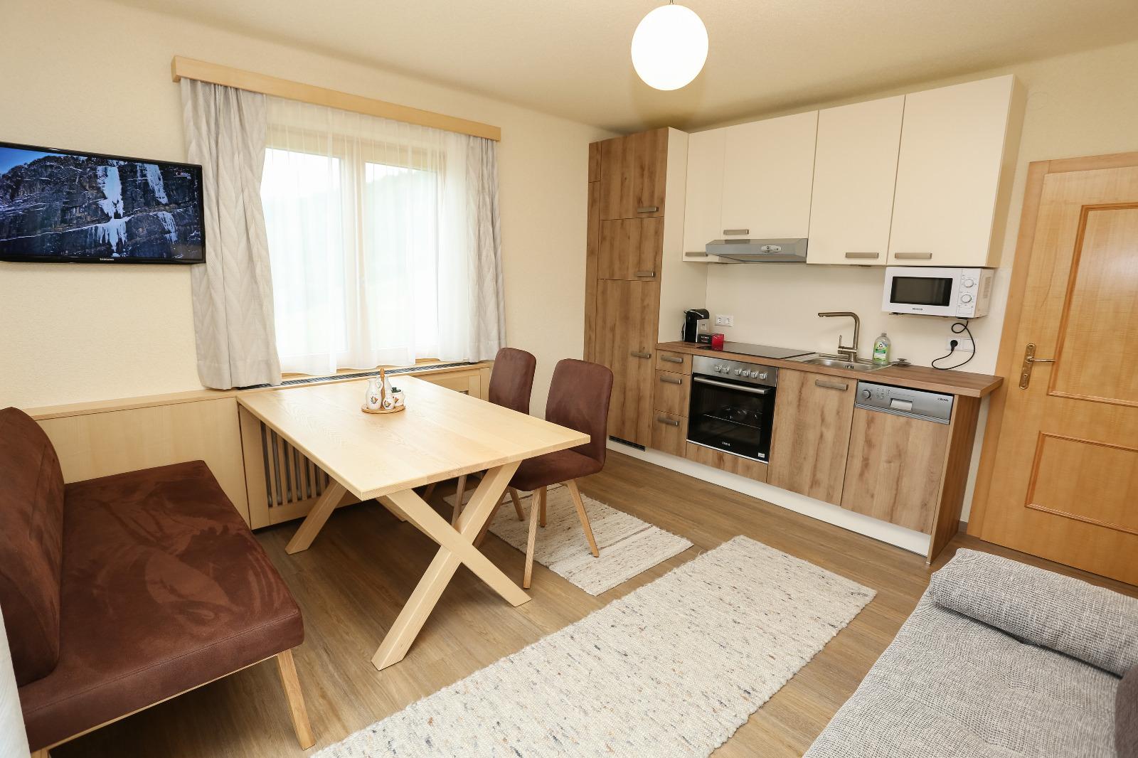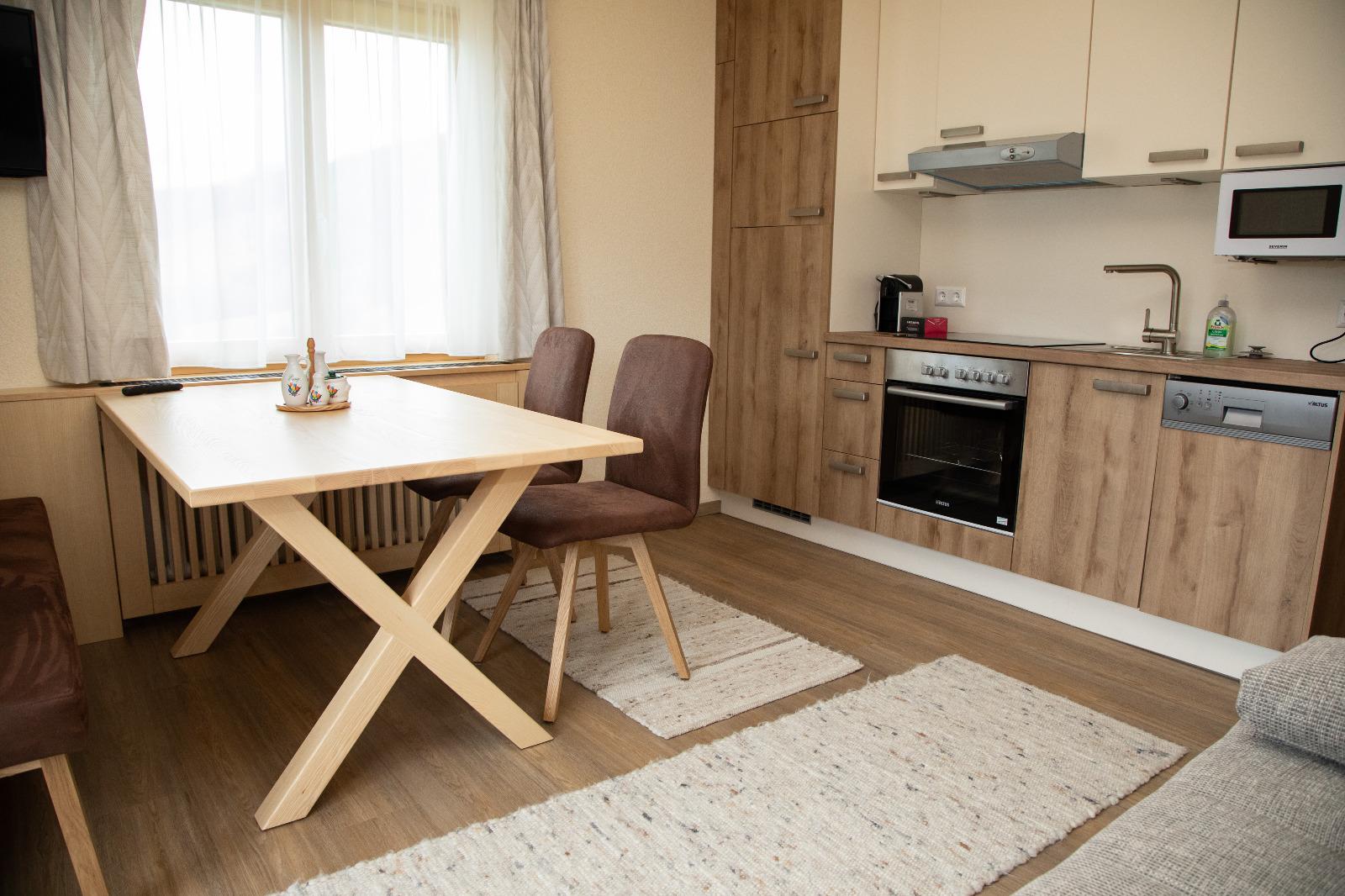 Unser neu errichtetes Apartment ist ideal für 2 Personen. Sie genießen Morgen-, Mittags- und Abendsonne. Ausgestattet mit Kühl- und Gefrierkombination, Geschirrspüler, E-Herd mit Heißluftbackrohr, eine Mikrowelle, ein Toaster, Wasserkocher sowie eine Nespresso-Kapselmaschine im Apartment.