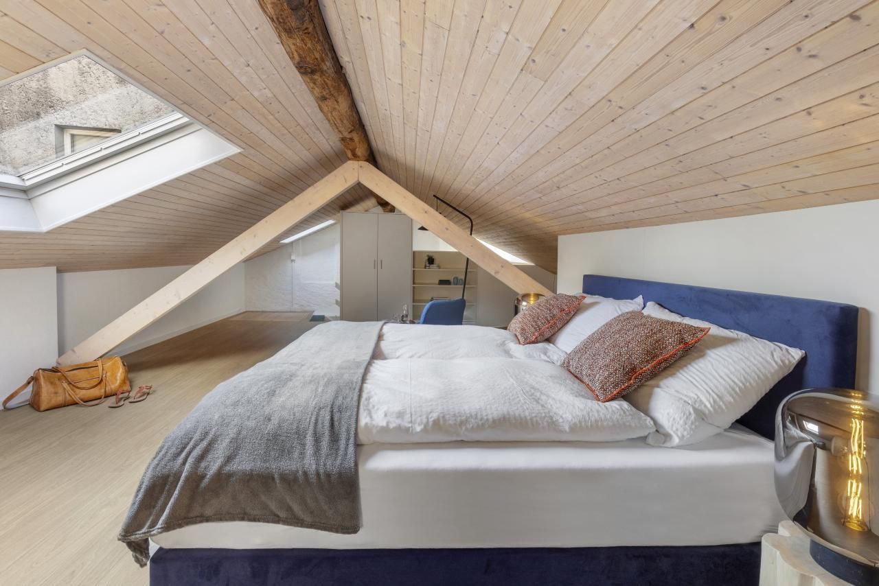 Im Inneren erwartet Sie eine wohl durchdachte Innenausstattung, die keine Wünsche offen lässt. Die offene Küche ist vollausgestattet mit allem, was das Herz begehrt, inklusive Geschirrspüler, Nespresso-Kaffeemaschine, Wasserkocher, Kühlschrank sowie Herd mit Backofen. Der angrenzende Wohnbereich ist gemütlich eingerichtet mit einem Esstisch und vier Stühlen, einem komfortablen Schlafsofa für zusätzliche Gäste und einem großen Kleiderschrank, während das großzügige Fenster einen bezaubernden Ausblick auf den Lago Maggiore und die umliegenden Berge bietet. Eine elegante Treppe führt hinauf zum kuscheligen Schlafzimmer im Dachgeschoss, das mit einem Doppelbett, einem geräumigen Kleiderschrank und einer einladenden Leseecke ausgestattet ist.