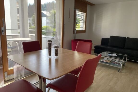 Die Wohnung überzeugt durch ihre offene Raumgestaltung und ein helles, freundliches Ambiente. Im Schlafzimmer befindet sich ein komfortables Doppelbett, während die Polstergruppe im Wohnzimmer sich einfach in zwei zusätzliche Schlafplätze verwandeln lässt. Der Wohn- und Essbereich ist gemütlich eingerichtet und bietet einen Esstisch mit vier Stühlen sowie einen Zugang zum südseitig ausgerichteten Balkon mit Blick ins Grüne – perfekt für entspannte Stunden an der frischen Bergluft.