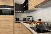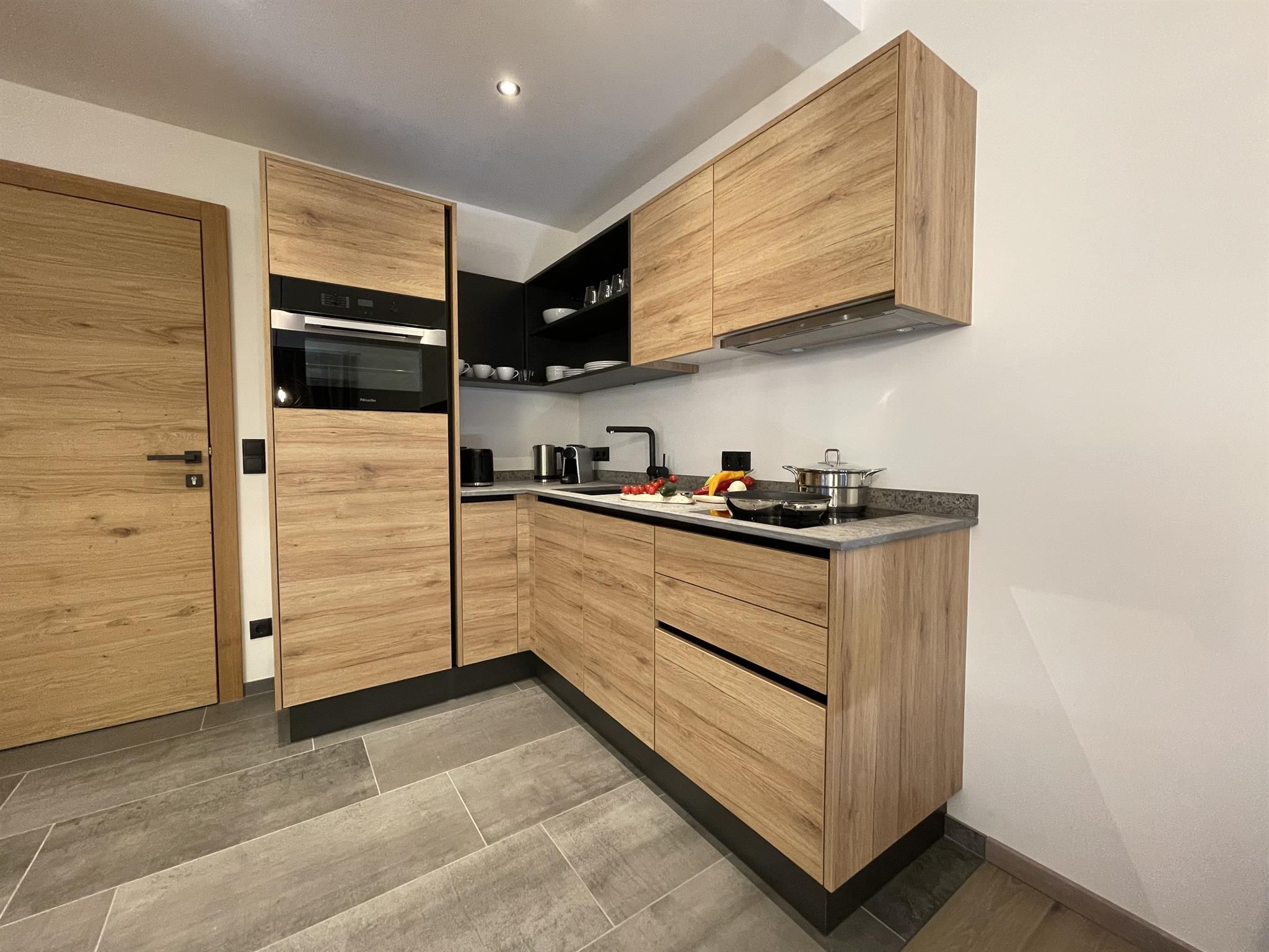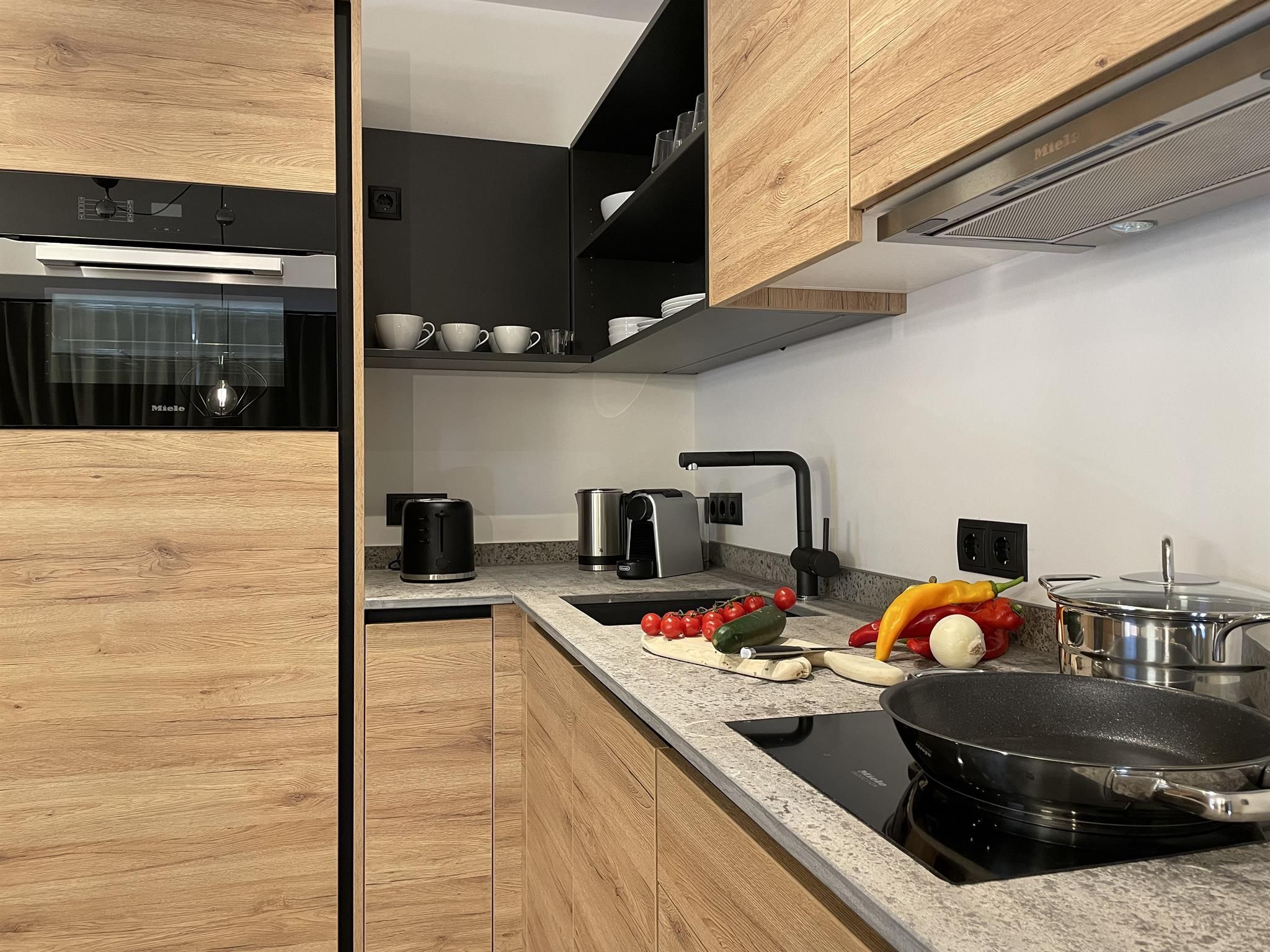 -Küche: Induktionsherd, Backofen, Kühlschrank mit Gefrierfach, Geschirrspüler, Toaster, Wasserkocher, Kochgeschirr, Nespresso Kaffeemaschine