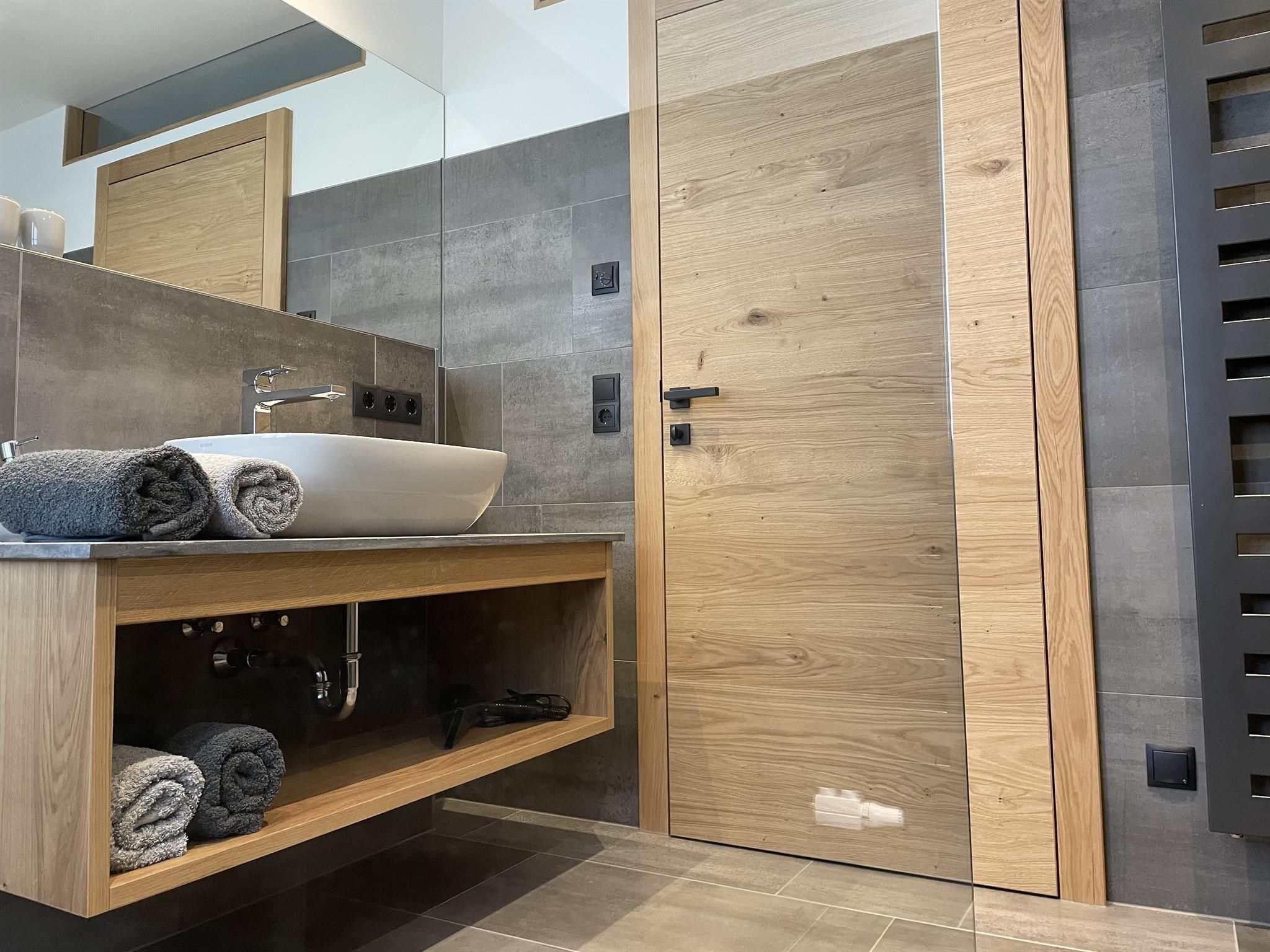 -Badezimmer: Dusche, WC, Handtuchtrockner, Föhn, Handtücher