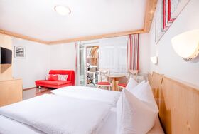 Das Badezimmer ist mit Dusche/Bad und Haartrockner ausgestattet, das WC ist separat untergebracht – praktisch für den Familienalltag. Je nach Verfügbarkeit liegt das Zimmer im 1. Obergeschoss mit Balkon in sonniger Südlage oder im Parterre mit direktem Zugang ins Freie, ebenfalls nach Süden ausgerichtet. Individuell gefertigte Möbel vom Hausherrn und liebevolle Details sorgen für eine wohnliche Atmosphäre. Ein echtes Zuhause auf Zeit mit Charakter statt Standard.