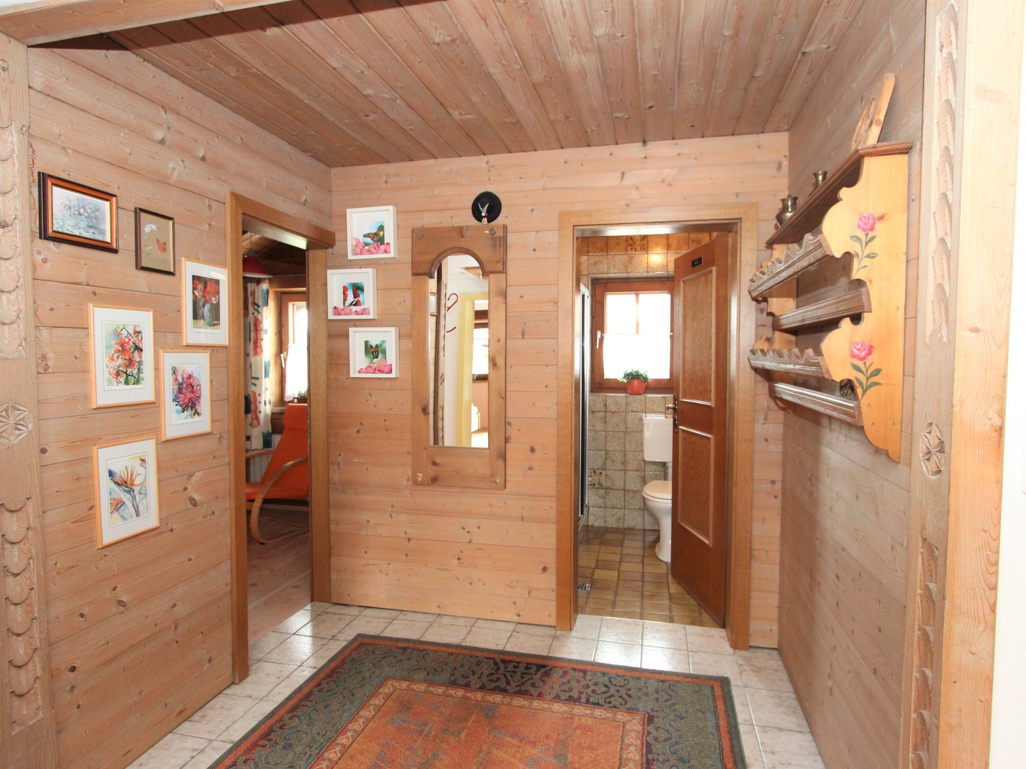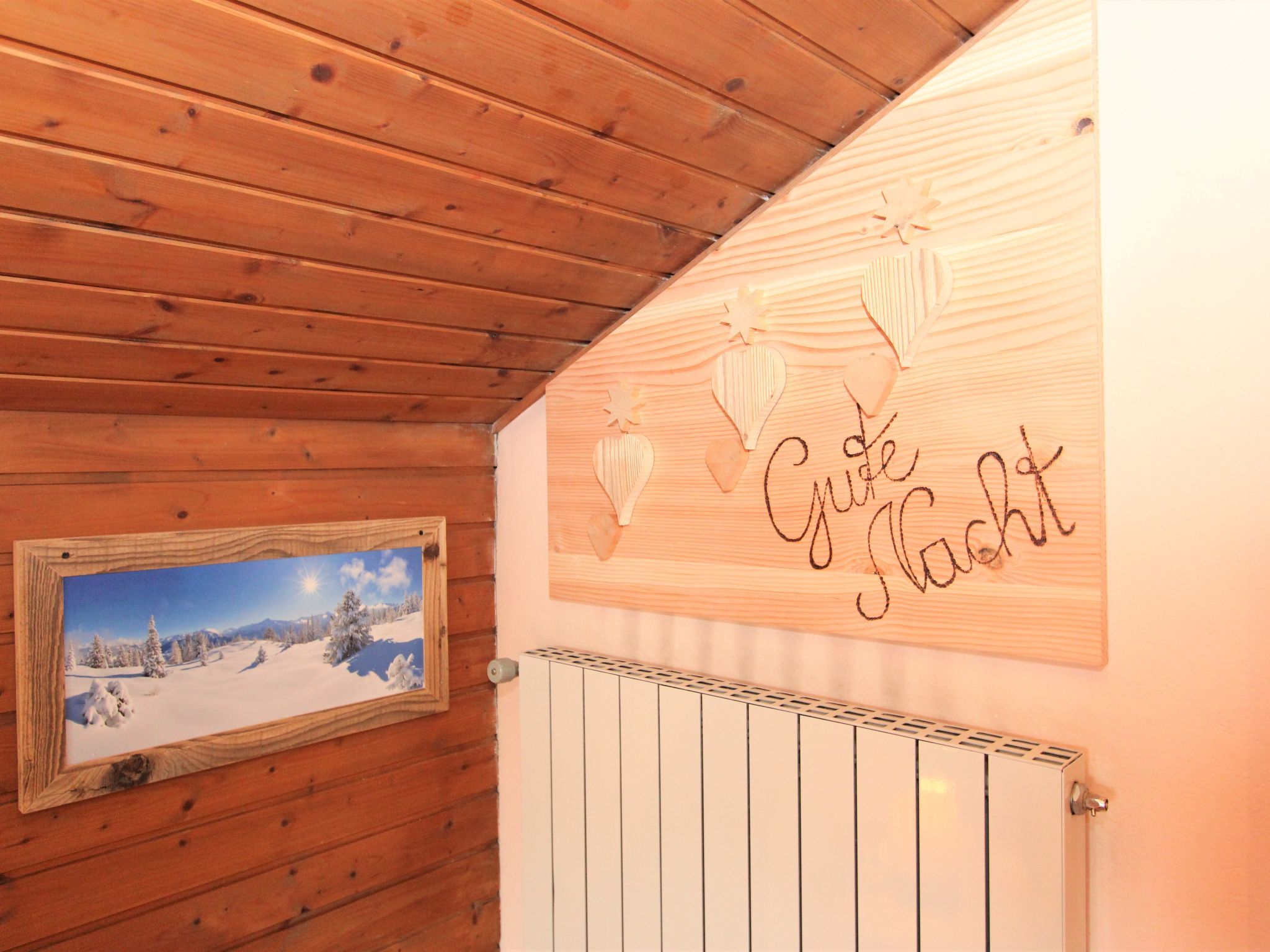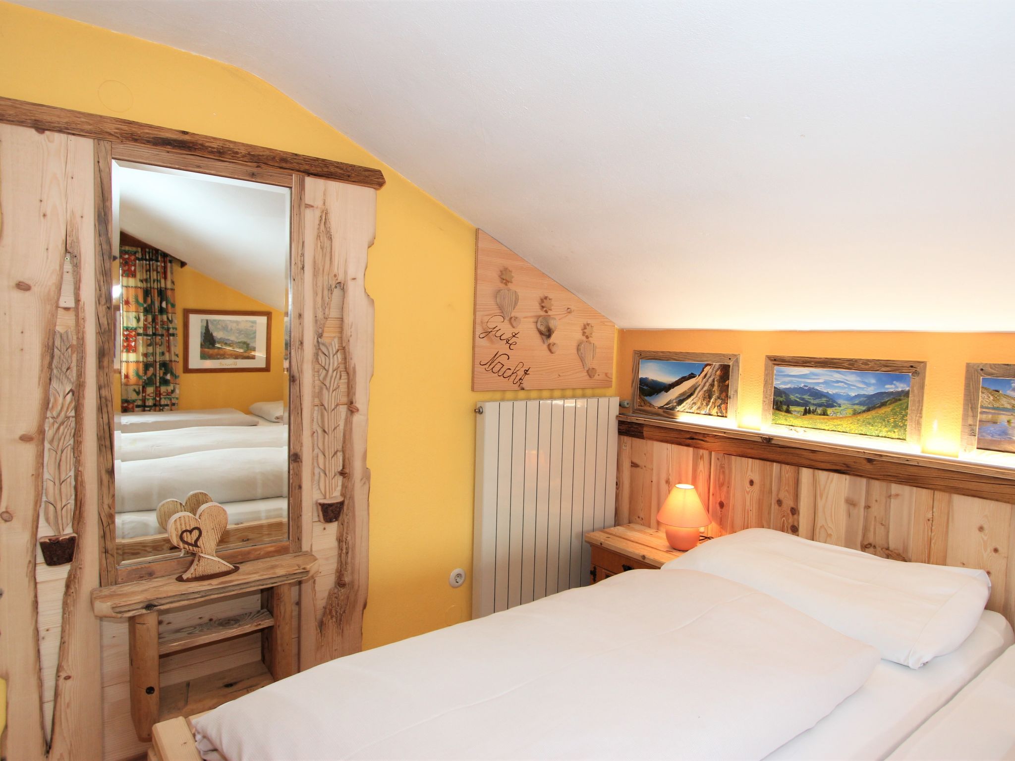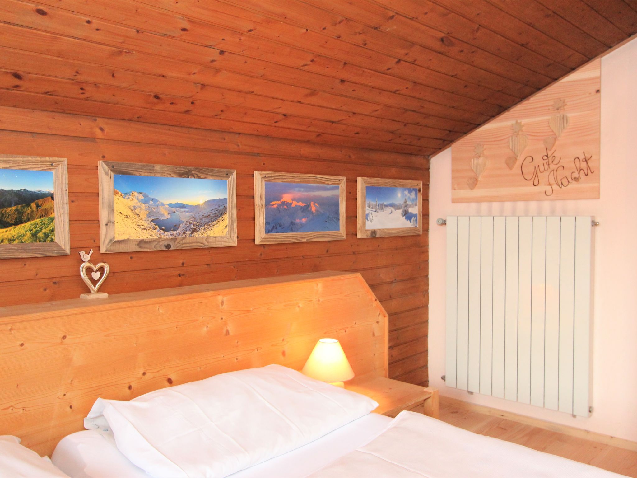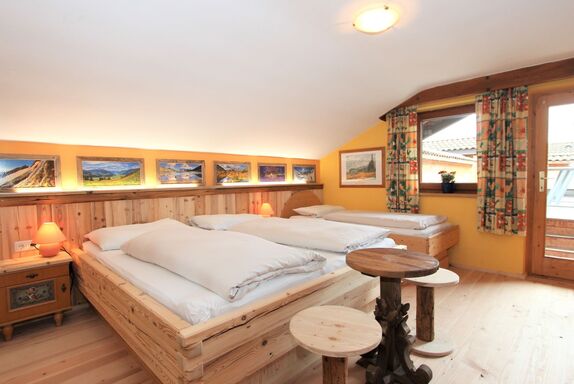 5-Zimmer-Wohnung 160 m2 auf 2 Stockwerken. Rustikal und gemütlich eingerichtet: Eingang. Grosses Wohn-/Esszimmer mit Panoramafenster mit Esstisch und Sat-TV (Flachbildschirm), Radio. Ausgang zum Balkon. 1 Zimmer mit 1 Bett und 1 Doppelbett. Küche (3 Kochplatten, Backofen, Geschirrspüler, Mikrowelle, Tiefkühler) mit Essecke und Radio. Bad, sep. WC. Dachgeschoss: Eingang. 1 Zimmer mit 1 Bett, 1 Doppelbett und Waschbecken. Ausgang zur Terrasse. 1 Zimmer mit 1 Bett und Waschbecken. 1 Doppelzimmer mit Waschbecken. Ausgang zur Terrasse. Dusche/WC. Balkon, grosse Terrasse 50 m2. Terrassenmöbel, Gartengrill. Sehr schöne Sicht auf die Berge und die Landschaft. Zur Verfügung: Internet (Wireless LAN, gratis). Bitte beachten: Nichtraucher-Unterkunft. Wichtig: Die Wohnung darf maximal mit 8 Personen belegt werden (inkusive Kinderbett).