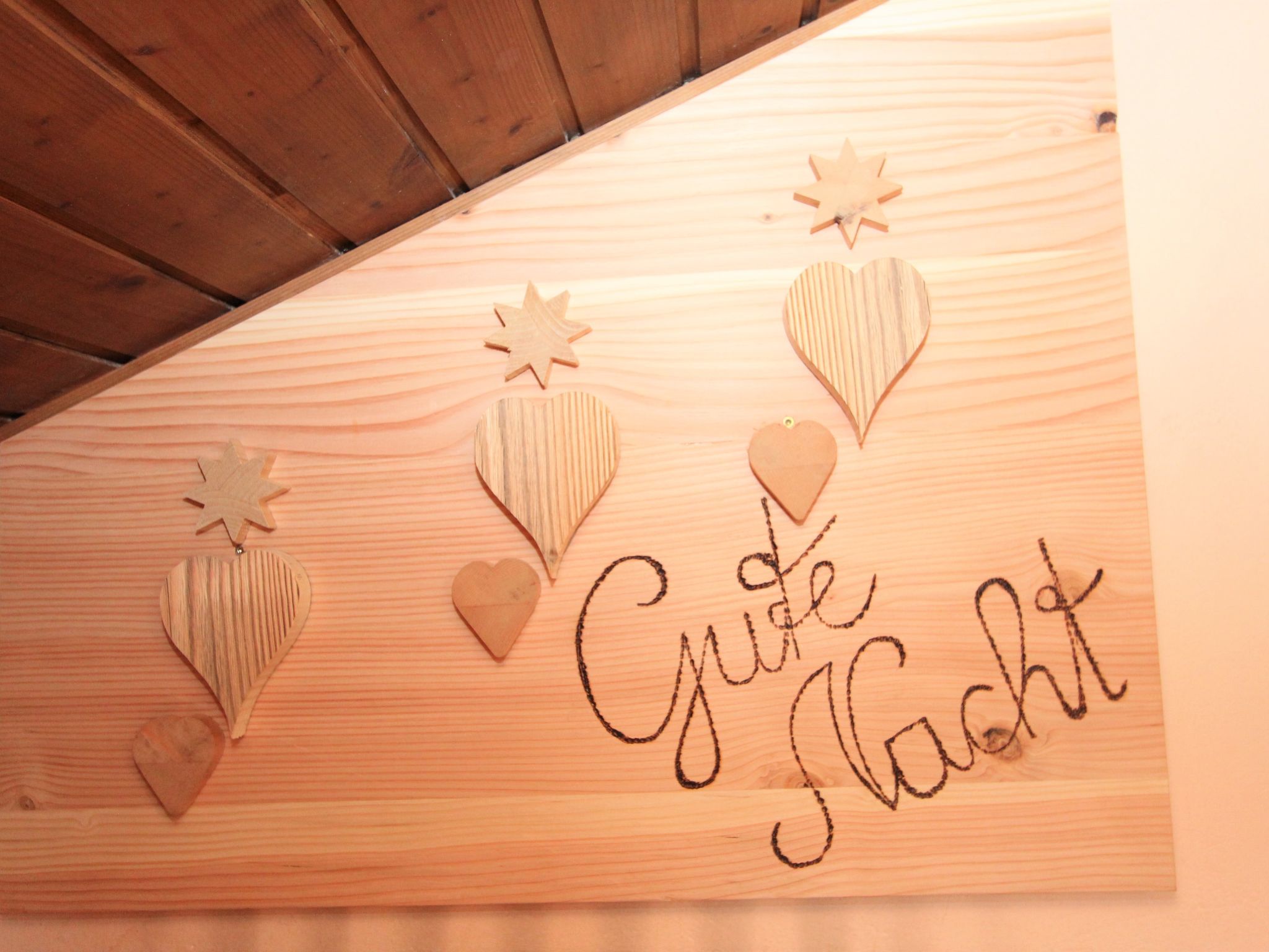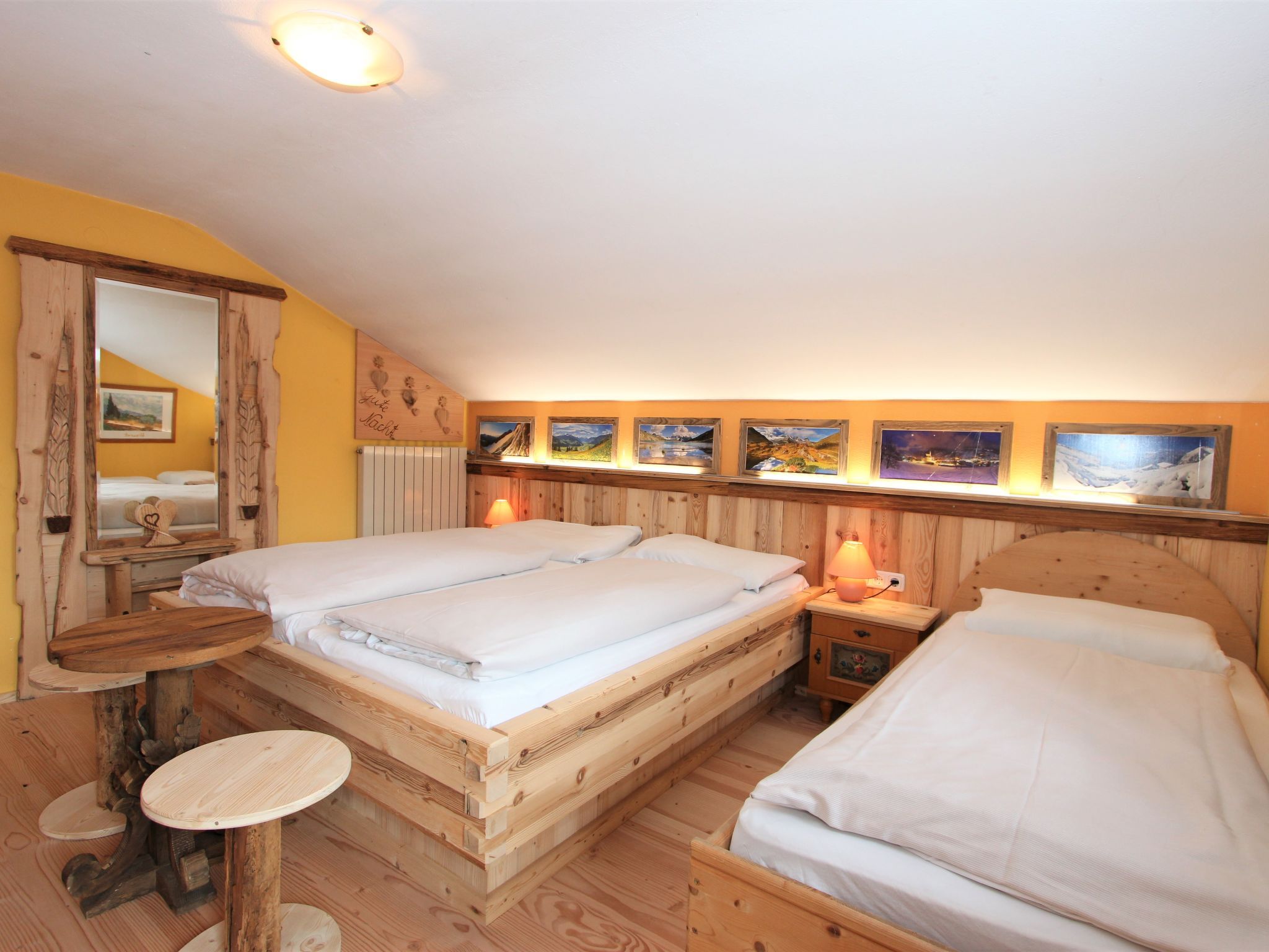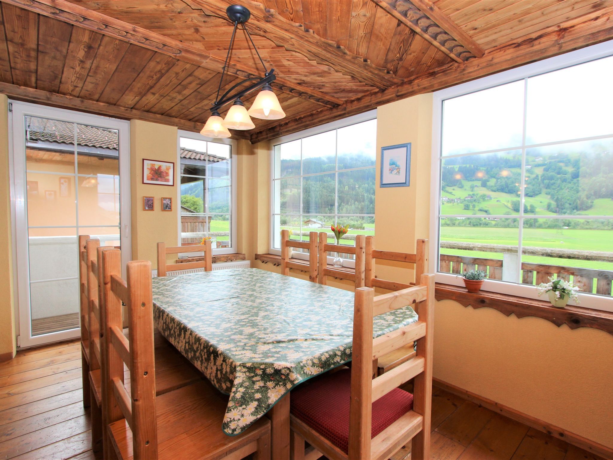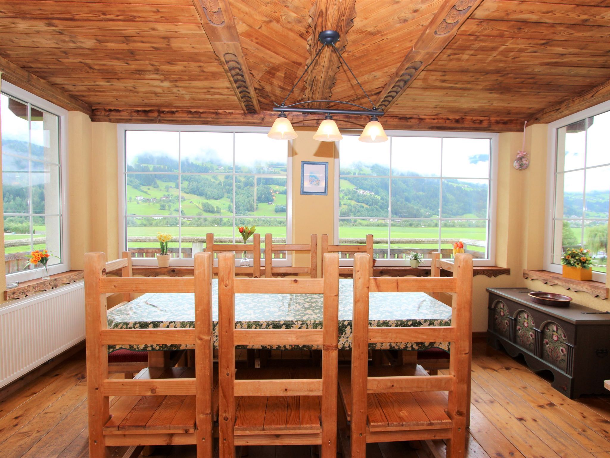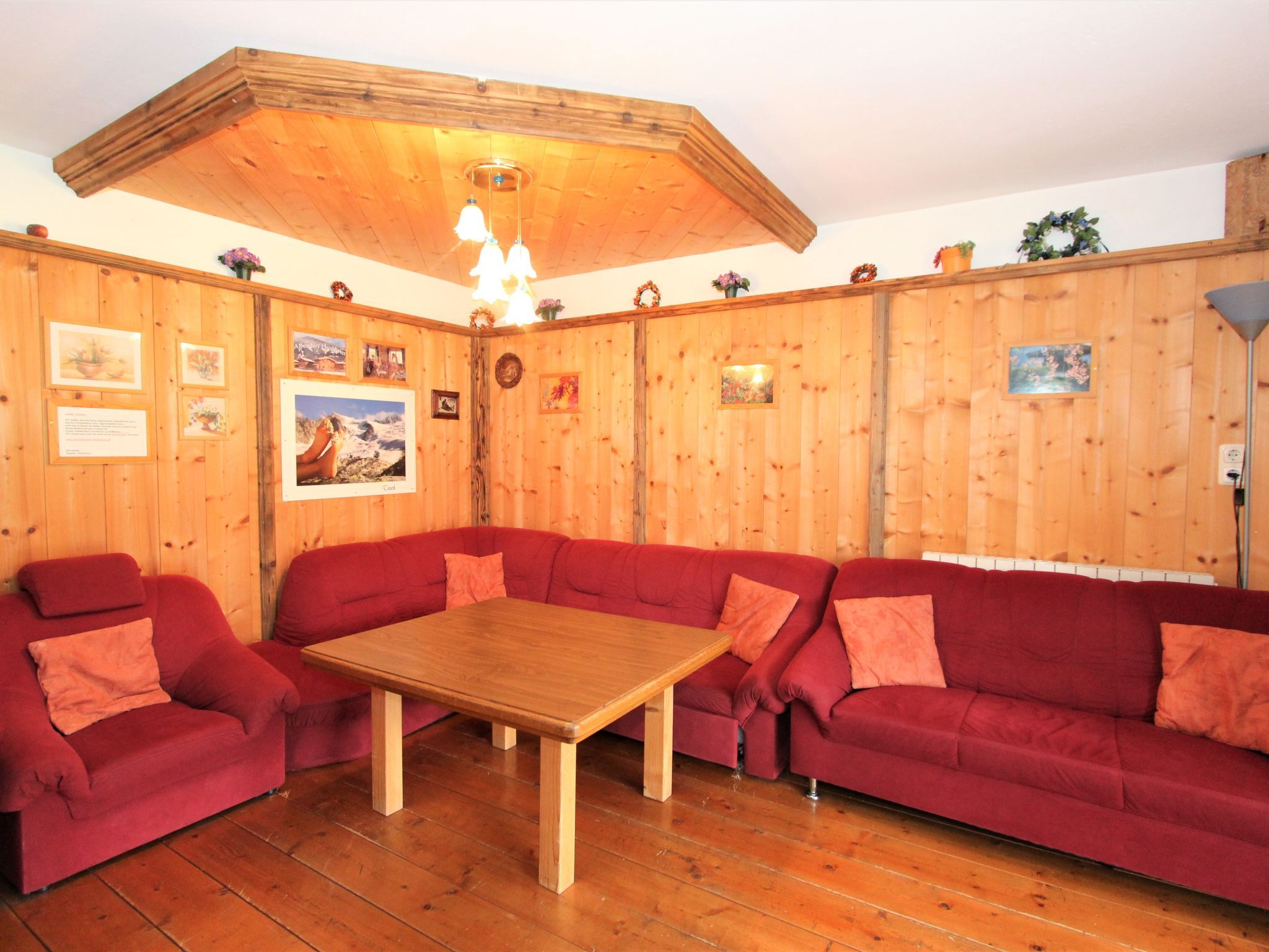5-Zimmer-Wohnung 160 m2 auf 2 Stockwerken. Rustikal und gemütlich eingerichtet: Eingang. Grosses Wohn-/Esszimmer mit Panoramafenster mit Esstisch und Sat-TV (Flachbildschirm), Radio. Ausgang zum Balkon. 1 Zimmer mit 1 Bett und 1 Doppelbett. Küche (3 Kochplatten, Backofen, Geschirrspüler, Mikrowelle, Tiefkühler) mit Essecke und Radio. Bad, sep. WC. Dachgeschoss: Eingang. 1 Zimmer mit 1 Bett, 1 Doppelbett und Waschbecken. Ausgang zur Terrasse. 1 Zimmer mit 1 Bett und Waschbecken. 1 Doppelzimmer mit Waschbecken. Ausgang zur Terrasse. Dusche/WC. Balkon, grosse Terrasse 50 m2. Terrassenmöbel, Gartengrill. Sehr schöne Sicht auf die Berge und die Landschaft. Zur Verfügung: Internet (Wireless LAN, gratis). Bitte beachten: Nichtraucher-Unterkunft. Wichtig: Die Wohnung darf maximal mit 8 Personen belegt werden (inkusive Kinderbett).