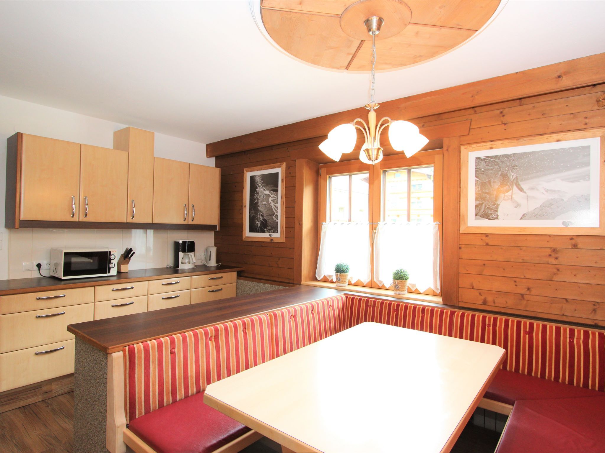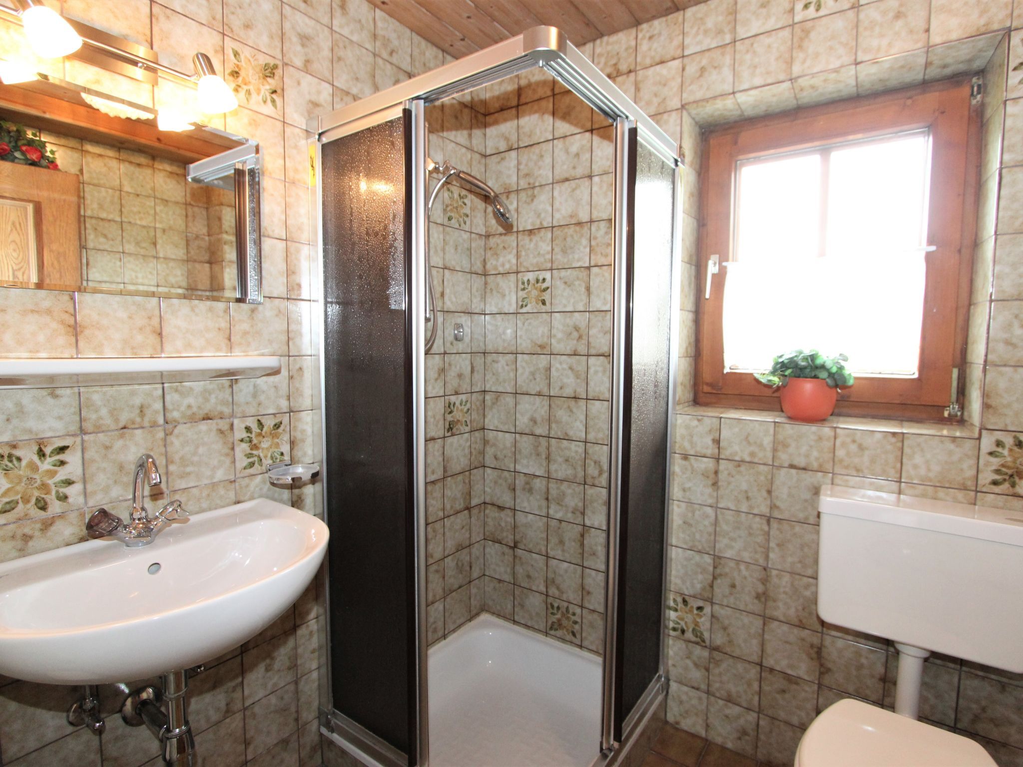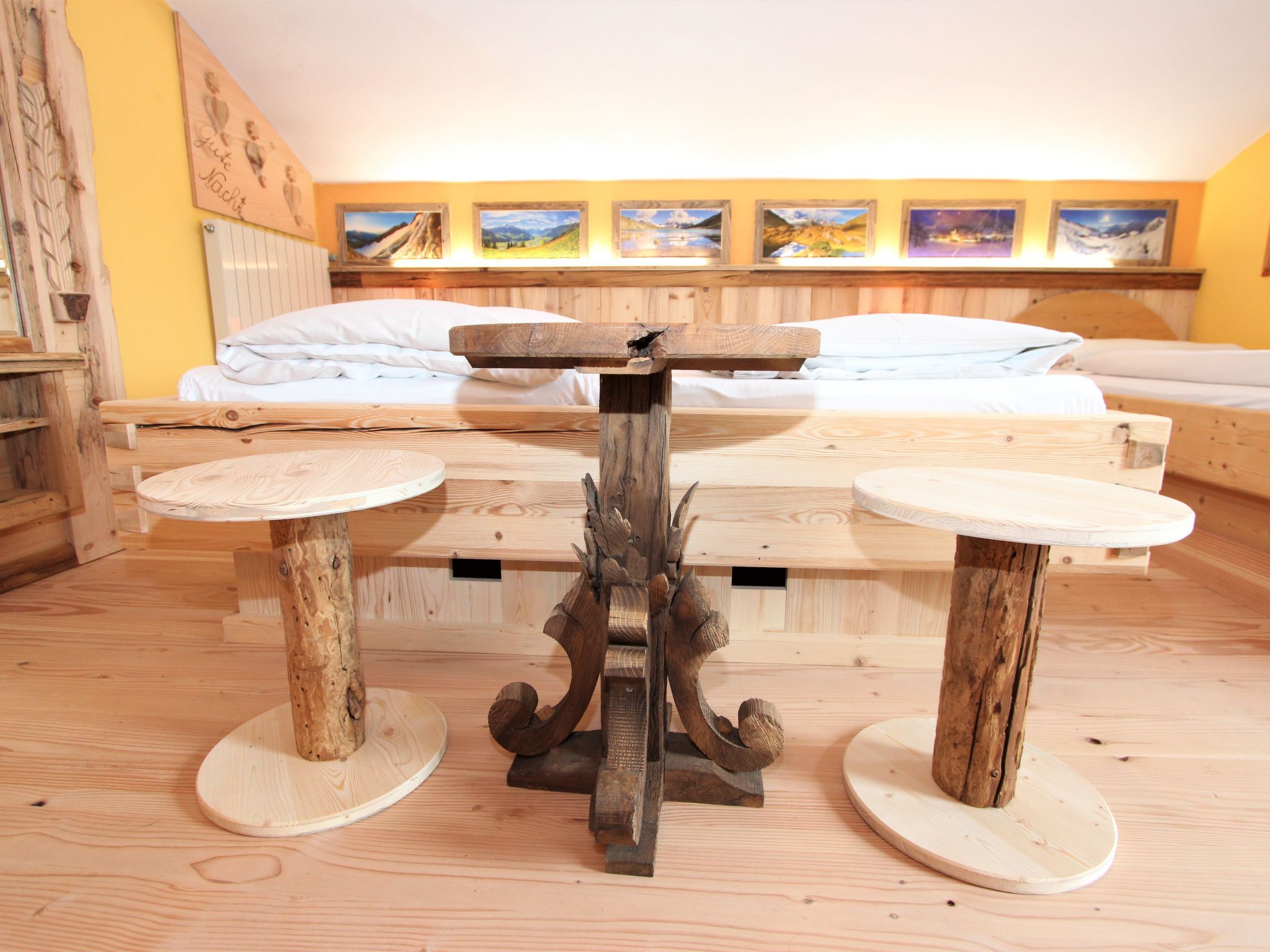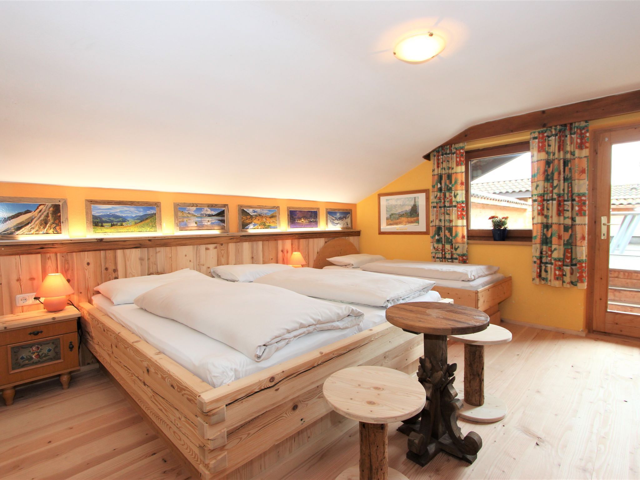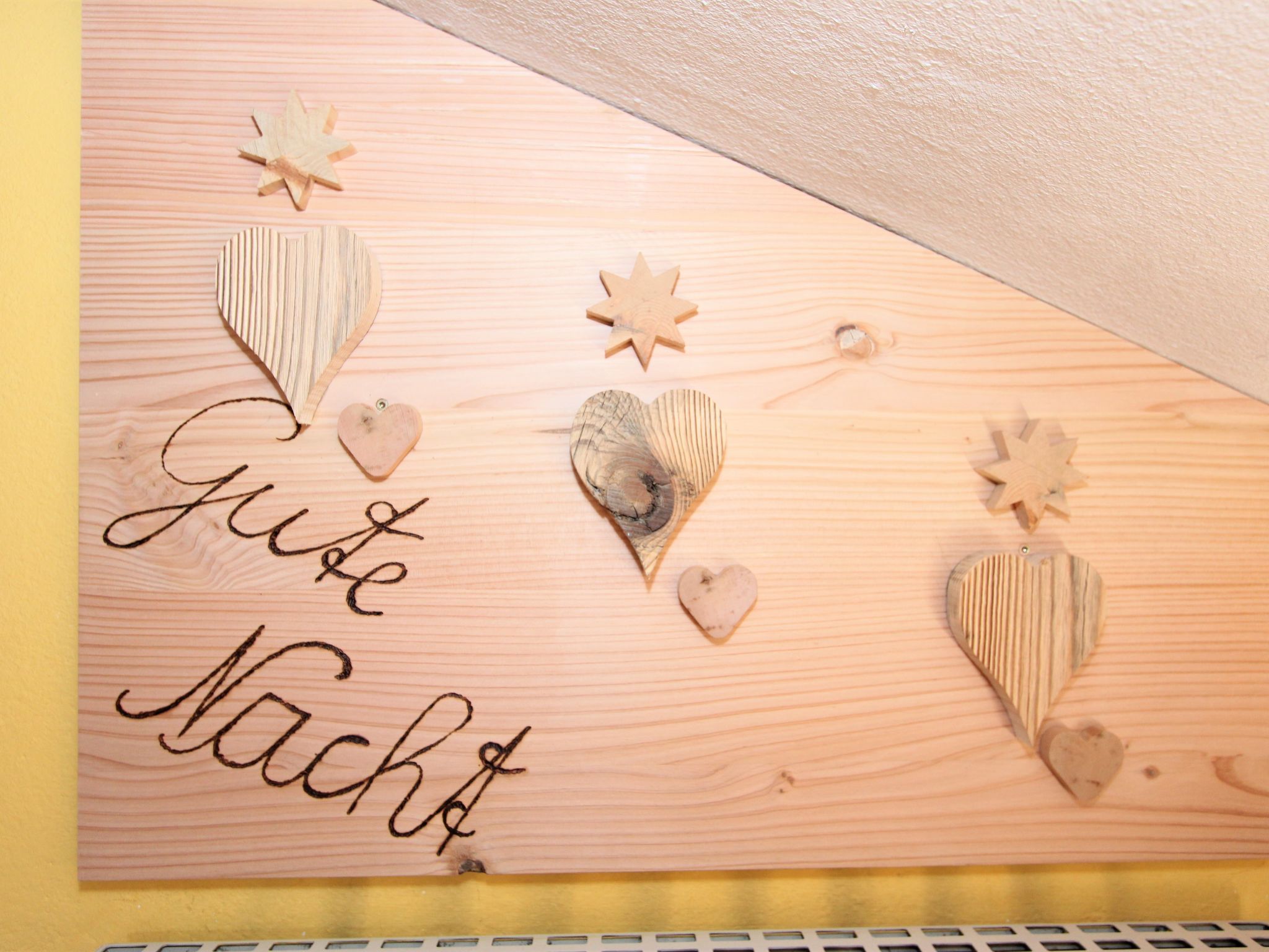 5-Zimmer-Wohnung 160 m2 auf 2 Stockwerken. Rustikal und gemütlich eingerichtet: Eingang. Grosses Wohn-/Esszimmer mit Panoramafenster mit Esstisch und Sat-TV (Flachbildschirm), Radio. Ausgang zum Balkon. 1 Zimmer mit 1 Bett und 1 Doppelbett. Küche (3 Kochplatten, Backofen, Geschirrspüler, Mikrowelle, Tiefkühler) mit Essecke und Radio. Bad, sep. WC. Dachgeschoss: Eingang. 1 Zimmer mit 1 Bett, 1 Doppelbett und Waschbecken. Ausgang zur Terrasse. 1 Zimmer mit 1 Bett und Waschbecken. 1 Doppelzimmer mit Waschbecken. Ausgang zur Terrasse. Dusche/WC. Balkon, grosse Terrasse 50 m2. Terrassenmöbel, Gartengrill. Sehr schöne Sicht auf die Berge und die Landschaft. Zur Verfügung: Internet (Wireless LAN, gratis). Bitte beachten: Nichtraucher-Unterkunft. Wichtig: Die Wohnung darf maximal mit 8 Personen belegt werden (inkusive Kinderbett).