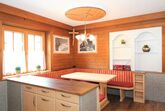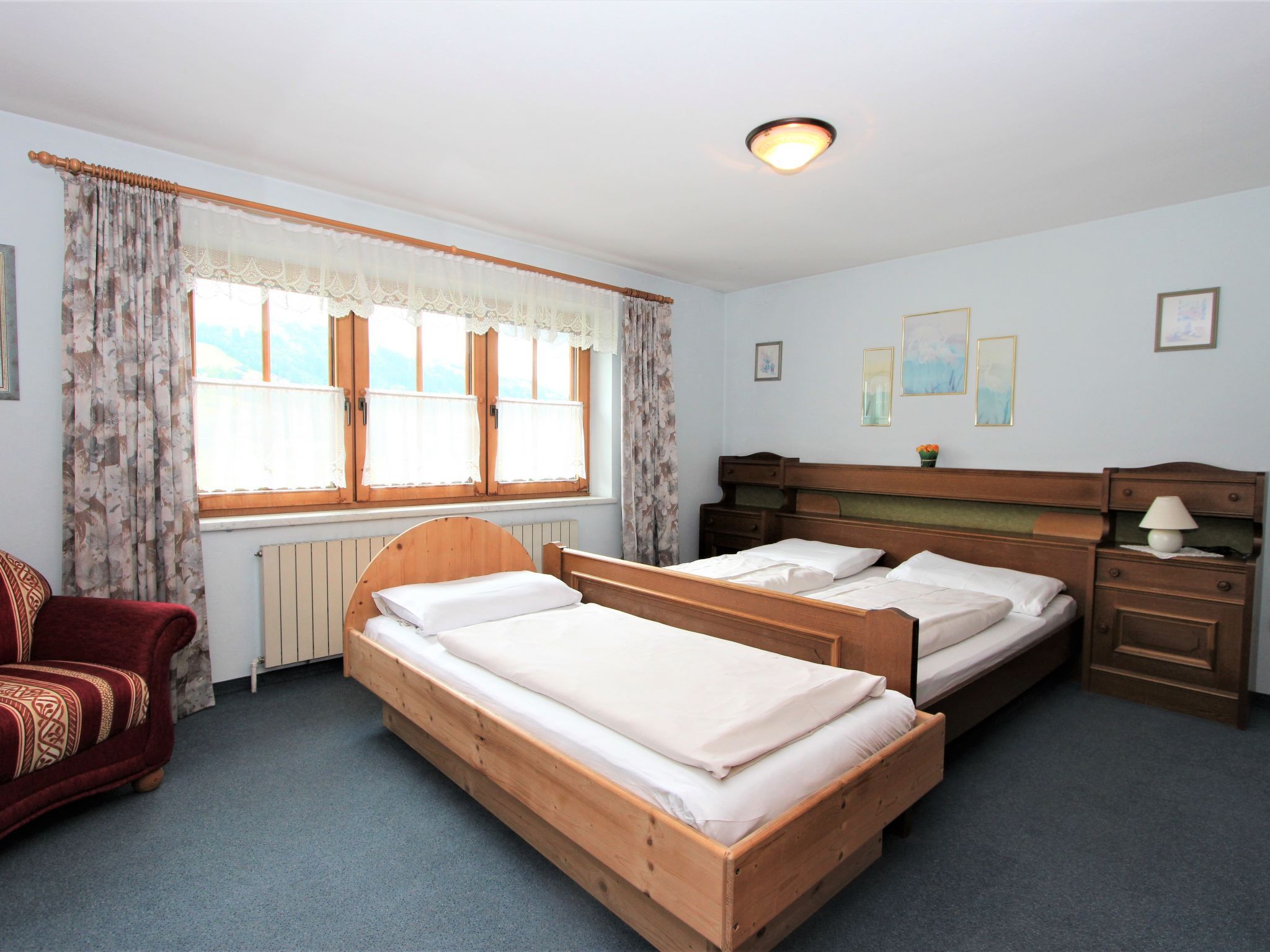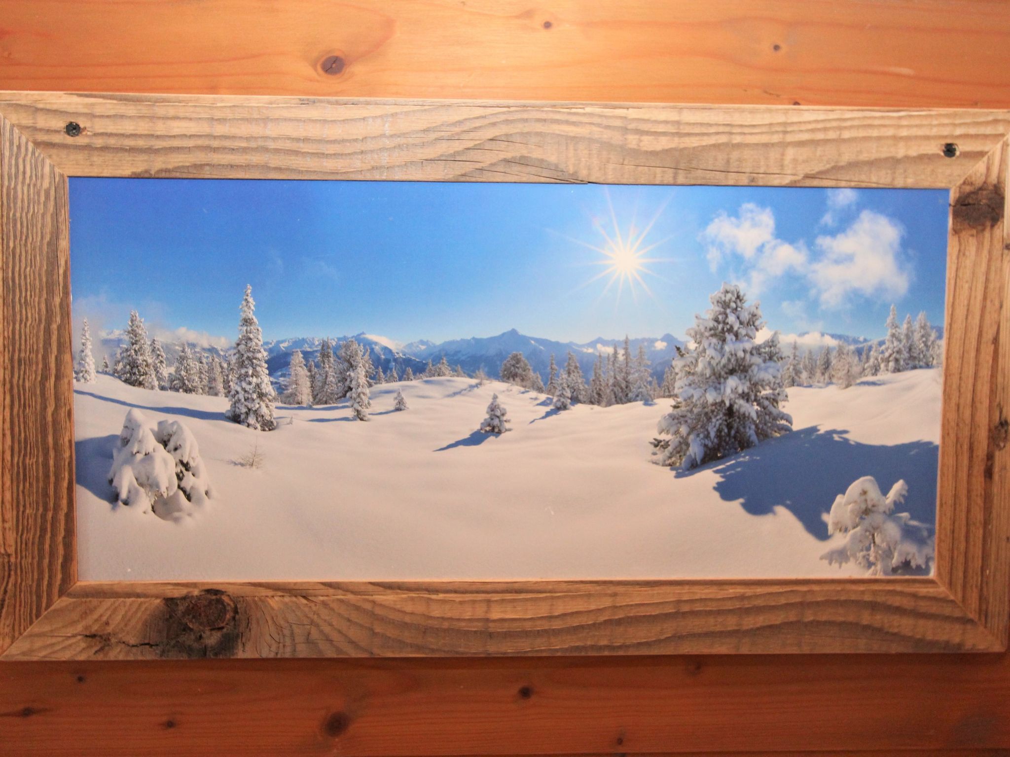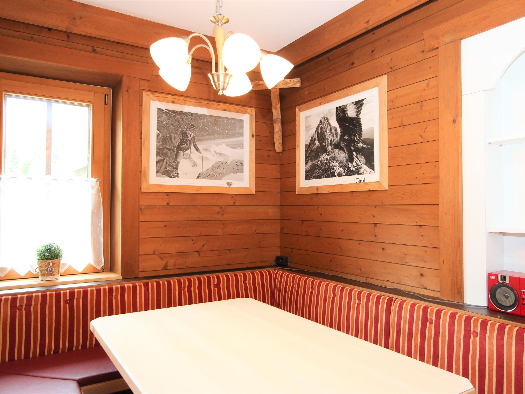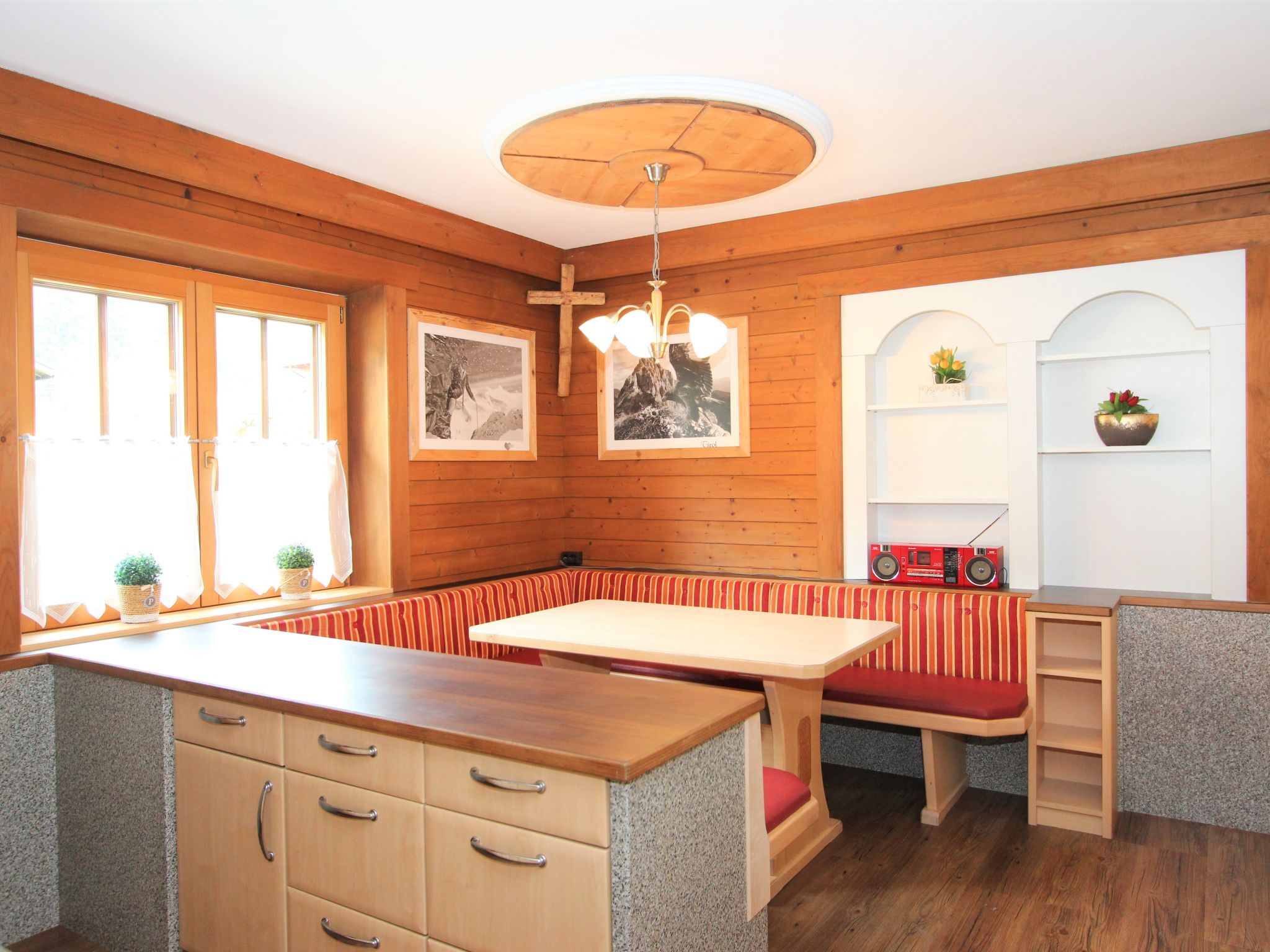 5-Zimmer-Wohnung 160 m2 auf 2 Stockwerken. Rustikal und gemütlich eingerichtet: Eingang. Grosses Wohn-/Esszimmer mit Panoramafenster mit Esstisch und Sat-TV (Flachbildschirm), Radio. Ausgang zum Balkon. 1 Zimmer mit 1 Bett und 1 Doppelbett. Küche (3 Kochplatten, Backofen, Geschirrspüler, Mikrowelle, Tiefkühler) mit Essecke und Radio. Bad, sep. WC. Dachgeschoss: Eingang. 1 Zimmer mit 1 Bett, 1 Doppelbett und Waschbecken. Ausgang zur Terrasse. 1 Zimmer mit 1 Bett und Waschbecken. 1 Doppelzimmer mit Waschbecken. Ausgang zur Terrasse. Dusche/WC. Balkon, grosse Terrasse 50 m2. Terrassenmöbel, Gartengrill. Sehr schöne Sicht auf die Berge und die Landschaft. Zur Verfügung: Internet (Wireless LAN, gratis). Bitte beachten: Nichtraucher-Unterkunft. Wichtig: Die Wohnung darf maximal mit 8 Personen belegt werden (inkusive Kinderbett).