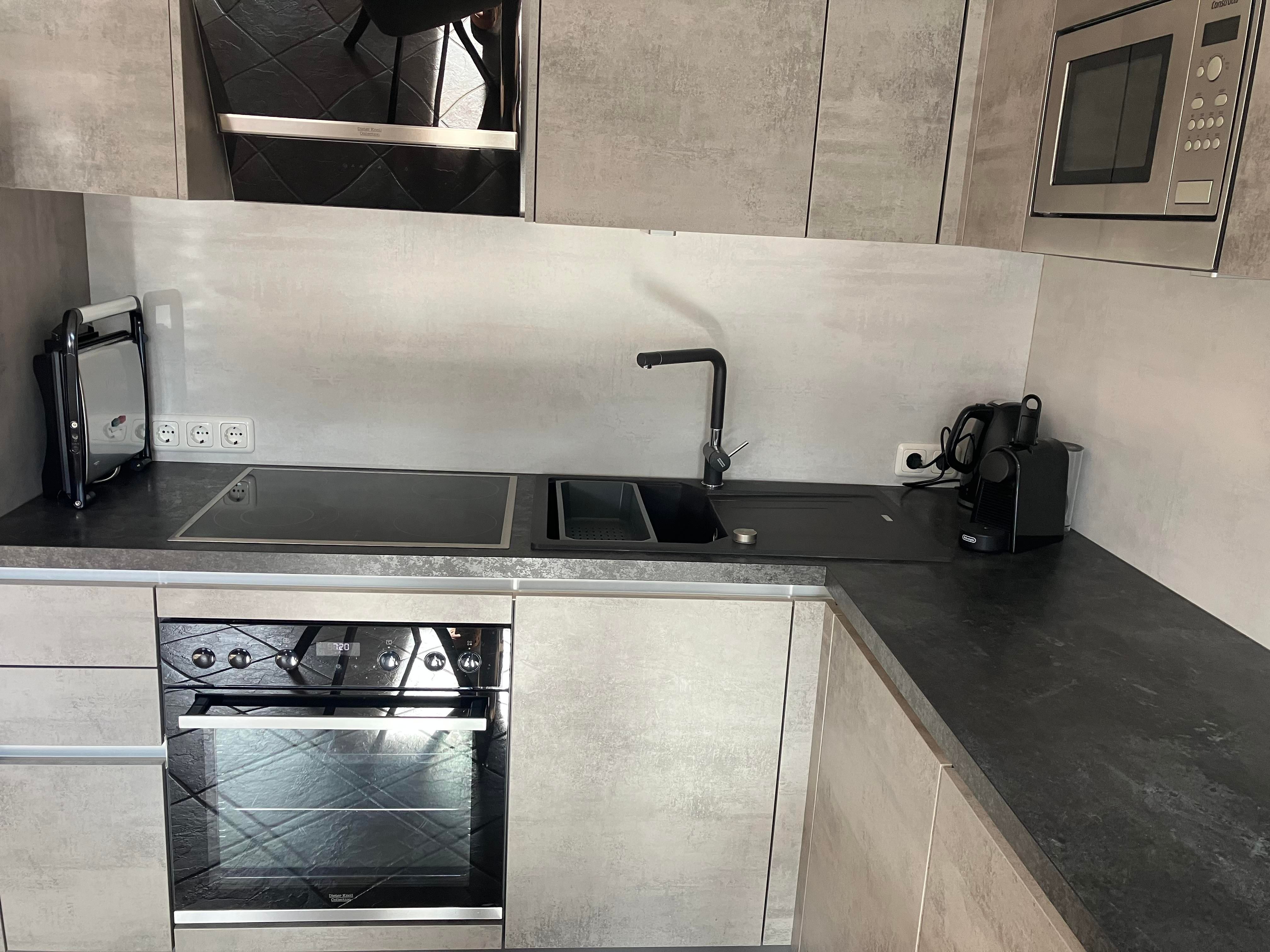 Die Wohnküche ist hochwertig ausgestattet: Ceranfeld, Backrohr, Kühlschrank, Wasserkocher, Geschirr, Reinigungsmittel und eine Senseo-Kapselmaschine.