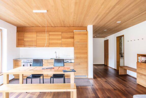 Wohnzimmer mit Couch und Essbereich - Küchenzeile mit Kühlschrank, Elektroherd, Geschirrspüler und Backrohr - 2 Schlafzimmer mit Doppelbetten - Badezimmer mit Dusche und Badewanne - Separates WC - Terrasse - TV - Kostenloser WLAN Zugang - Bettwäsche frisch für Sie bezogen - Handtücher - Geschirrtücher - komplettes Geschirr und Gläser sind vorhanden - Waschmaschine - Trockner - Fahrradabstellplatz - Schiaufbewahrungsraum - Liegestühle - pro Ferienwohnung ist ein Parkplatz vorhanden - Benützung von hauseigener Sauna, Schwimmbad und Whirlpool - Haustiere nicht erlaubt – Nichtraucherwohnung