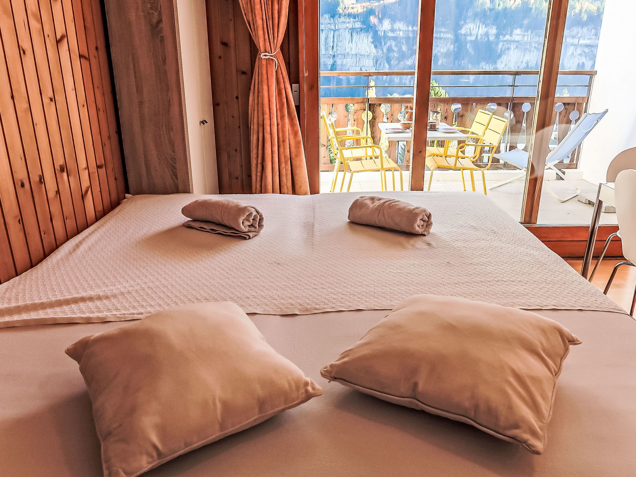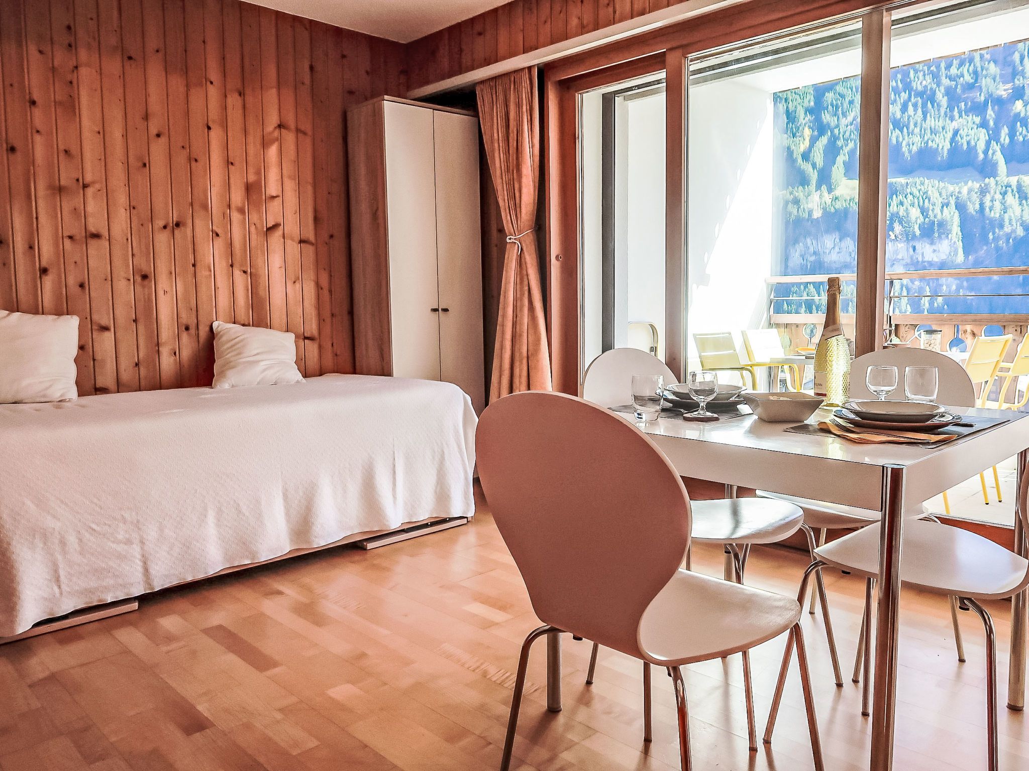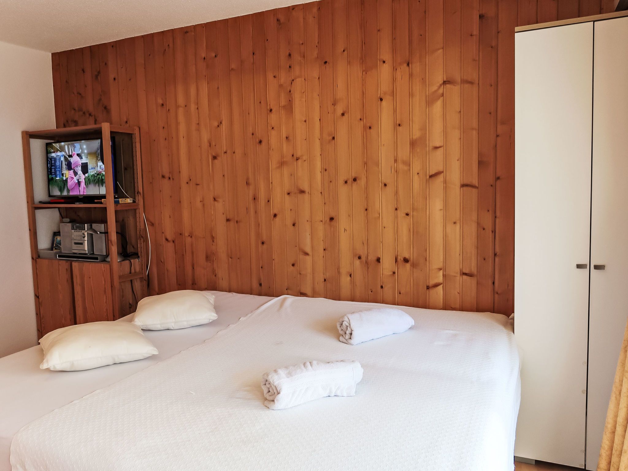 Neige et Soleil Nr 13, 1-Zimmer-Studio 40 m2 im 3. Stock, Südostlage. Zweckmässig und gemütlich eingerichtet: Wohn-/Schlafzimmer mit 1 Ausziehbett (2 Pers. 2 x 90 cm, Länge 200 cm), Kabel-TV. Ausgang zum Balkon. Offene Küche (4 Kochplatten, Backofen, Toaster, Wasserkocher, elektrische Kaffeemaschine, Kapseln für die Kaffeemaschine (Nespresso), Fondue Set (Käse)). Dusche/WC. Balkon, Südostlage. Balkonmöbel, Liegestühle (2). Schöne, auf die Berge, die Landschaft und die Ortschaft. Zur Verfügung: Internet (WLAN). Garage Nr. 24 auf dem Grundstück (1 Auto), Höhe 195 cm. Bitte beachten: Nichtraucher-Unterkunft.