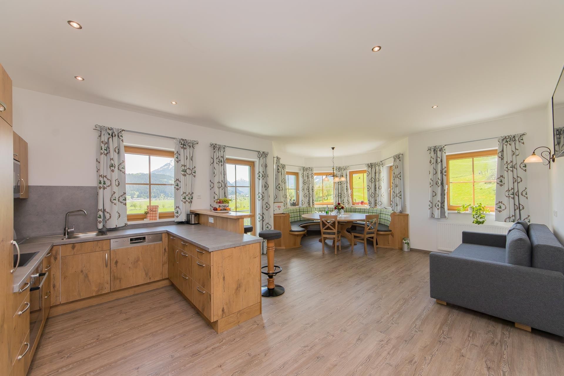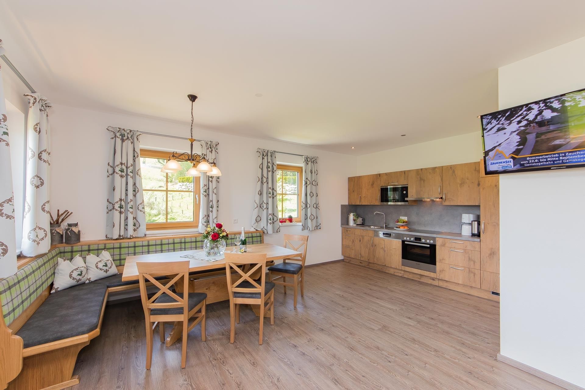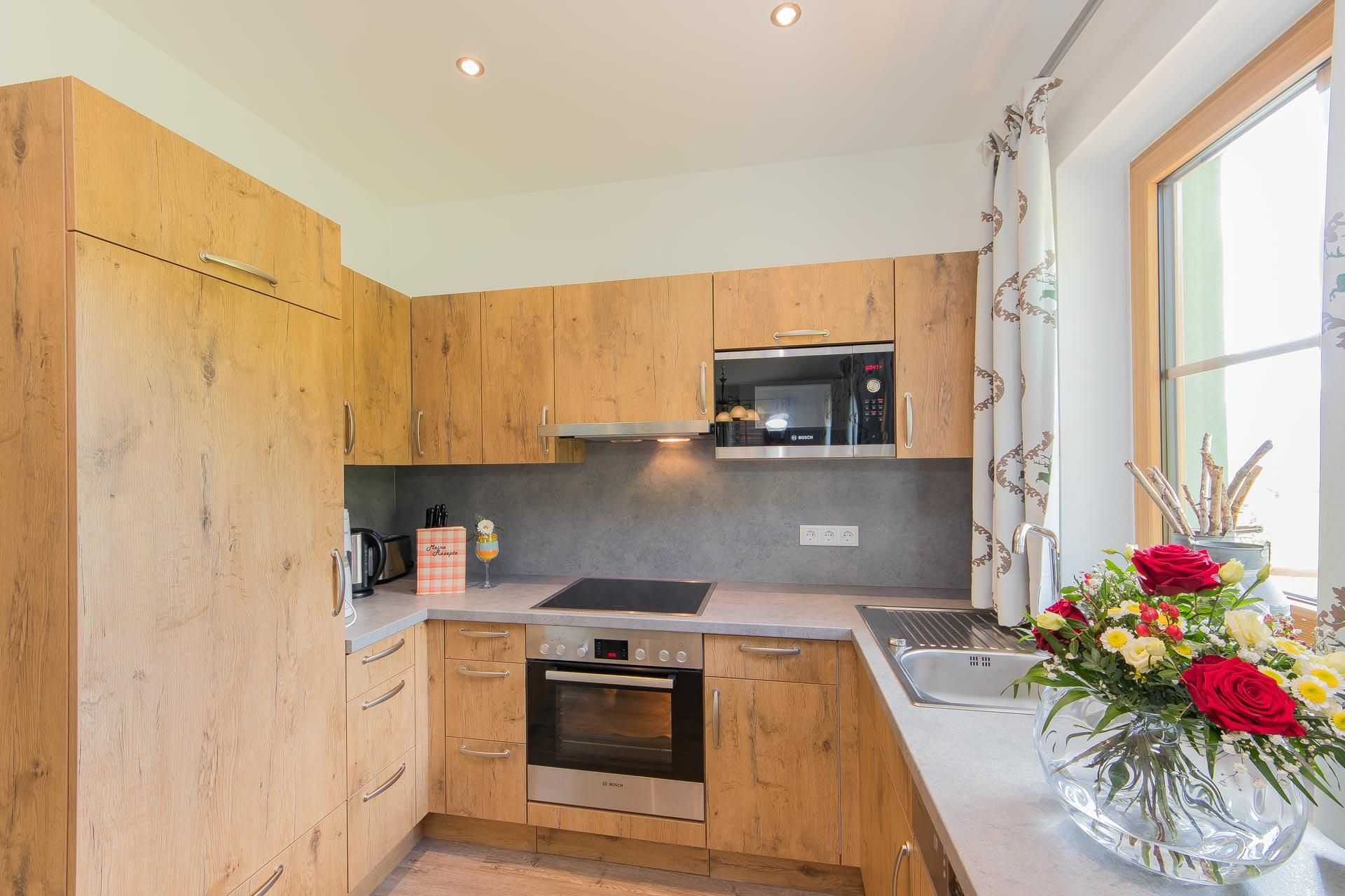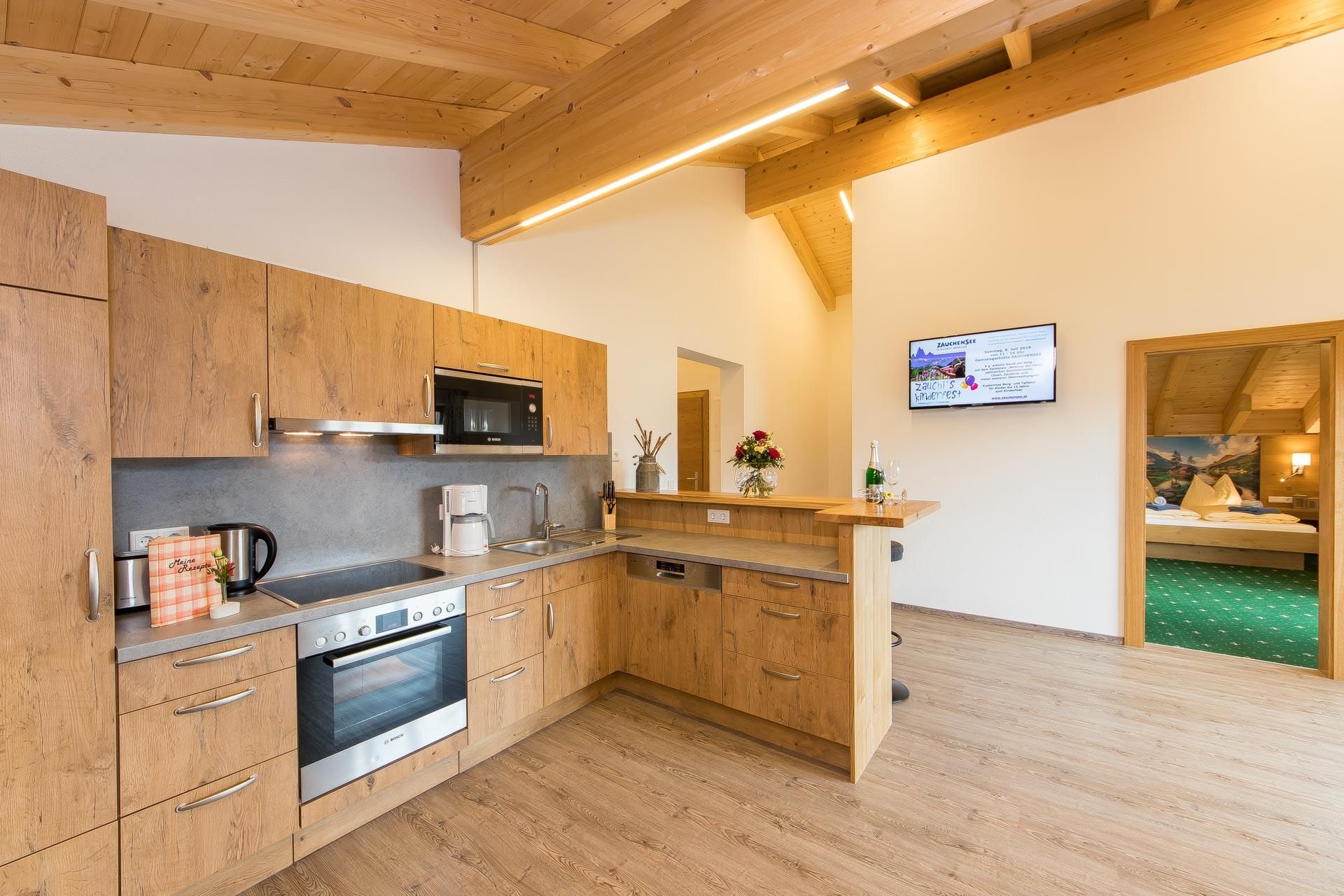 • voll ausgestattete Küche mit 4-Platten Cerankochfeld inkl. Backrohr, Geschirrspüler, Kühlschrank mit Gefrierfach, Mikrowelle, Wasserkocher, Toaster, Kaffeemaschine