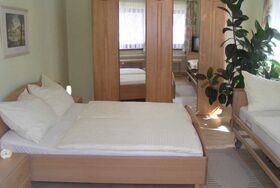 Diese 55m² Komfortferienwohnung ist barrierefrei und besteht aus einem geräumigen Schlafzimmer mit Doppelbett und Einzelbett, einer großen, komplett eingerichteten Wohnküche, einem Vorraum mit Garderobe, einem Badezimmer mit großer Duschkabine und einem vom Badezimmer getrennten WC.