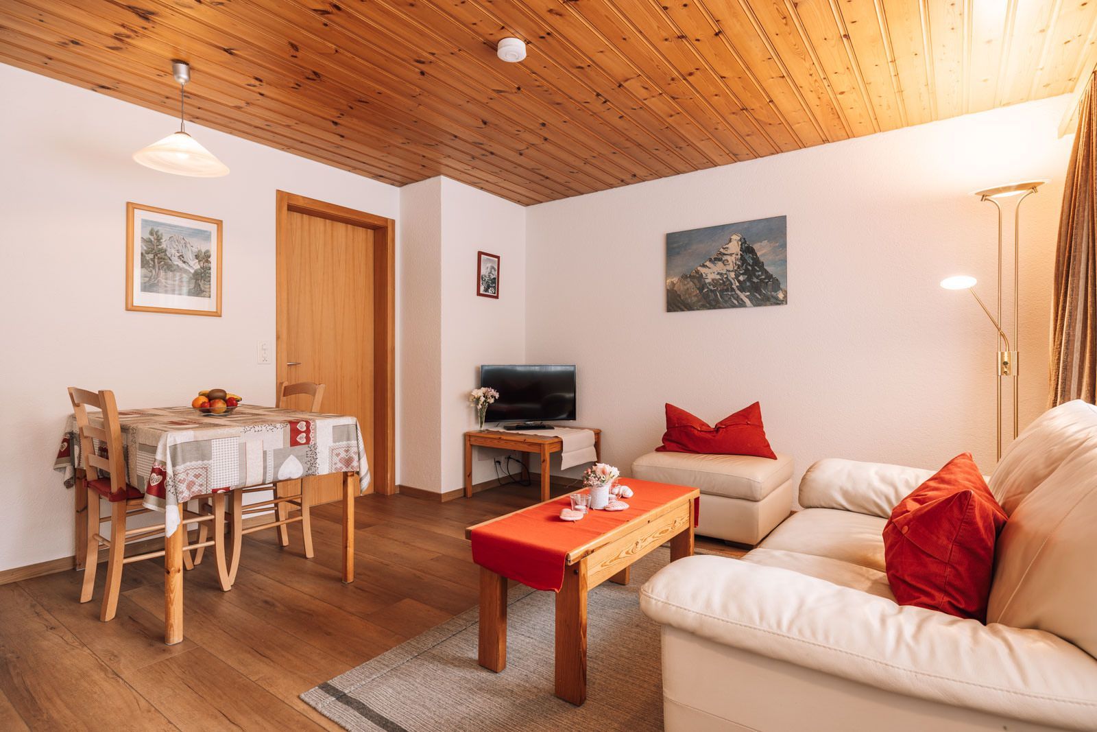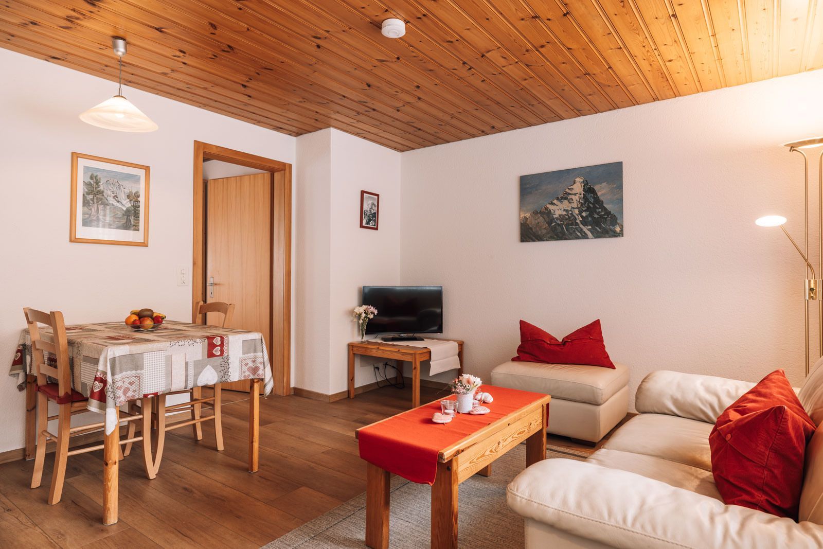 Gemütliche 2-Zimmerwohnung, 34m2. Balkon Südseite mit Sitzplatz und prachtvoller Bergsicht, Wohnküche, separates Doppelschlafzimmer. Dusche/WC, WiFi, Kabel-TV, Radio.