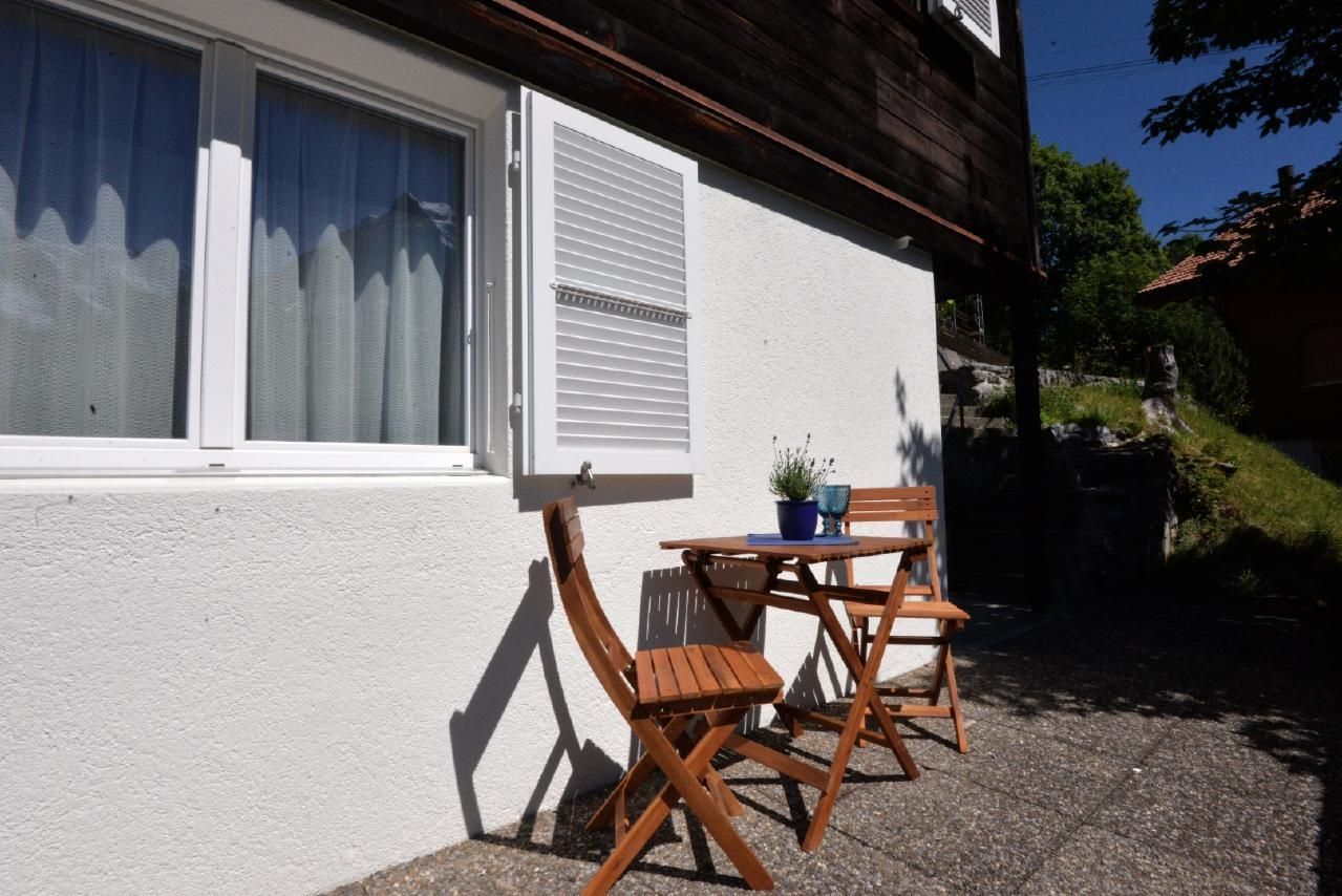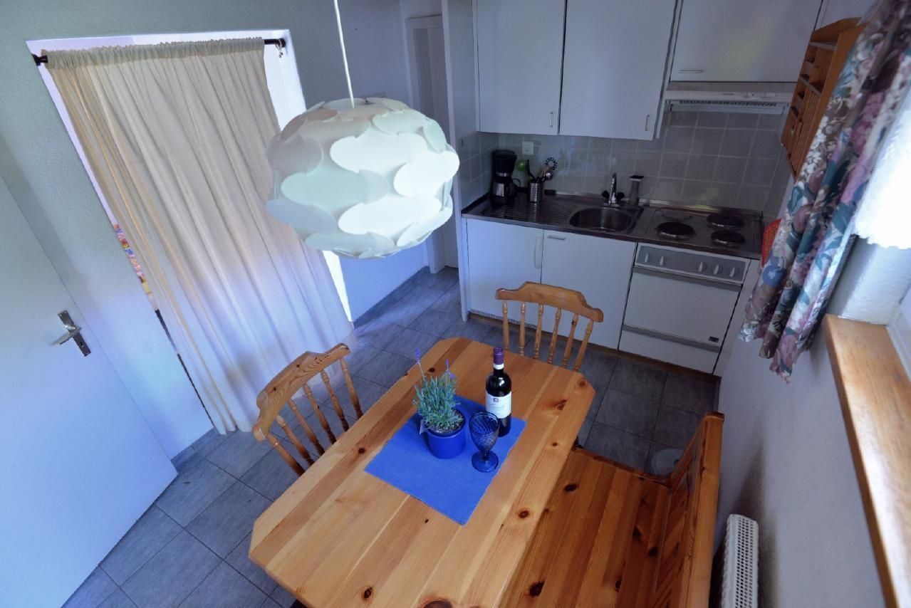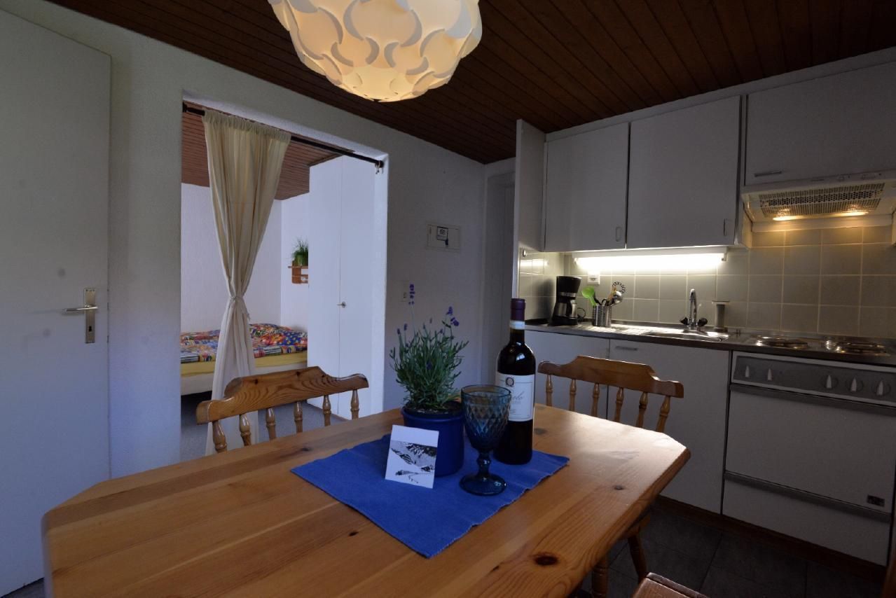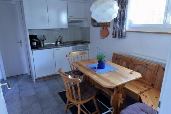 Das geräumiges Studio für 2 Personen mit privatem Eingang befindet sich im Untergeschoss des 4 Familien Haus.  Das grosse Fenster im Schlafbereich bietet Sicht auf das Bergpanorama. Das Studio ist mit einer Einbauküche , Esstisch mit Eckbank für min. 4 Personen sowie Badezimmer mit Dusche WC und Badewanne ausgestattet. Der Schlafbereich ist vom Wohnbereich durch einen Vorhang getrennt. Für ein entspanntes Frühstück sind eine Espresso Kaffeemaschine und ein Wasserkocher vorhanden. Fondue oder Racletteset stellen wir nach Nachfrage gerne zu Verfügung. Zur Unterhaltung gibt es TV und ein super schnelles Wifi kostenfrei. Genießen Sie die atemberaubende Aussicht von der Privatterrasse vor dem Studio oder auf der Gemeinschaftsterasse vor dem Haus. Saubere und gepflegte Haustiere sind, mit Voranmeldung bei uns willkommen . Alle Wohnungen im Chalet Böbs sind rauchfrei.