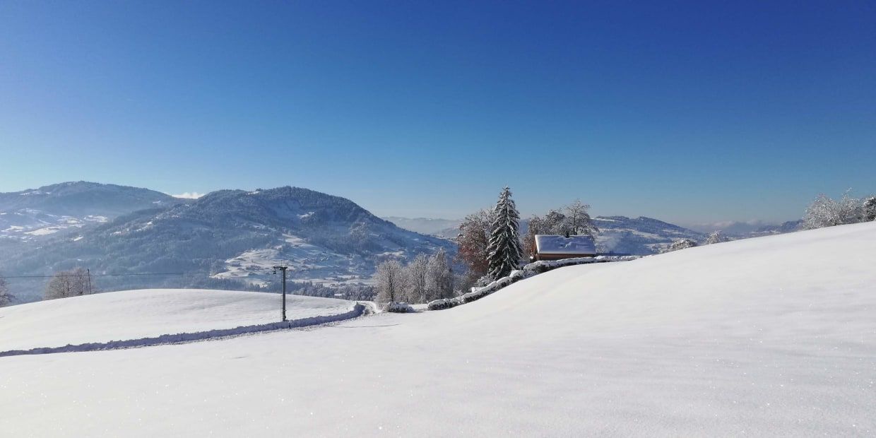Ihr zu Hause auf Zeit ist in Alleinlage, umgeben von verschneiten Feldern und Wälder. Ab und an kreuzen auch unsere freiheitsliebenden Schweine Ihren Weg, die den Schnee genauso lieben wie wir. Ein leichter natürlicher Duft unserer Tiere, die im Nebengebäude wohnen, wird Sie begleiten und Ihnen zeigen: Hier ist die Welt noch in Ordnung.