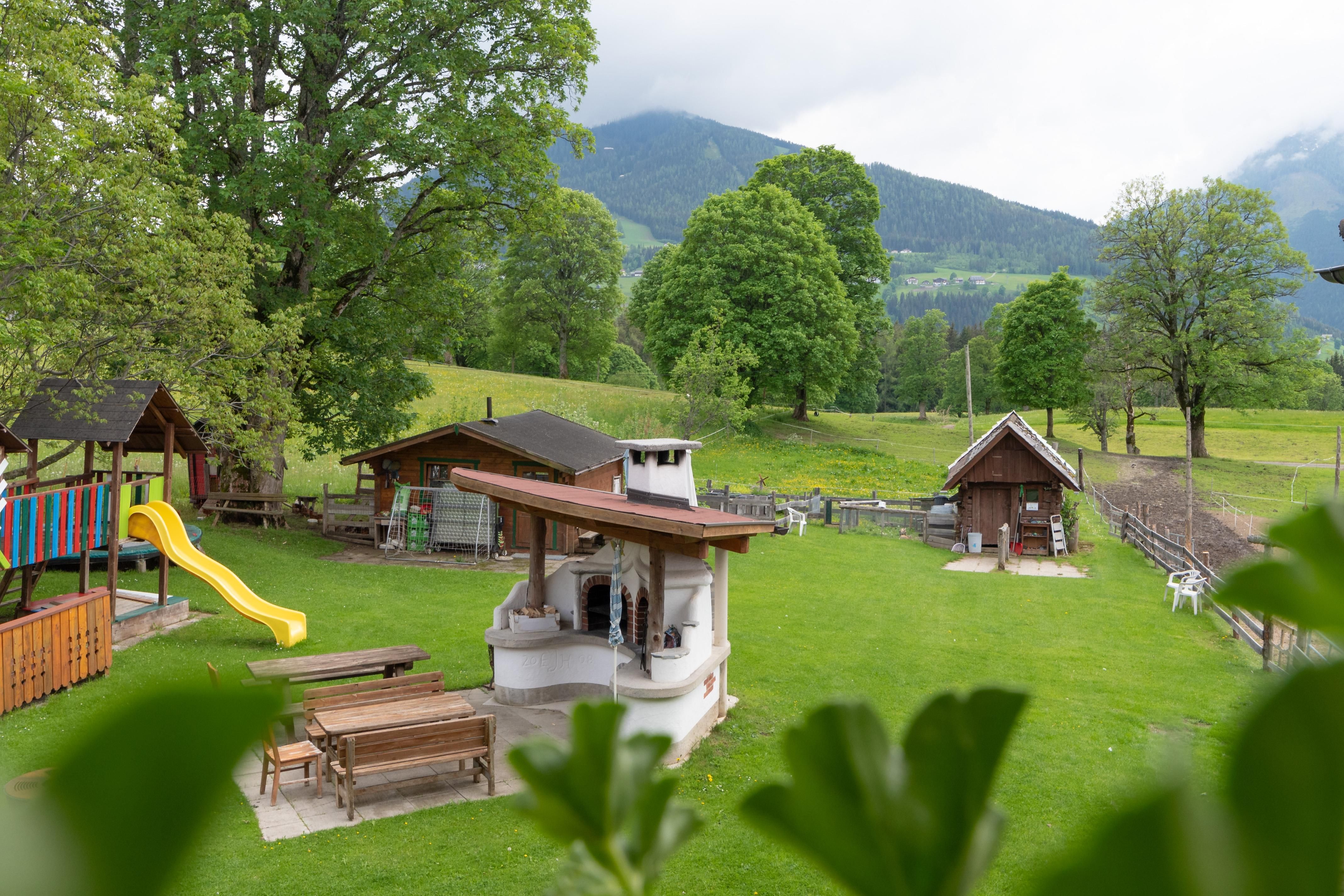 Von hier aus genießen Sie einen fantastischen Ausblick in die Bergwelt der Schladminger Tauern und auf das imposante Dachstein Massiv.