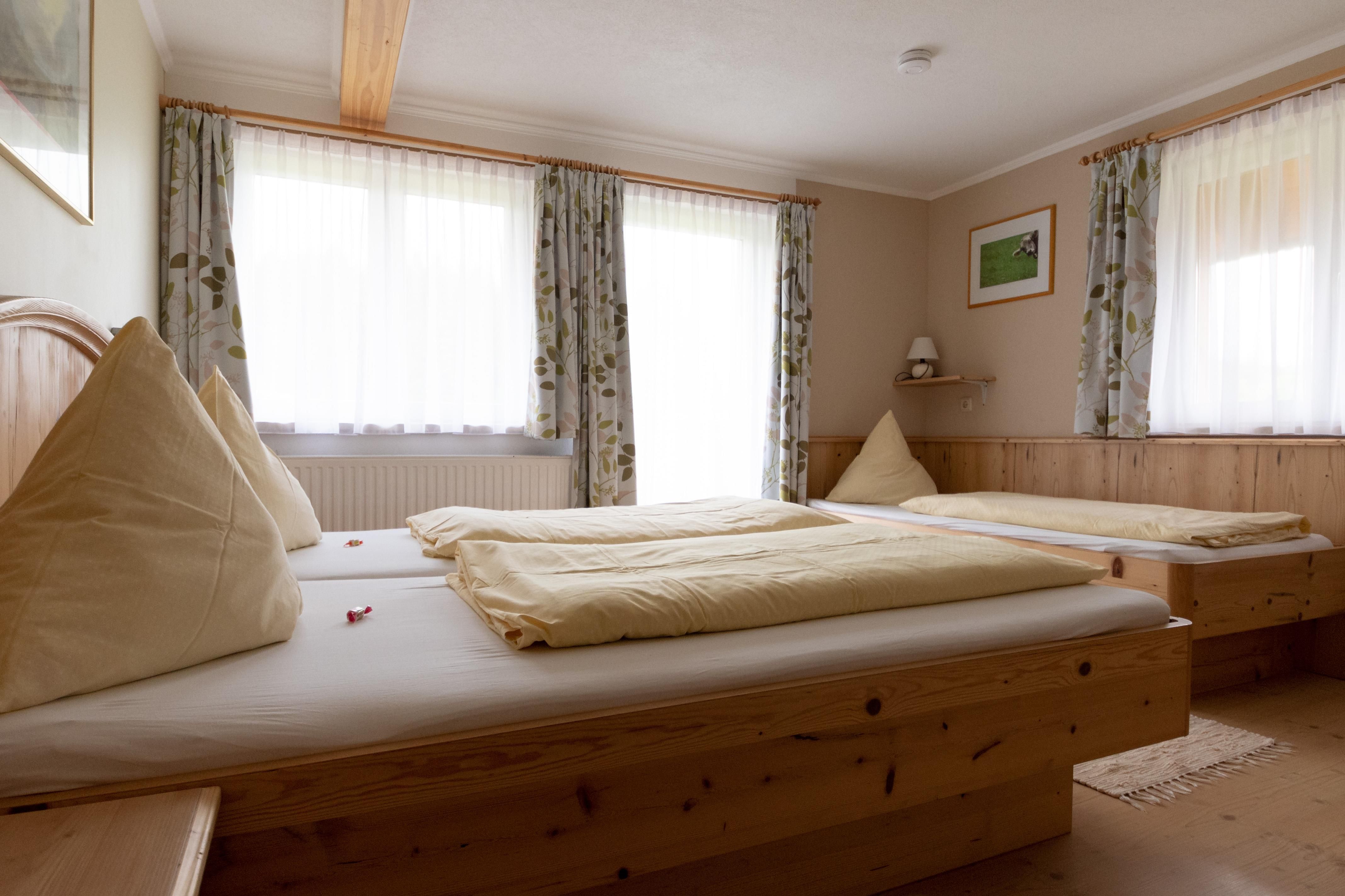 Bei uns wohnen Sie in geräumigen und hellen Doppel; Dreibett- oder Familienzimmern mit Balkon, von wo aus Sie Ihren Blick in die herrliche Ramsauer Bergwelt schweifen lassen können. Unsere Zimmer sind zum Großteil neu renoviert und laden dazu ein, sich in gemütlichem Ambiente zu entspannen. Kulinarisch verwöhnen wir Sie mit Produkten aus der eigenen Landwirtschaft mit einem reichhaltigen Frühstücksbuffet und jeden Abend, außer an Sonntagen im Sommer, mit einem herzhaft-steirischen 3- gänge Menü. Natürlich nehmen wir gerne auf Vegetarier und spezielle Diäten Rücksicht.