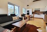 Die Wohnung bietet einen großzügigen Wohnraum mit voll ausgestatteter Küche und Esstisch, ein Schlafzimmer mit Doppelbett sowie ein zweites Schlafzimmer mit Etagenbett – das untere Bett lässt sich ausziehen und bietet so Platz für eine dritte Person.