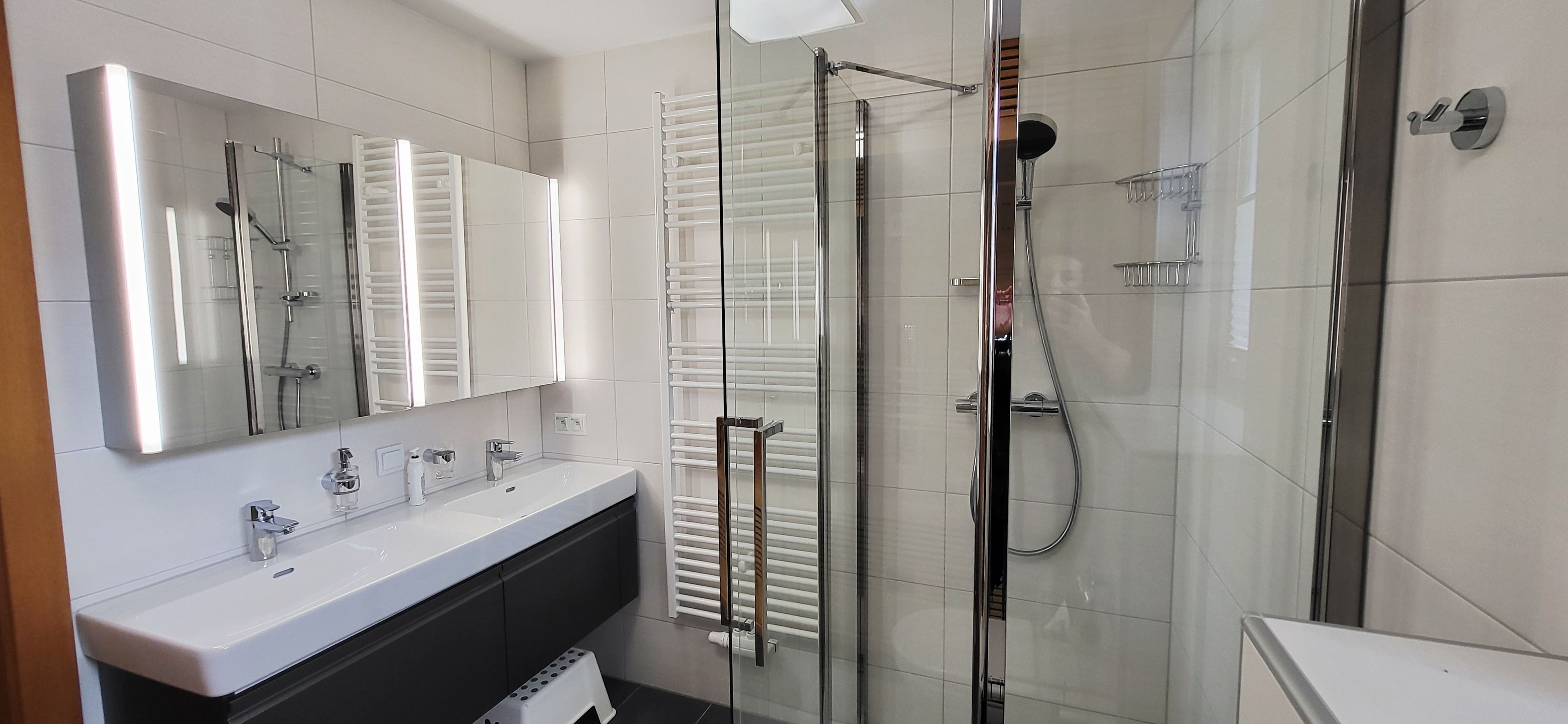 Im modernen Badezimmer stehen Ihnen eine Dusche, ein WC und eine eigene Sauna zur Verfügung – ideal zum Entspannen nach einem erlebnisreichen Tag in den Bergen.