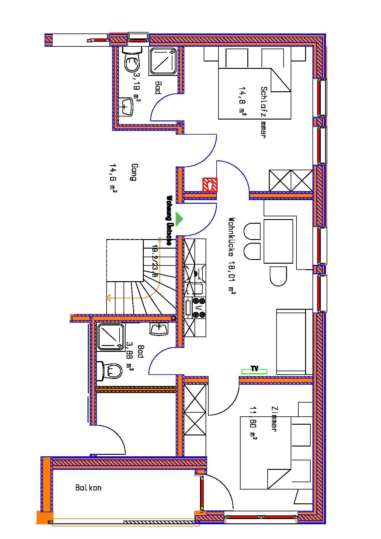 Zwischen den beiden Wohnungen ist ein kleiner Balkon mit Sitzgelegenheit, für beide Wohnungen zusammen.