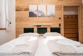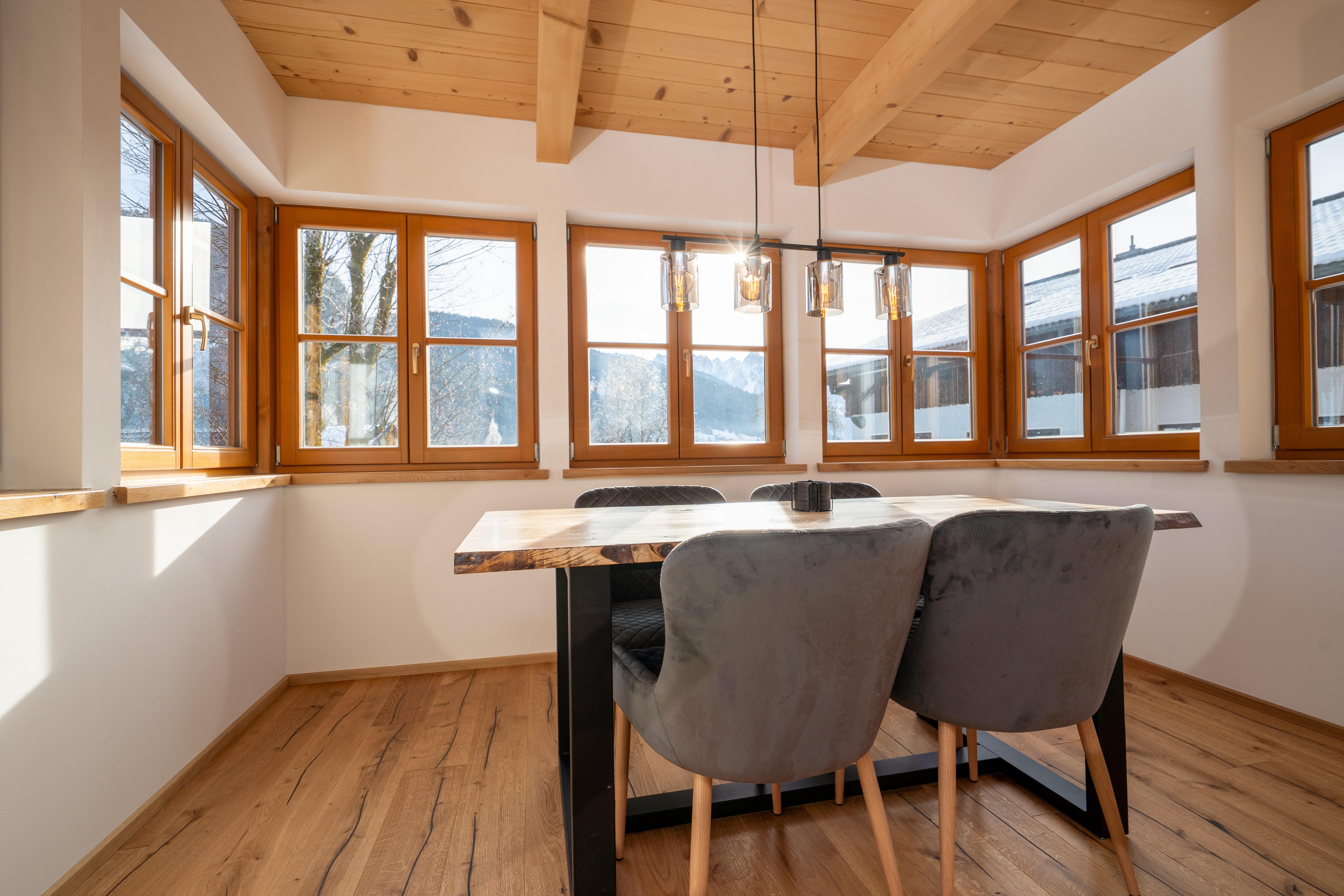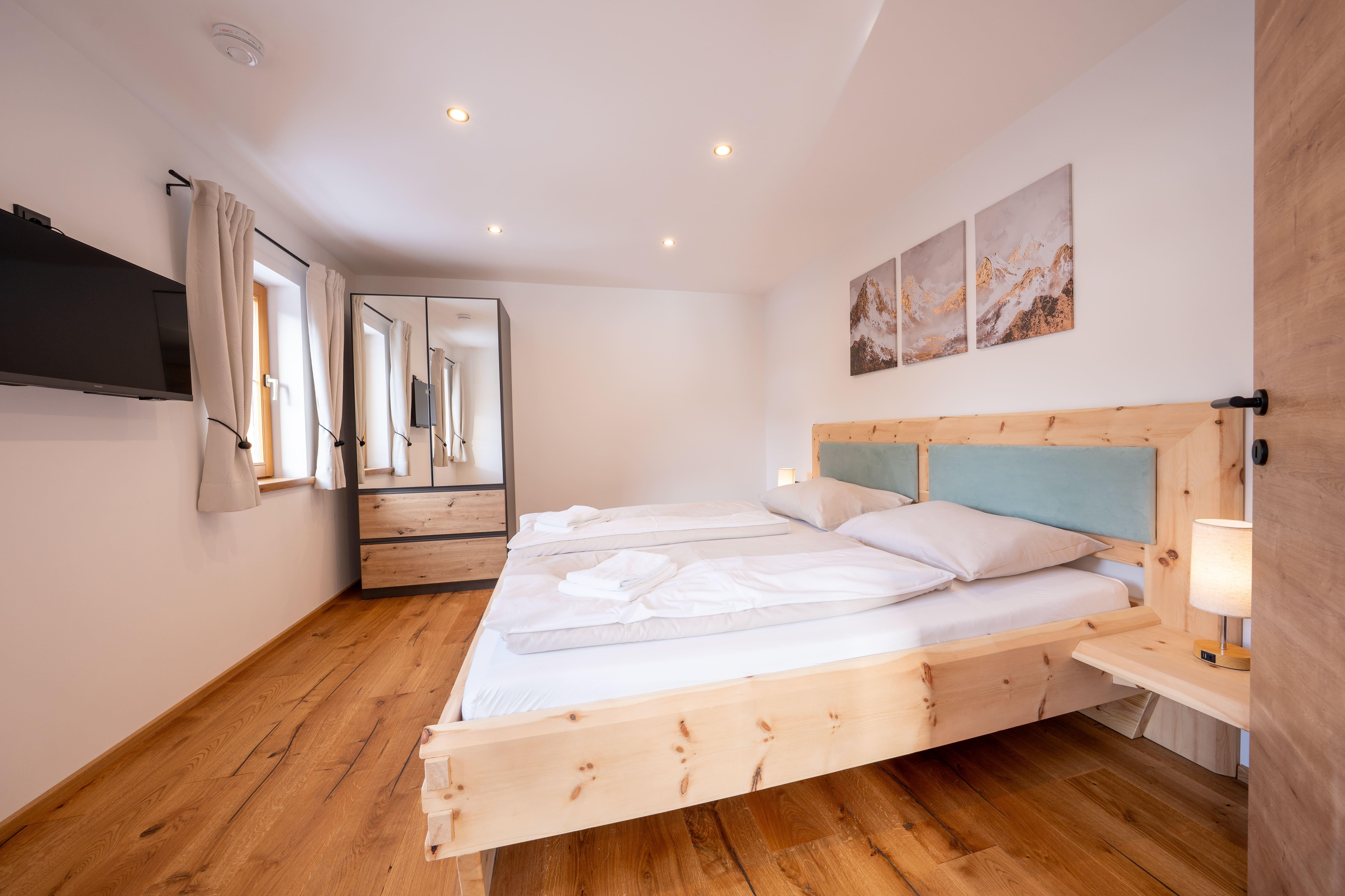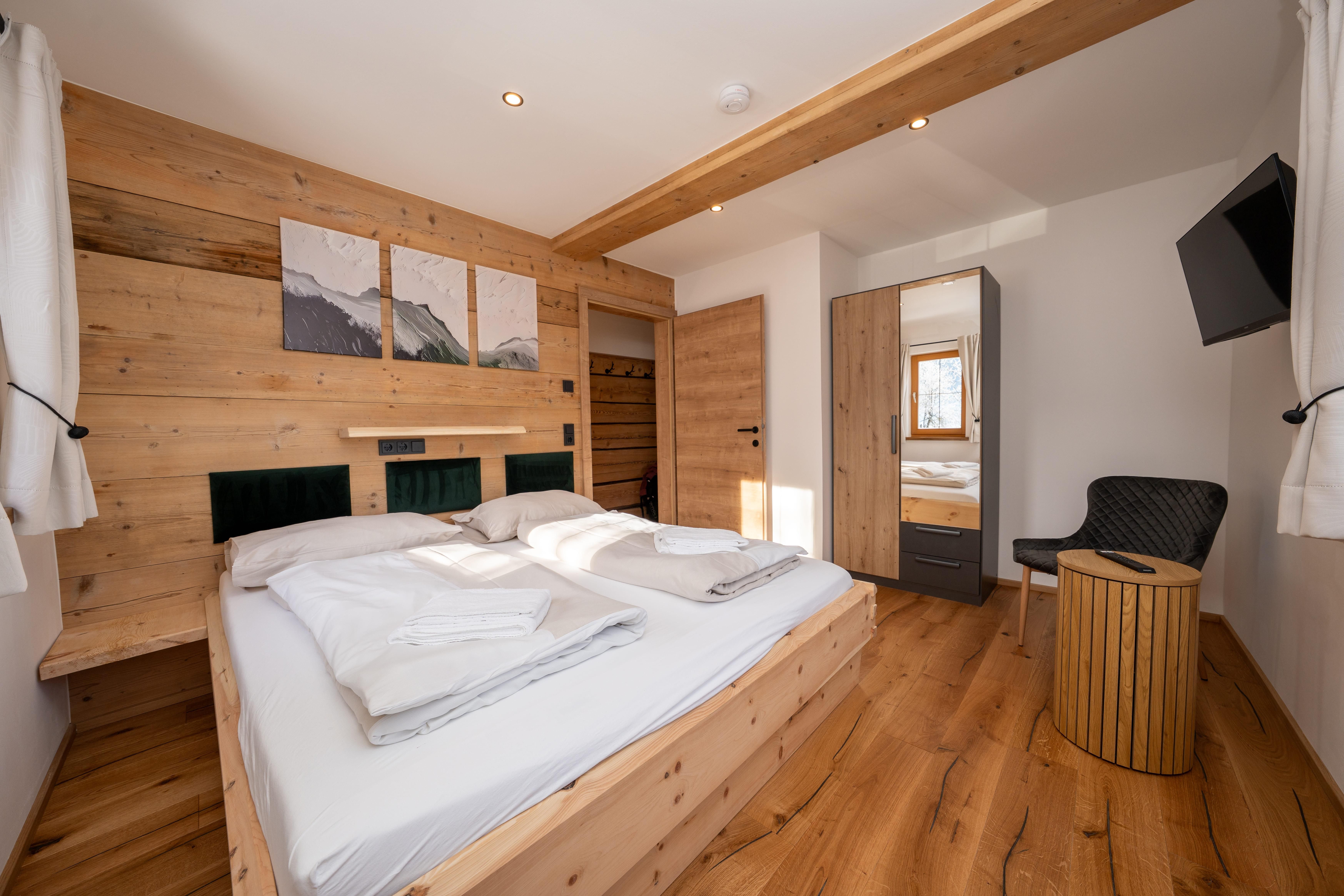Die frisch renovierte Gosaukamm Suite verbindet modernes Design mit alpinem Flair. Auf 71 m² bietet sie Platz für bis zu 4 Personen in zwei Schlafzimmern mit Doppelbetten. Die Suite verfügt über ein voll ausgestattetes Badezimmer mit Dusche und Badewanne, eine moderne Küche sowie ein gemütliches Wohn- und Esszimmer. Sie bietet einen herrlichen Blick auf Berge, Wald und Wiesen sowie Zugang zum Gemeinschaftsgarten. Fußbodenheizung und ein eigener Skischuhtrockner im Eingangsbereich runden die Ausstattung ab.