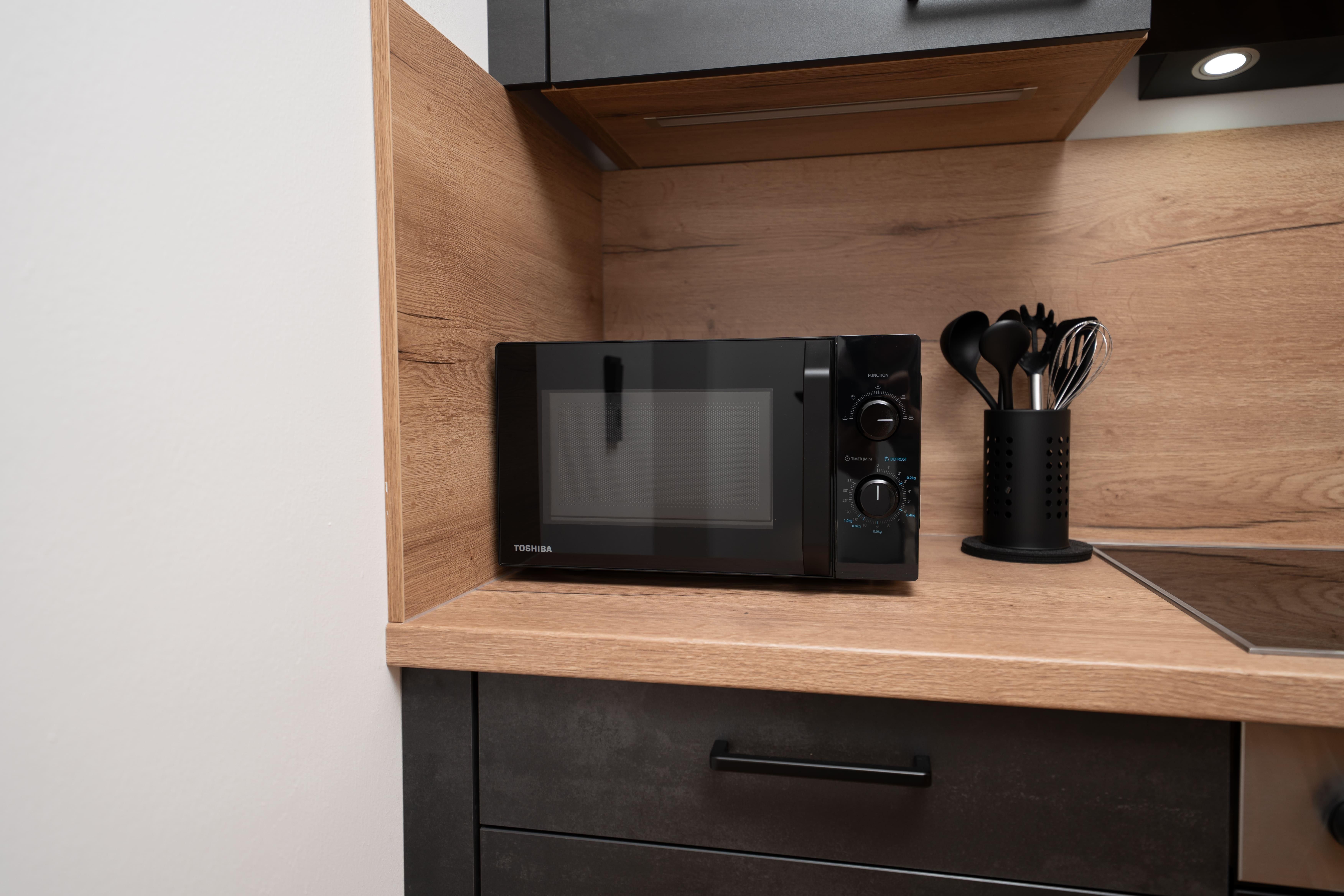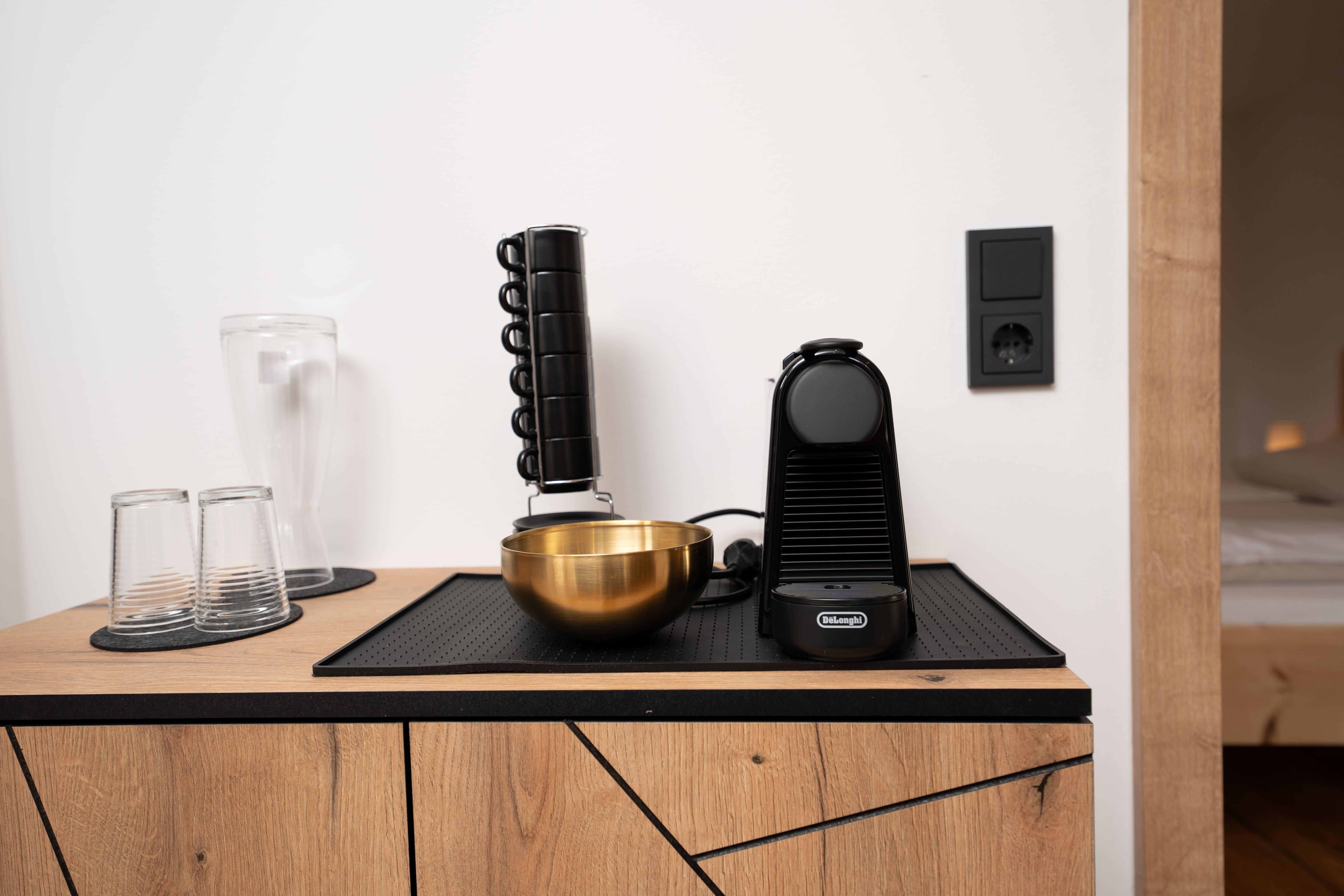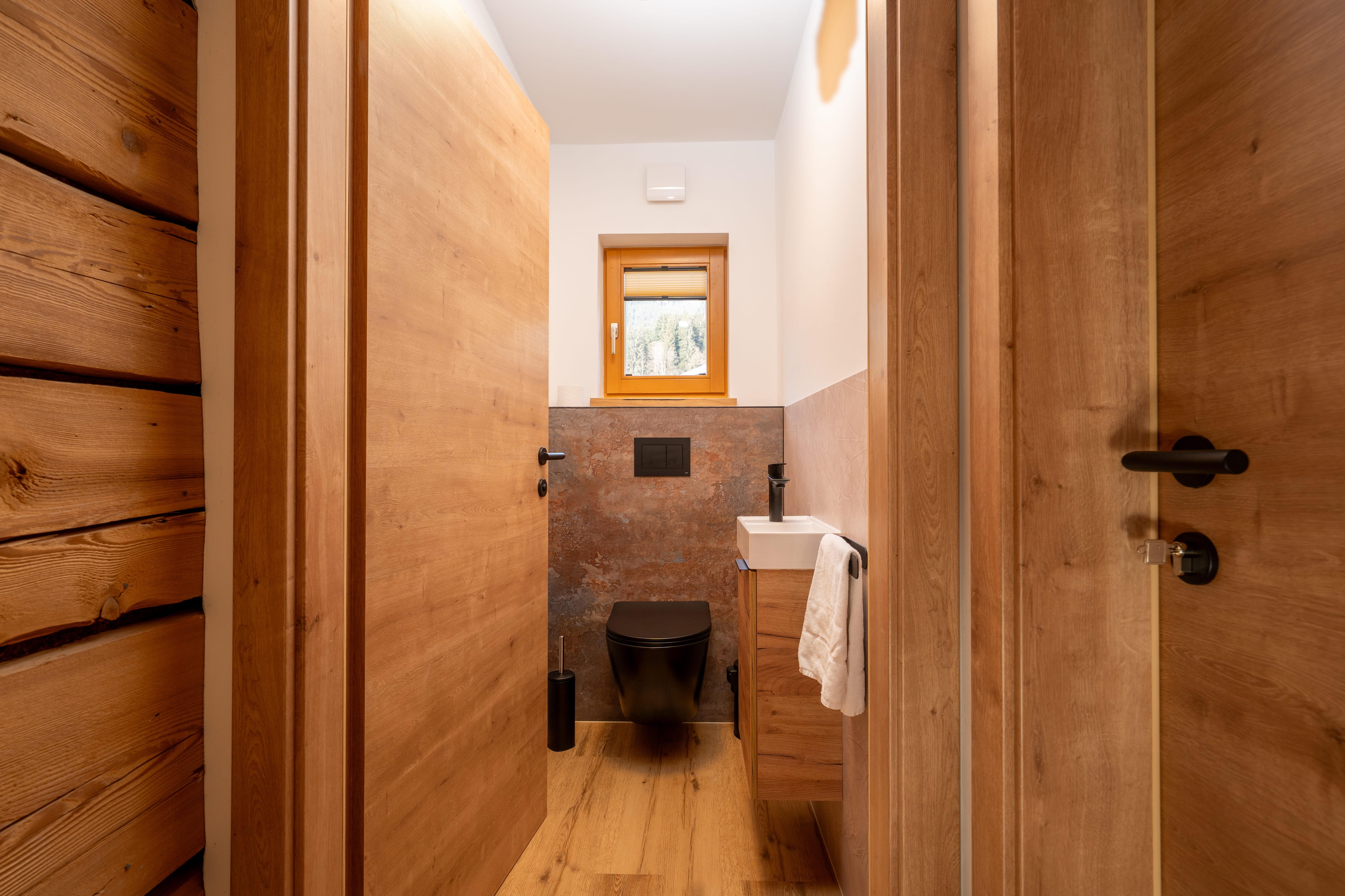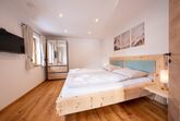 Charaktervolle Holzelemente schaffen eine warme Atmosphäre: Das Zirbendoppelbett sorgt für erholsamen Schlaf, und der handgefertigte Eichen-Esstisch lädt zu geselligen Momenten ein. Im Badezimmer setzt eine restaurierte Werkbank aus dem Jahr 1920 mit modernen Steinbecken einen besonderen Akzent.