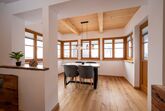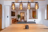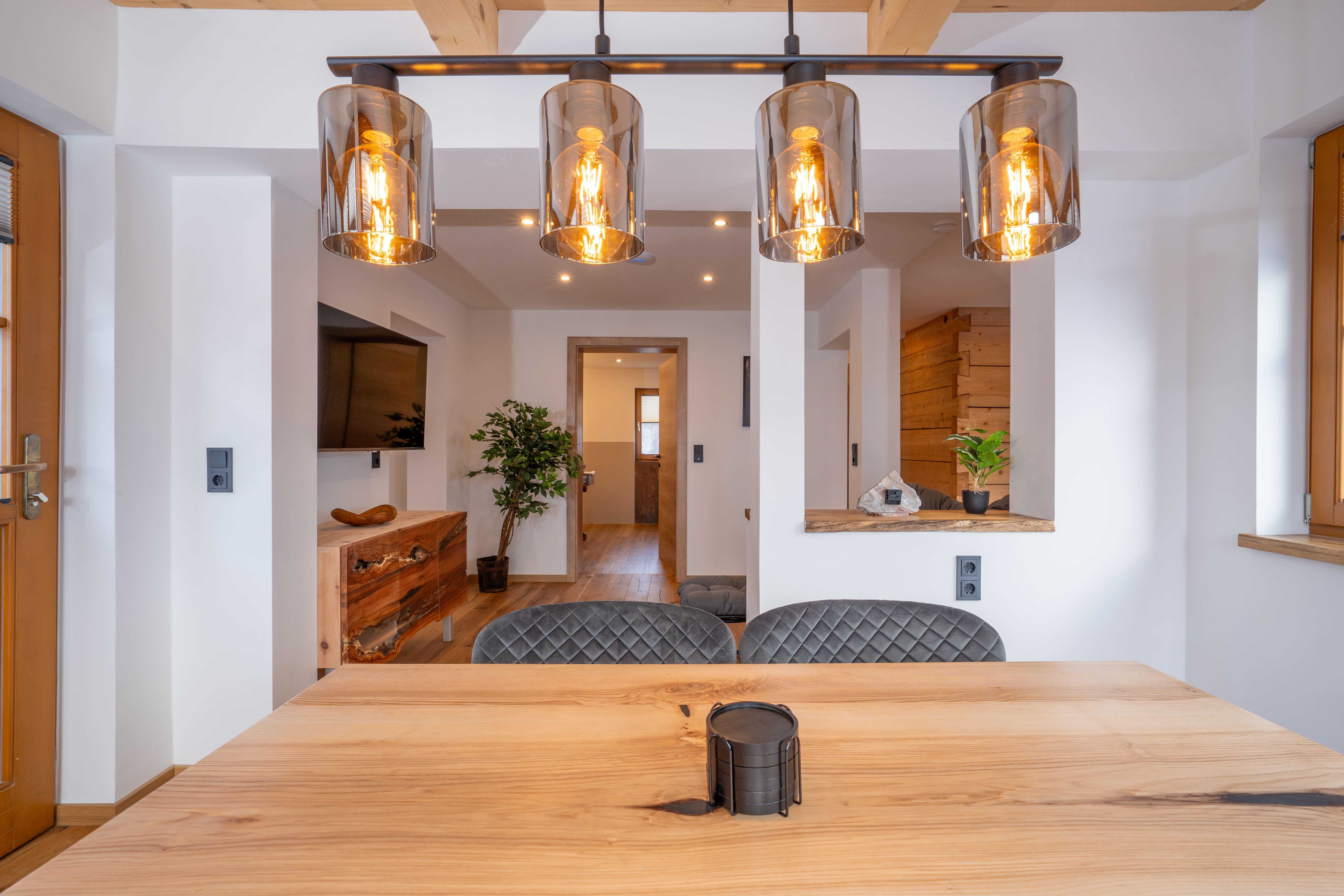 Charaktervolle Holzelemente schaffen eine warme Atmosphäre: Das Zirbendoppelbett sorgt für erholsamen Schlaf, und der handgefertigte Eichen-Esstisch lädt zu geselligen Momenten ein. Im Badezimmer setzt eine restaurierte Werkbank aus dem Jahr 1920 mit modernen Steinbecken einen besonderen Akzent.
