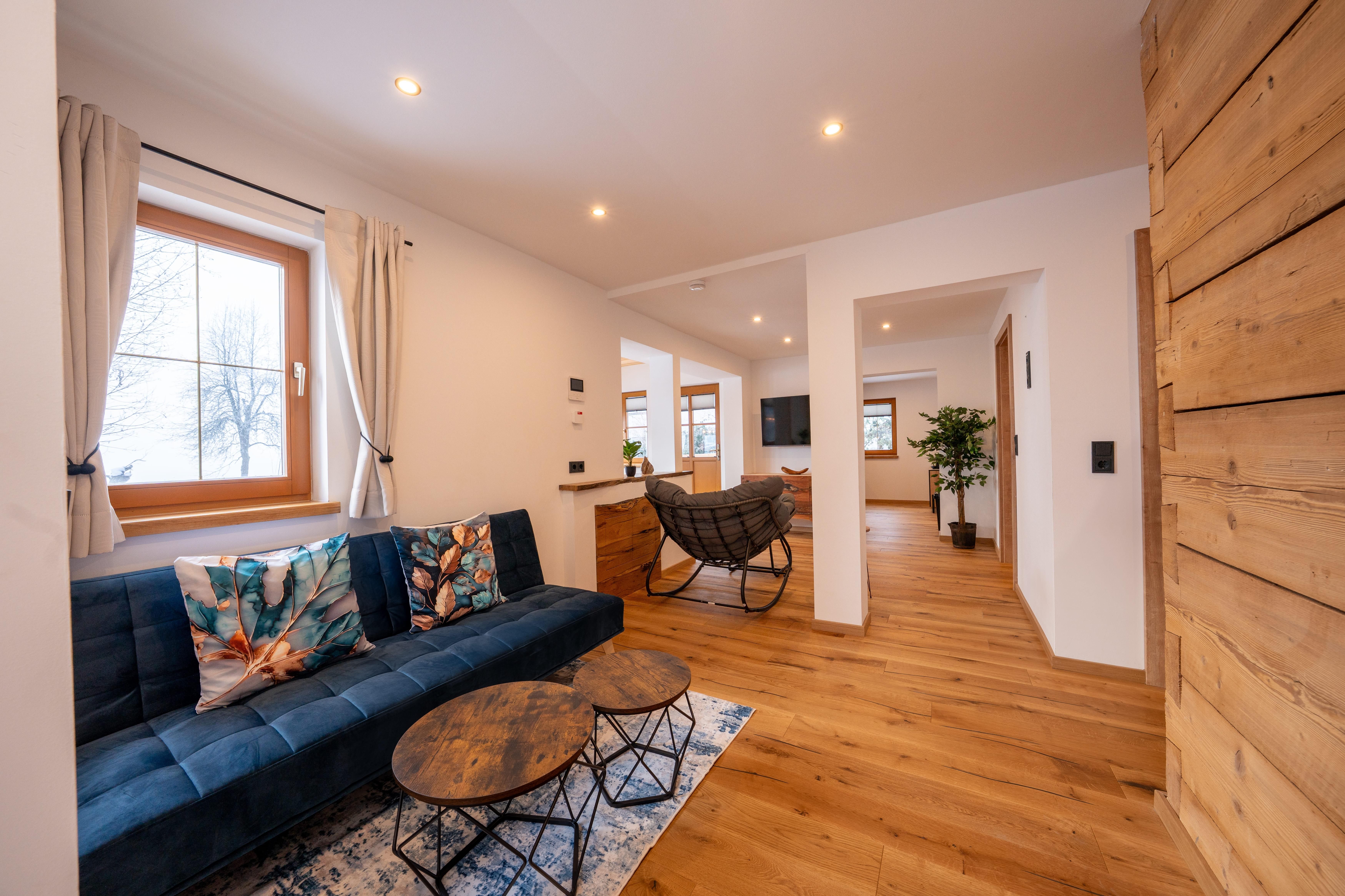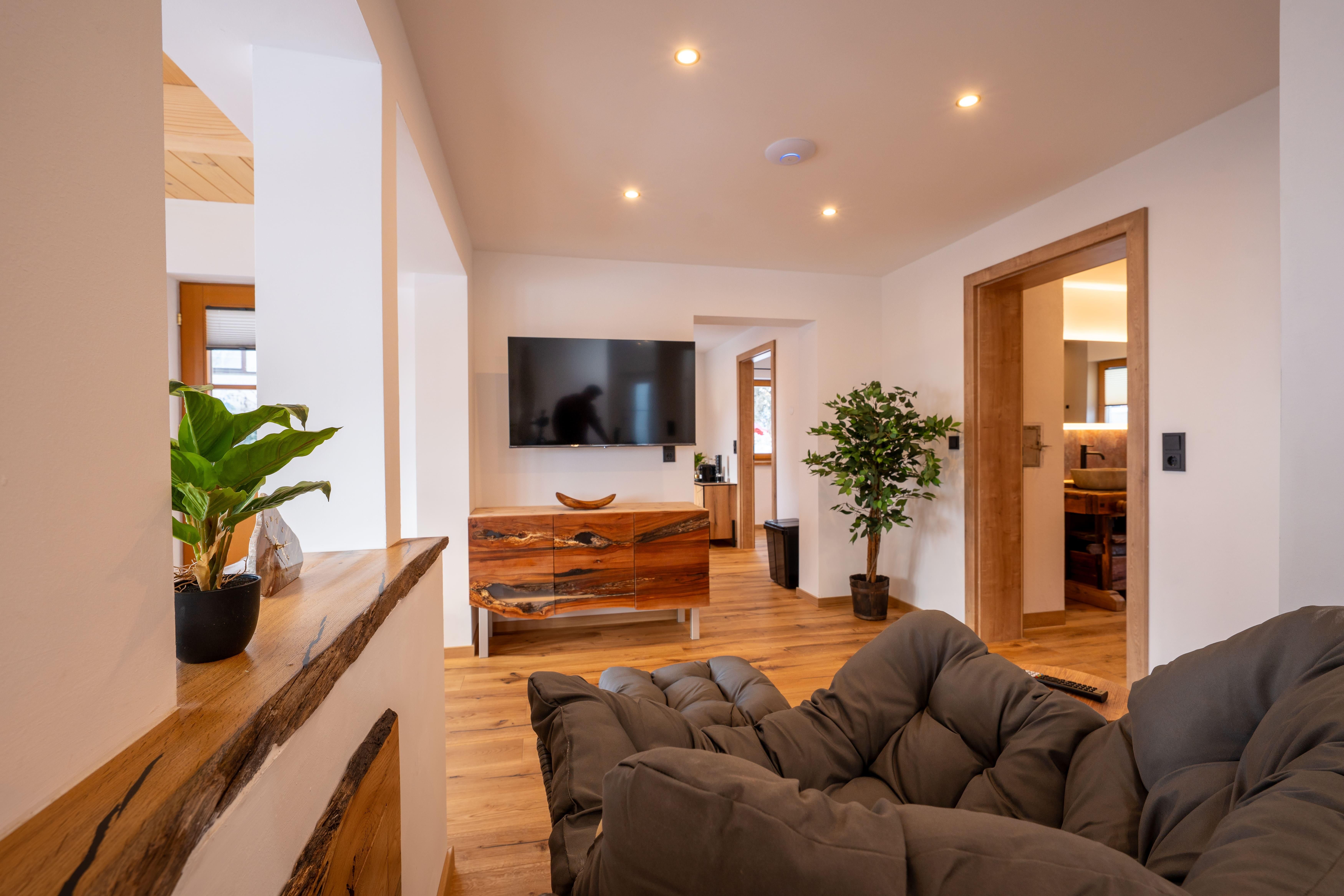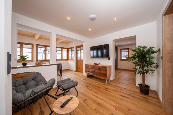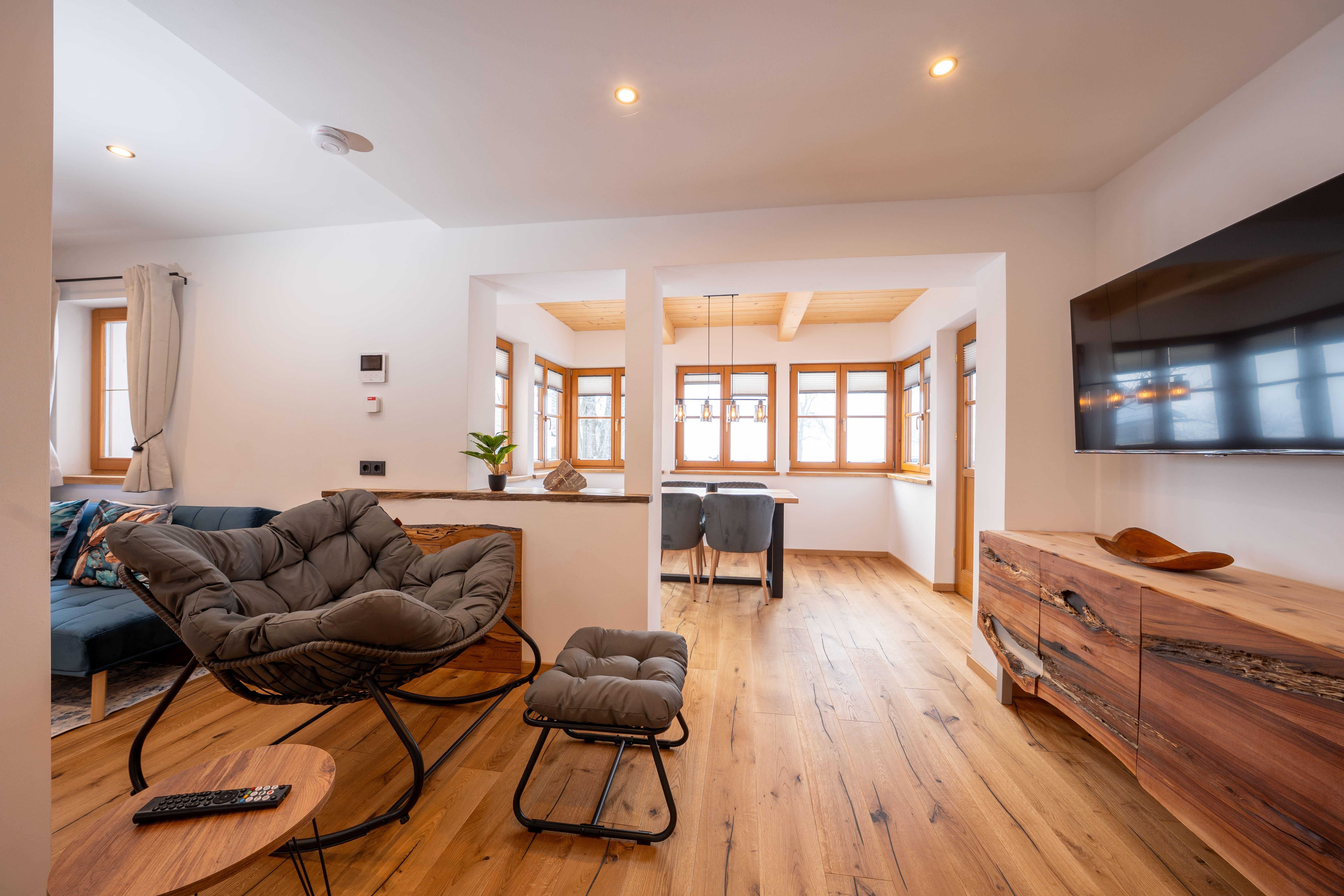 Das frisch renovierte Apartment Holzklang im Erdgeschoss verbindet modernes Design mit alpinem Flair. Auf 64 m² bietet es Platz für bis zu 4 Personen. Ein Zirbendoppelbett und ein handgefertigter Eichen-Esstisch sorgen für gemütliches Ambiente. Im Bad setzt eine restaurierte Werkbank von 1920 mit Steinbecken einen besonderen Akzent. Zur Ausstattung gehören Wintergarten, Terrasse mit Gartenzugang, Fußbodenheizung und ein eigener Skischuhtrockner im Eingangsbereich.