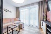 Der Wohnbereich ist mit einer Doppelausziehcouch (Schlafmöglichkeit für die 3. und 4. Person), Essbereich und Satelliten-TV 49 (Smart TV mit Internetanschluss) ausgestattet, der Schlafbereich mit modernem Boxspringbett und das Badezimmer mit Dusche und WC. Die Küche verfügt über: Kühlschrank, Gefrierschrank, Kaffeemaschine, Mikrowelle, Sodastream, Wasserkocher, Spülmaschine, Backofen, Cerankochfeld, Toaster und Eierkocher. Das Schlafzimmer hat einen Safe, eine Steckdose in Bettnähe (als USB Steckdose) und Badezimmer einen Haartrockner. Das Studio besitzt eine grosszügige Terrasse und einen privaten Parkplatz.