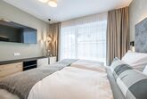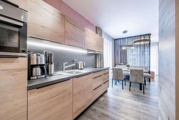 Unsere Lodge 3 verfügt über zwei Schlafzimmer mit modernen Boxspringbetten (Härtegrad der Matratzen je nach Wunsch einstellbar) inklusive indirekter Beleuchtung, Steckdosen in Bettnähe (als USB Steckdosen), sowie Satelliten-TV 49 (Smart TV mit Internetanschluss) und Safe, zwei Bäder mit Infrarotdpaneel in der begehbaren Dusche und Haartrockener, sowie einer Wohnküche mit einer Doppelausziehcouch (Schlafmöglichkeit für die 4. und 5. Person) eine Küche im kombinierten Wohn- & Essbereich und folgender Ausstattung: Kühlschrank inklusive Gefrierfach, Kaffeemaschine, Mikrowelle, Sodastream, Wasserkocher, Spülmaschine, Backofen, Ceranfeld-Herdplatte, Toaster und Eierkocher. Außerdem Balkon und 2 private Parkplätze.
